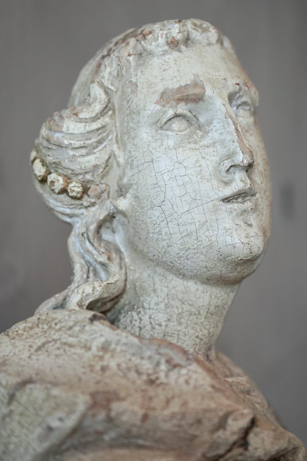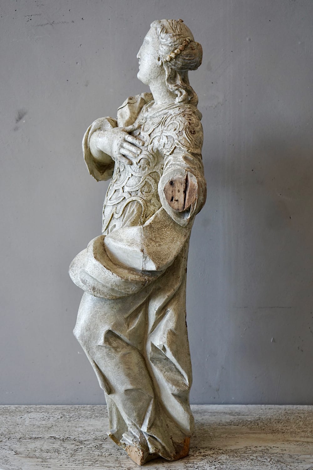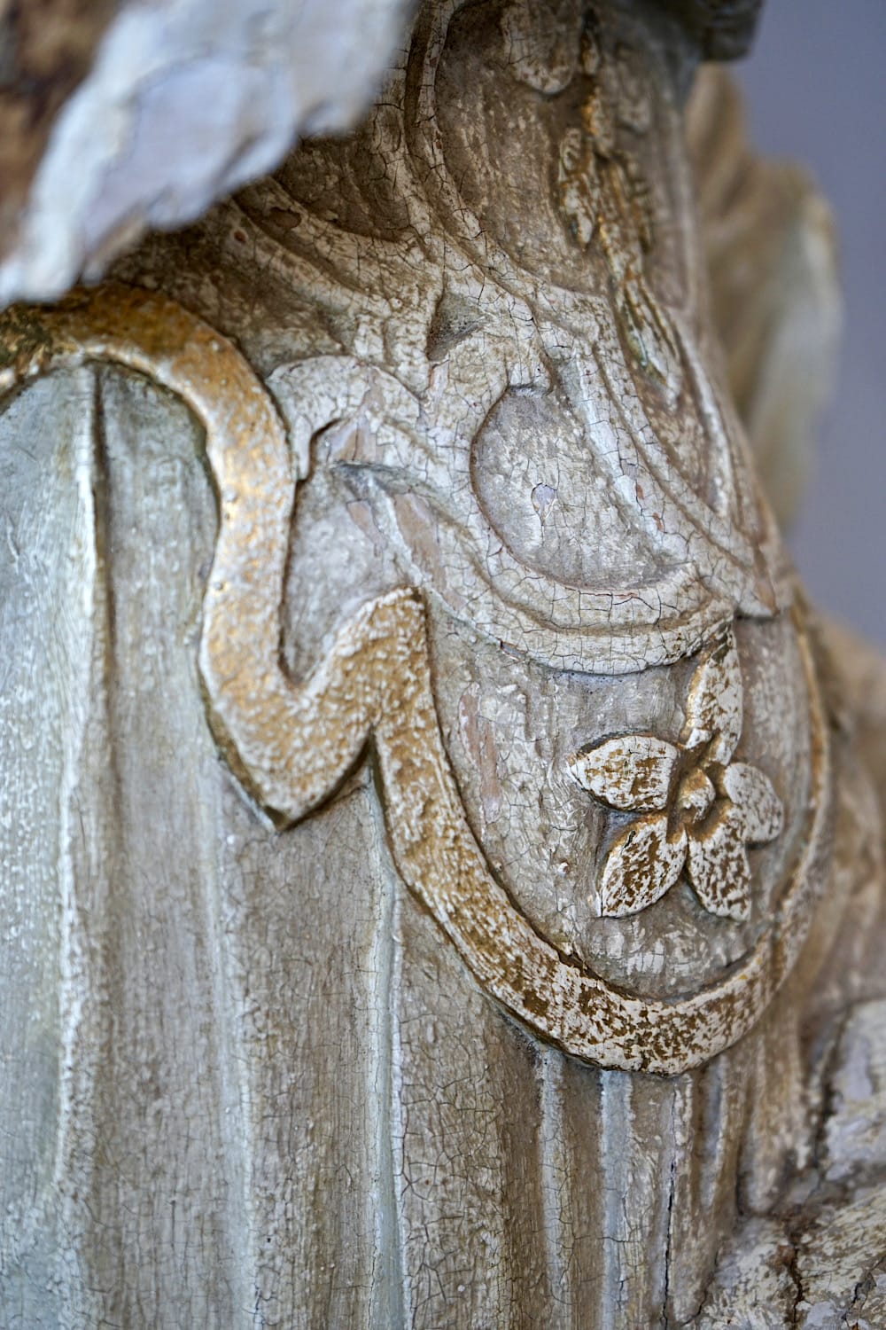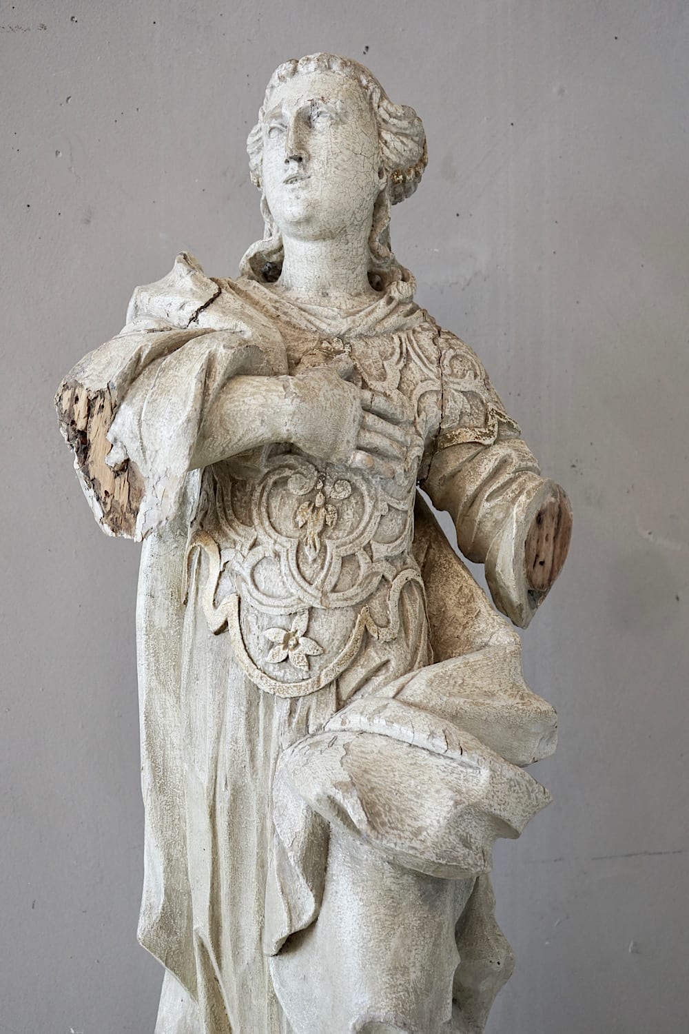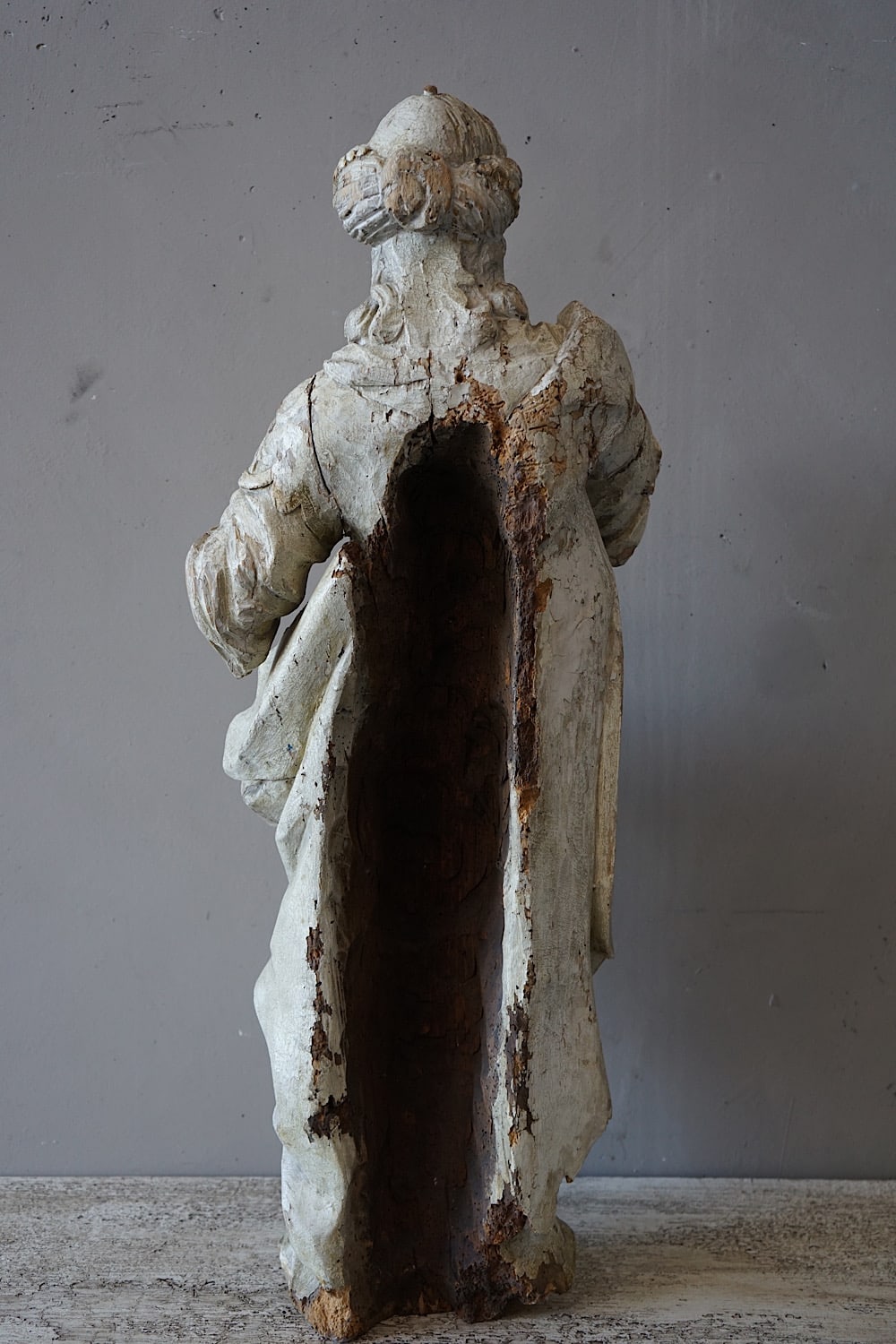 A rare and impressive early-18th century carved wooden statue of a saint in flowing robes. Original white paint and gilding showing good patina. A highly decorative piece in good original condition.
