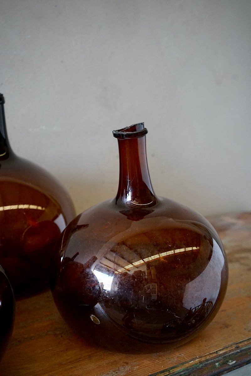 A collection of hand-blown amber glass wine carboys from northeast France. Sold separately.