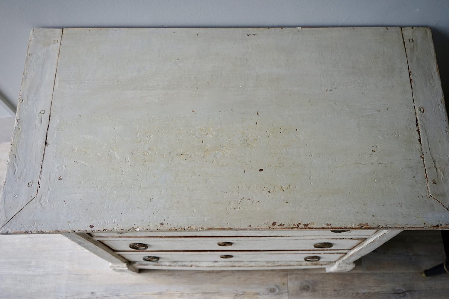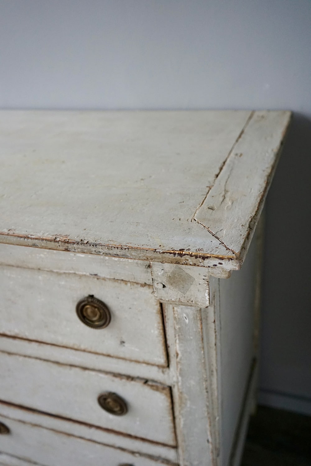 An elegant Directoire style commode of smaller proportions painted in soft grey patina. Simple pilasters at each end and circular handles and escutcheons.