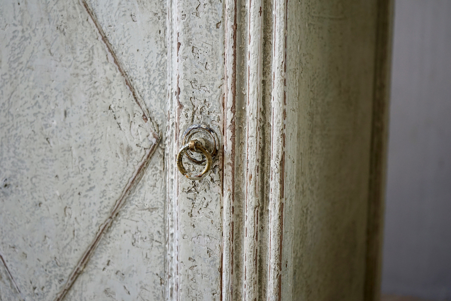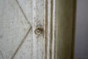 A pair of elegant Directoire style bedside cabinets painted in soft off white/grey patina with faux marble painted tops. Lovely geometric neoclassical carved detail including lozenges & fluted pilasters. Priced and sold as a pair.