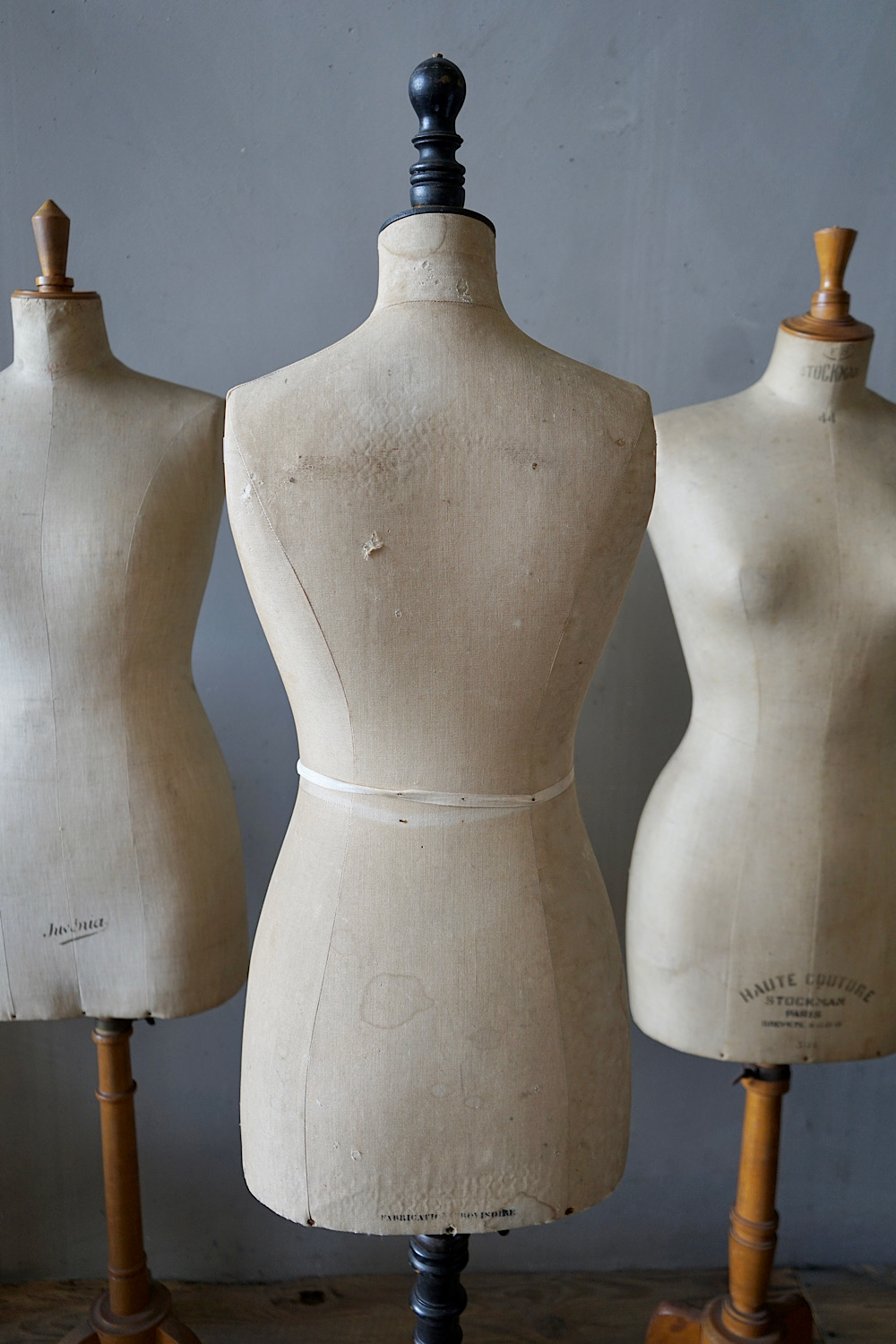 Three tailor’s dummies in good condition, all stamped with the Pairs maker’s marks. Linen covered busts on a beechwood bases, the centre one with original black ebonised finish.