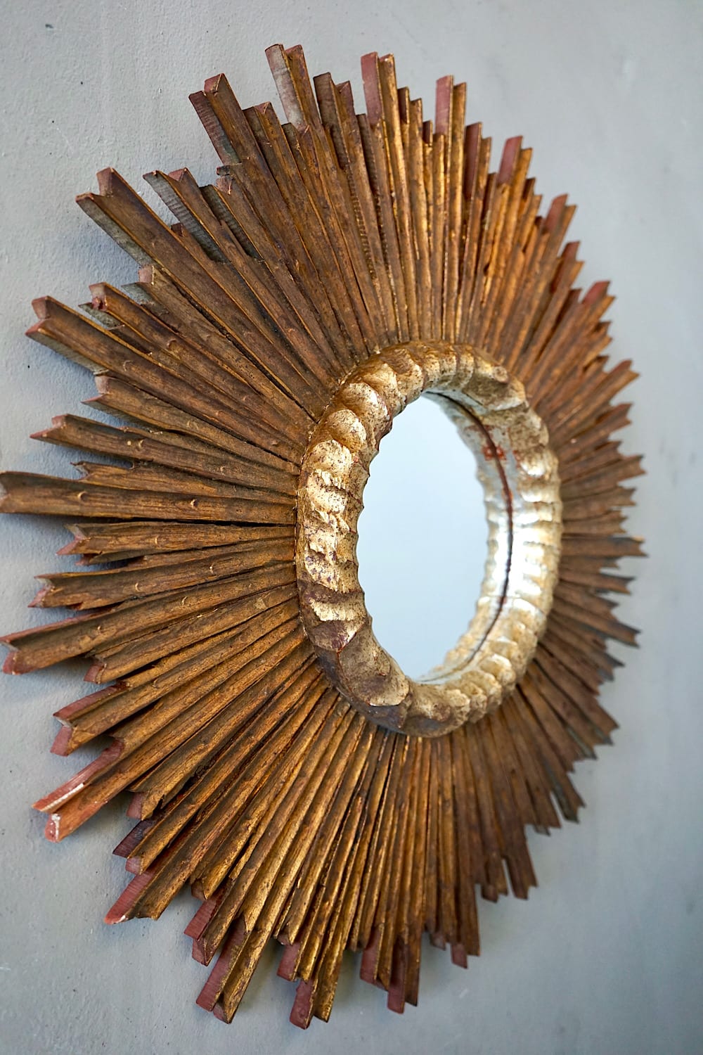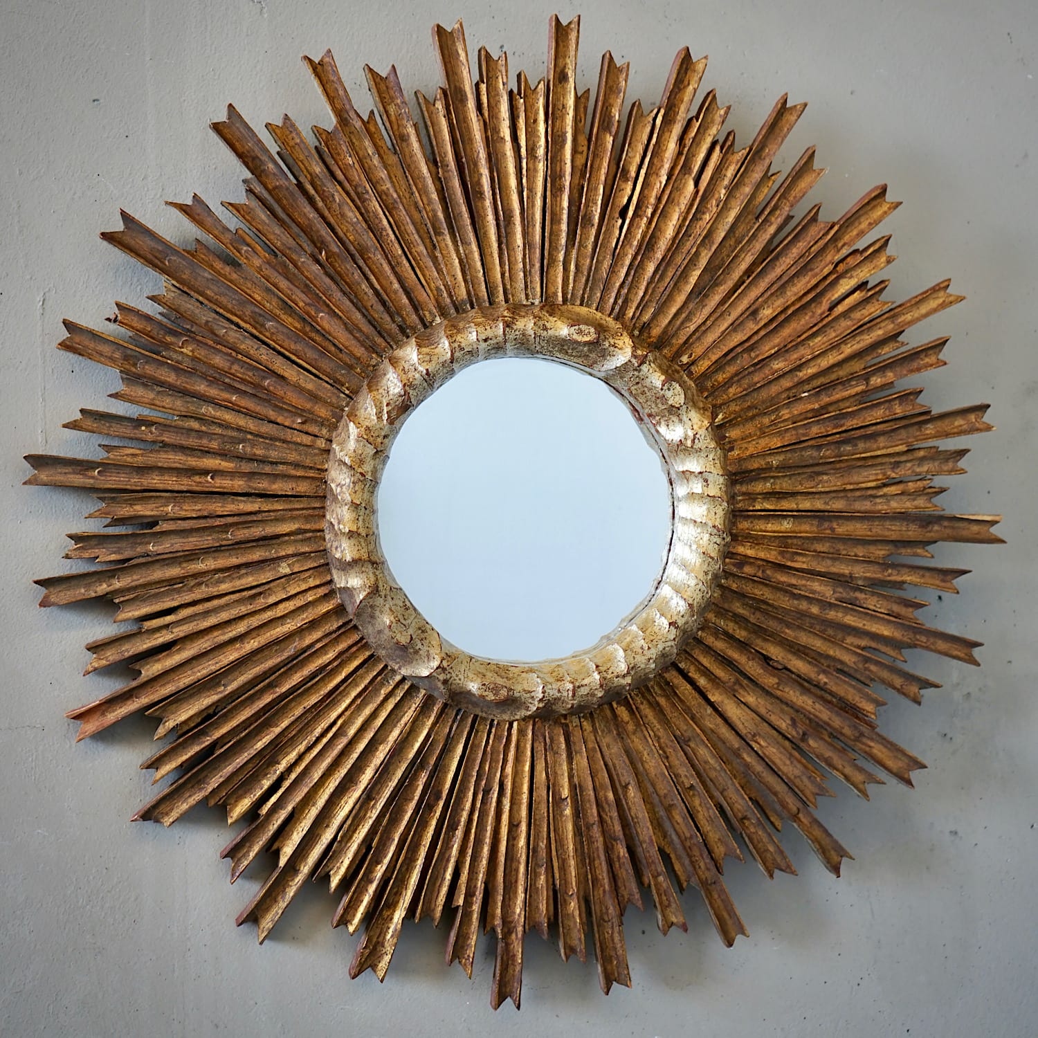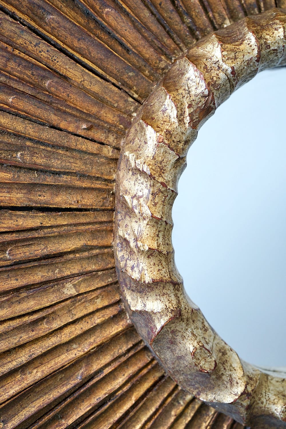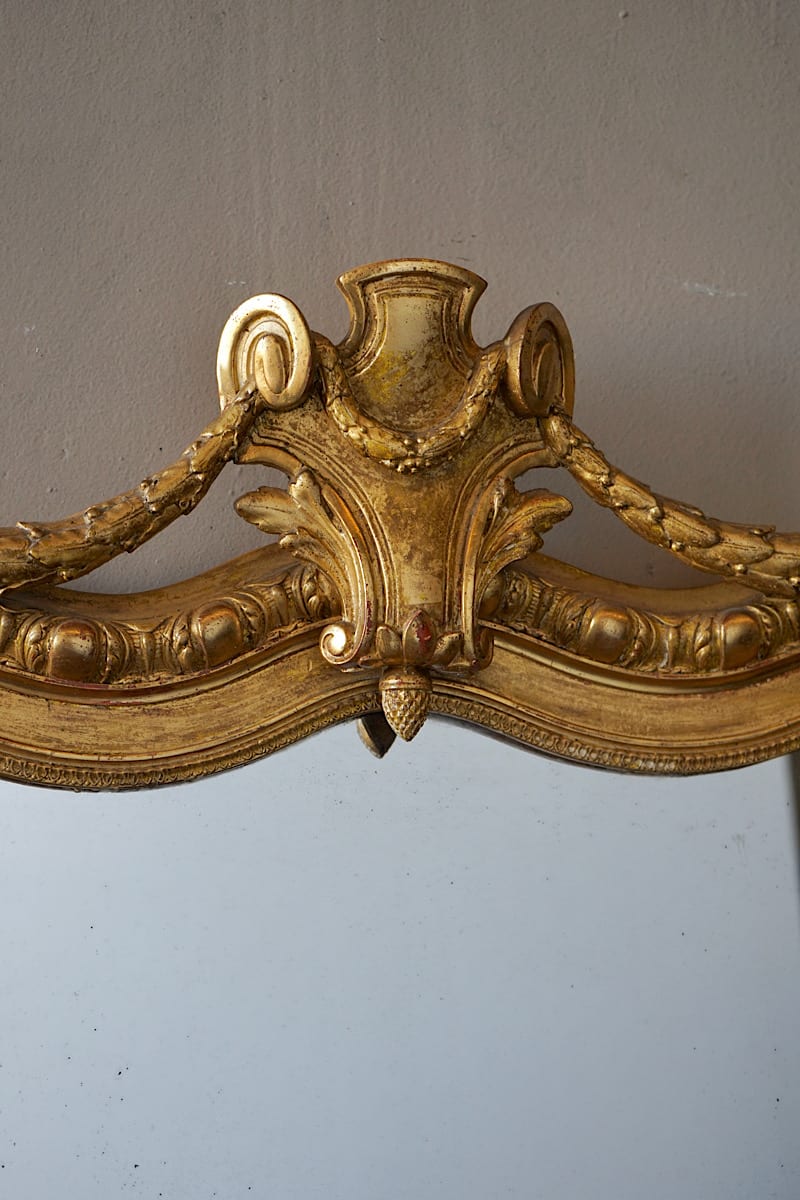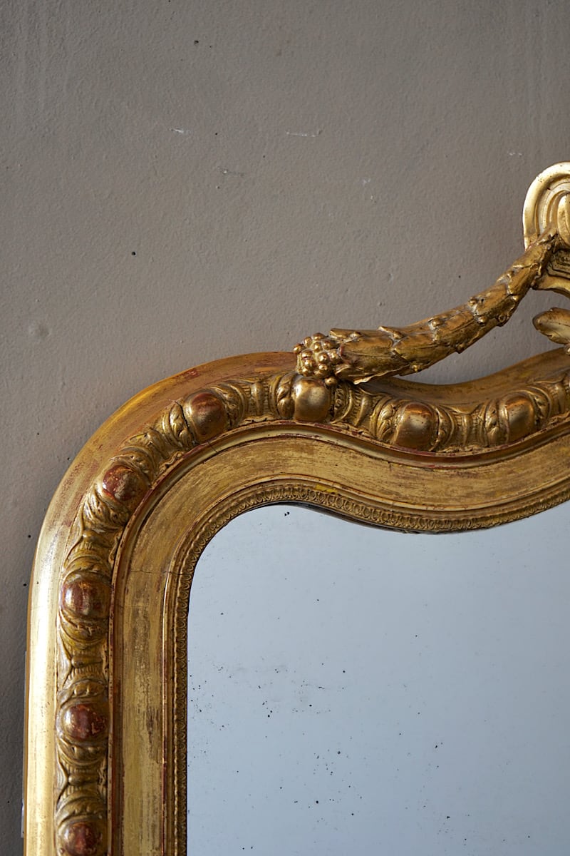 A Louis Philippe period gilded mirror with unusual serpentine top, decorative crest and garlands. Original gilding worn to attractive patina and original glass.