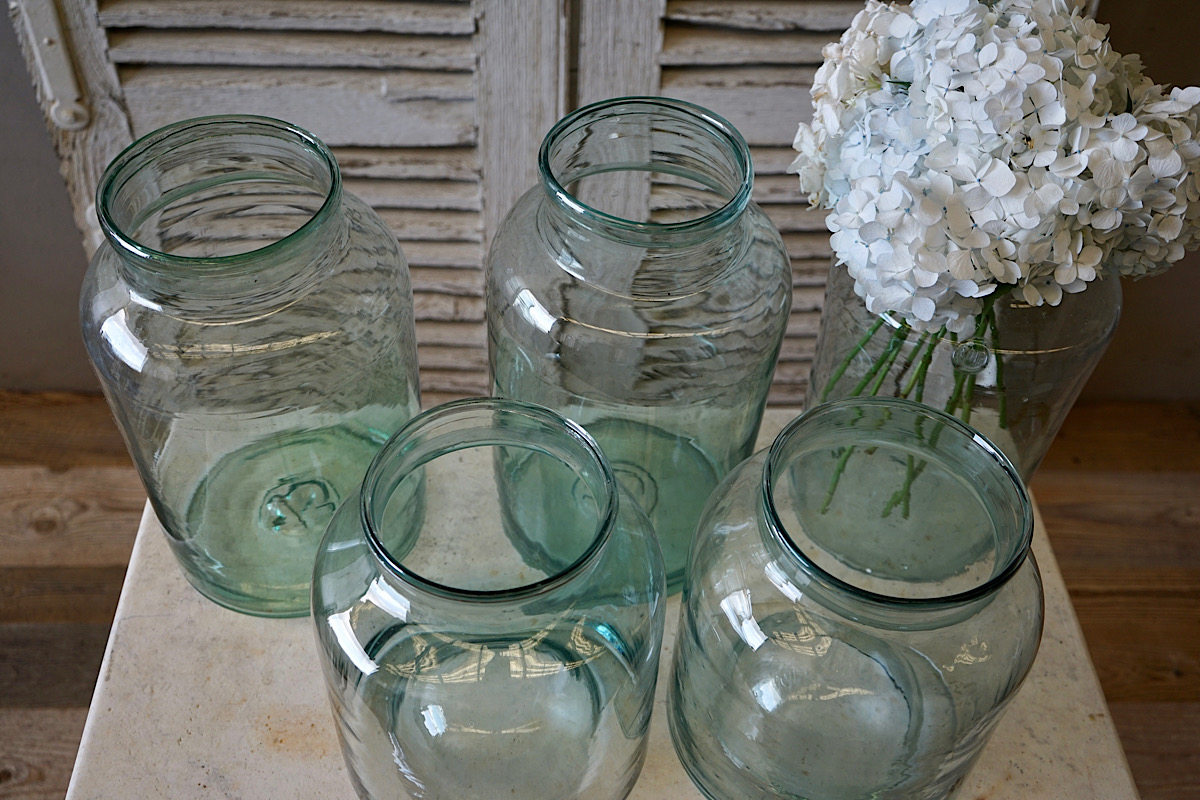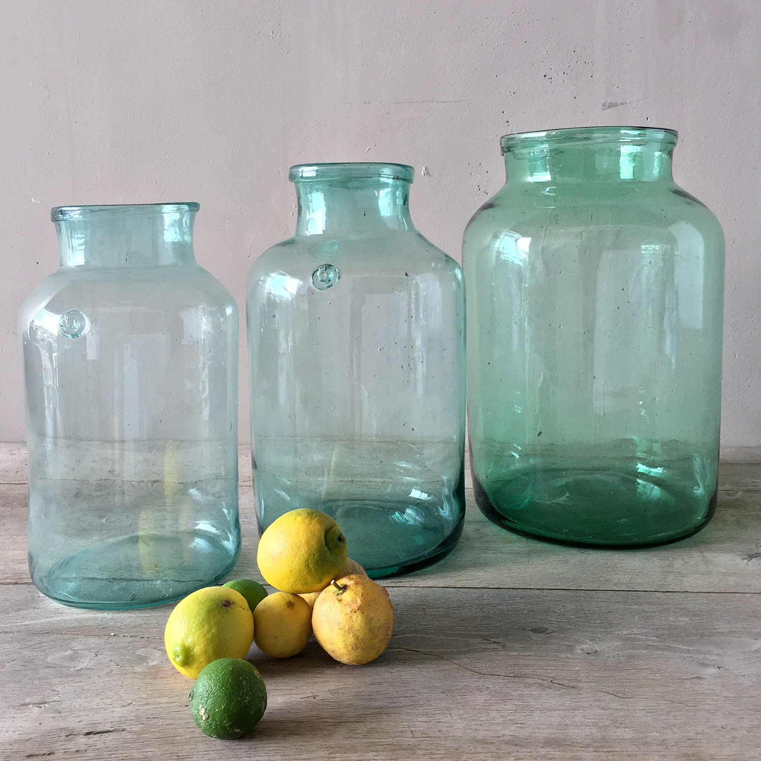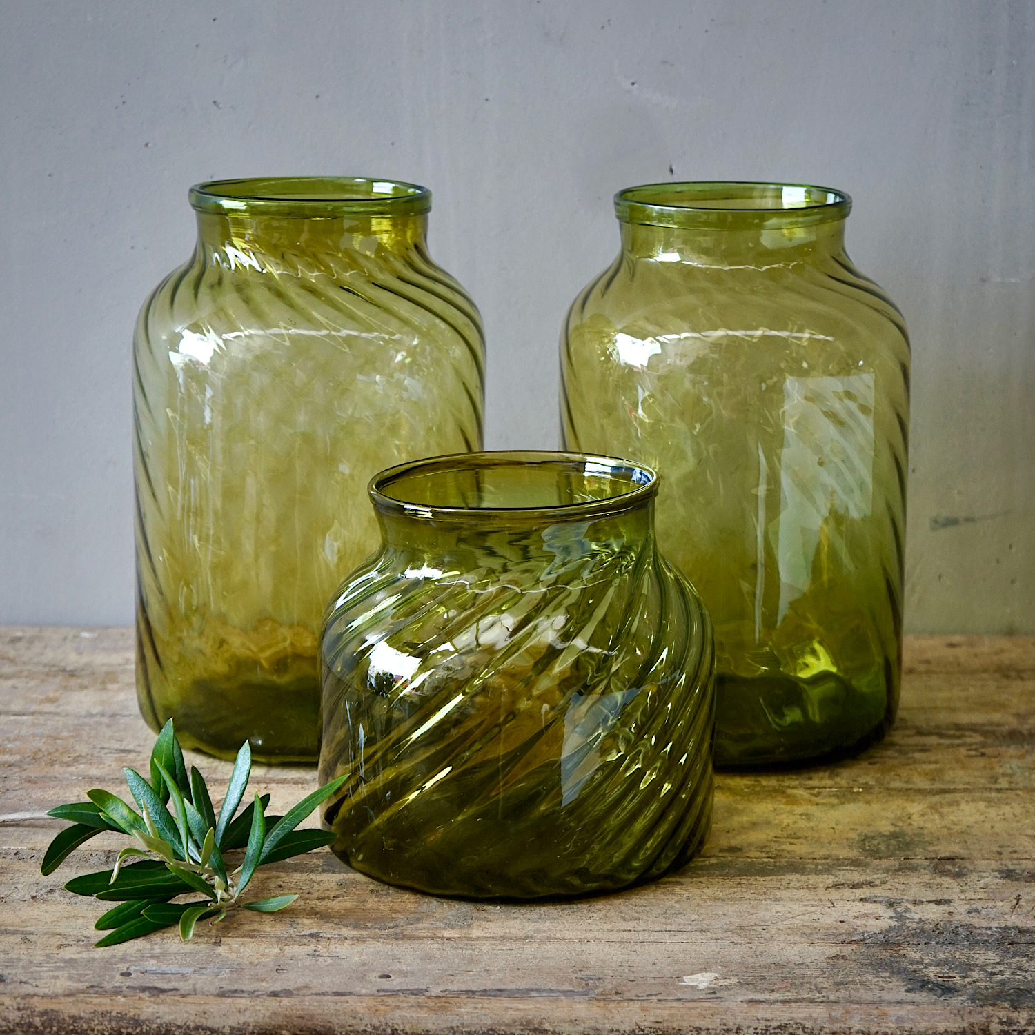 A wonderful collection of rare green hand-blown glass pickle jars. These are very early examples, and not easy to find! Fantastic vases. Sold separately.