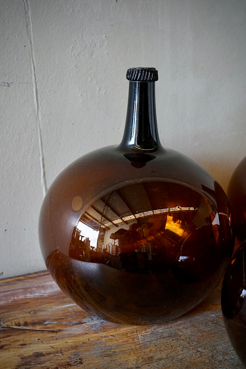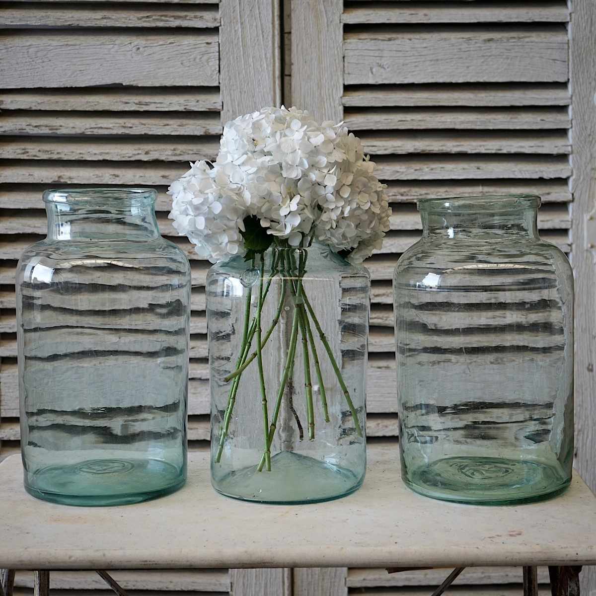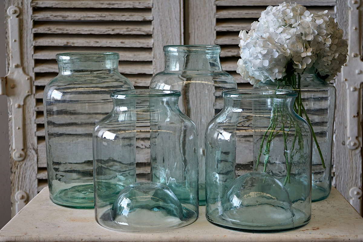 A wonderful collection of rare green hand-blown glass pickle jars. These are very early examples, and not easy to find! Fantastic vases. Sold separately.