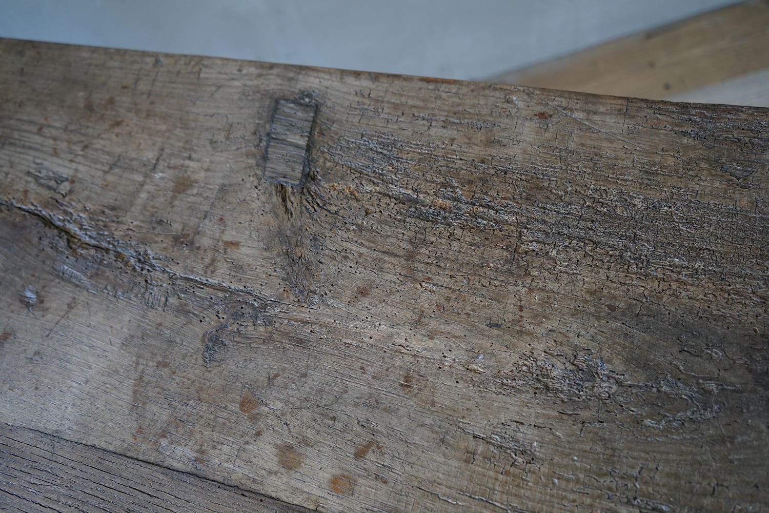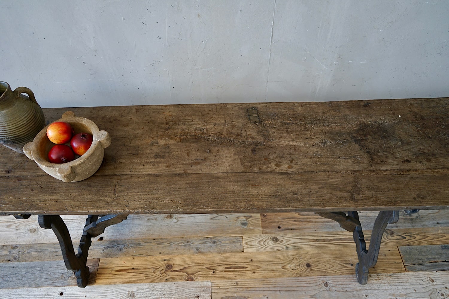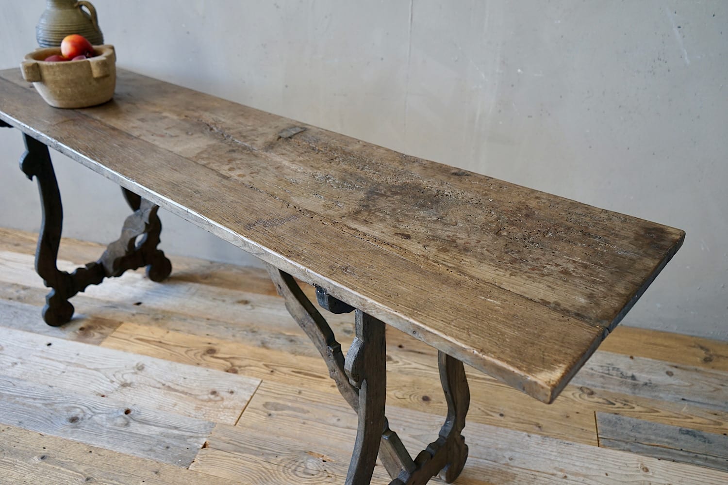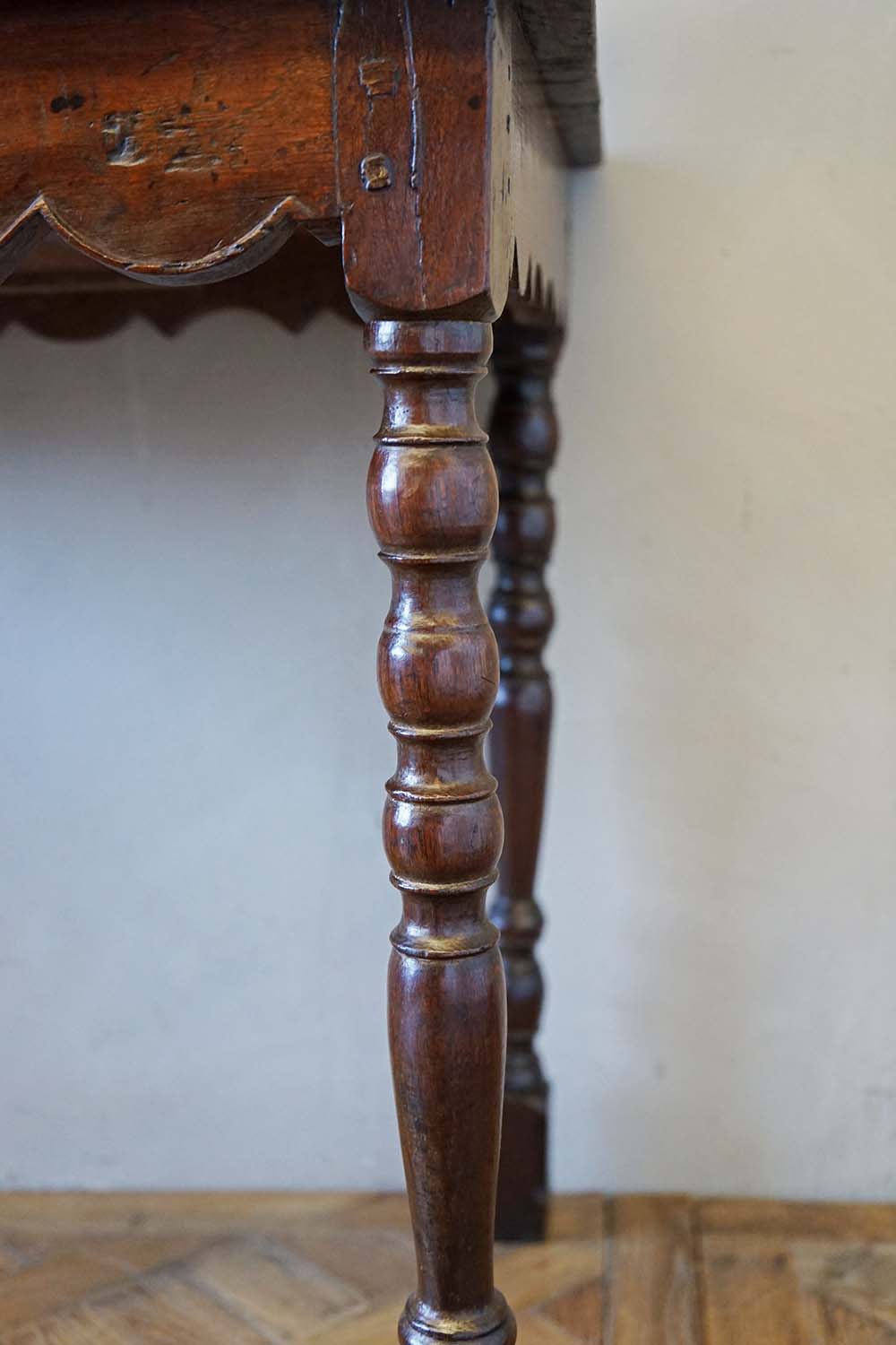 A fine Louis XIV period side table in bare walnut. Lovely form with turned column legs and scrolling stretcher with central finial.