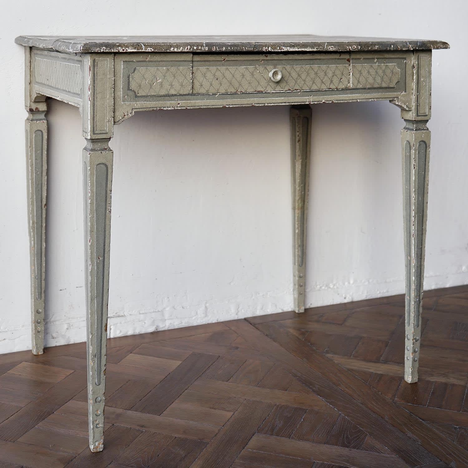 A small Louis XVI style desk or side table painted in pale grey/green with faux marble top. Central drawer, raised on fine fluted tapering legs.
