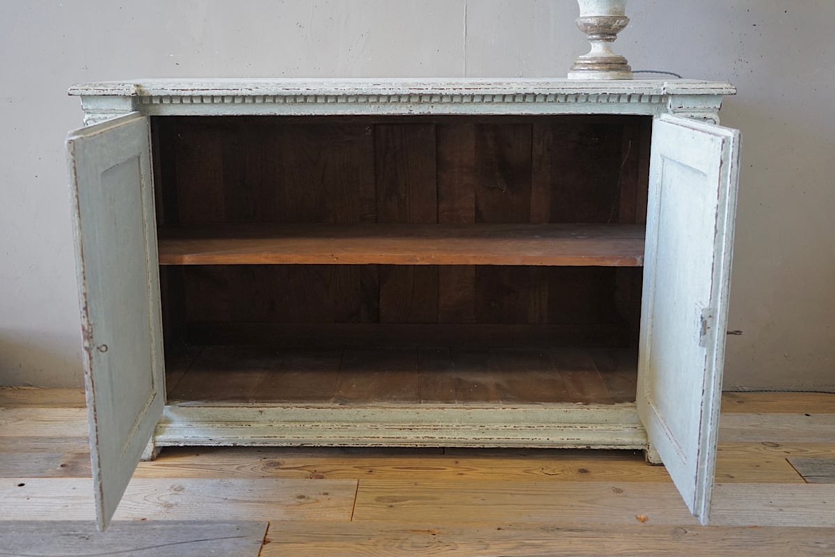 A highly decorative Louis XVI style sideboard, painted in blue/grey with attractive patina. Panelled doors with carved rosettes in the corners and neoclassical fluted pilasters at each end. A stunning addition to any traditional or contemporary interior.