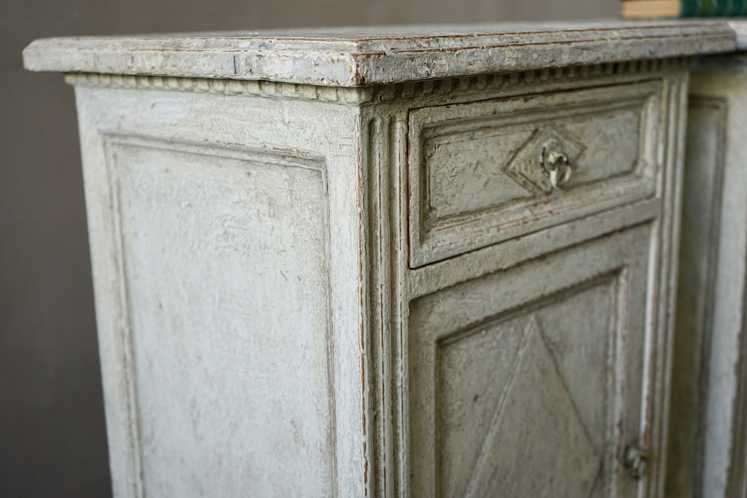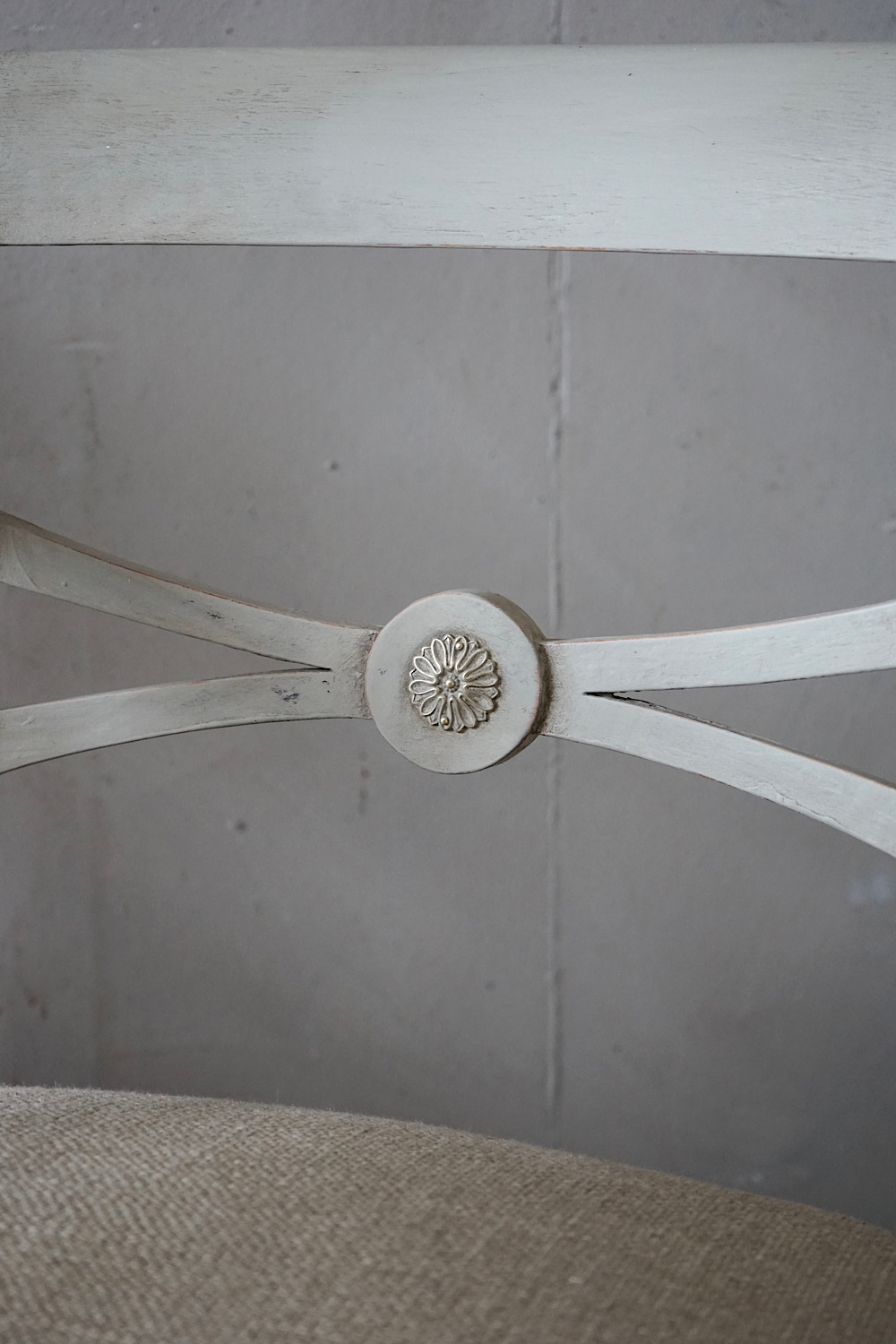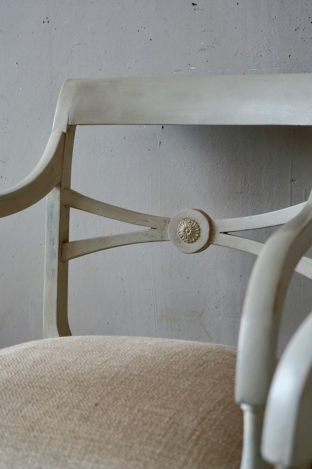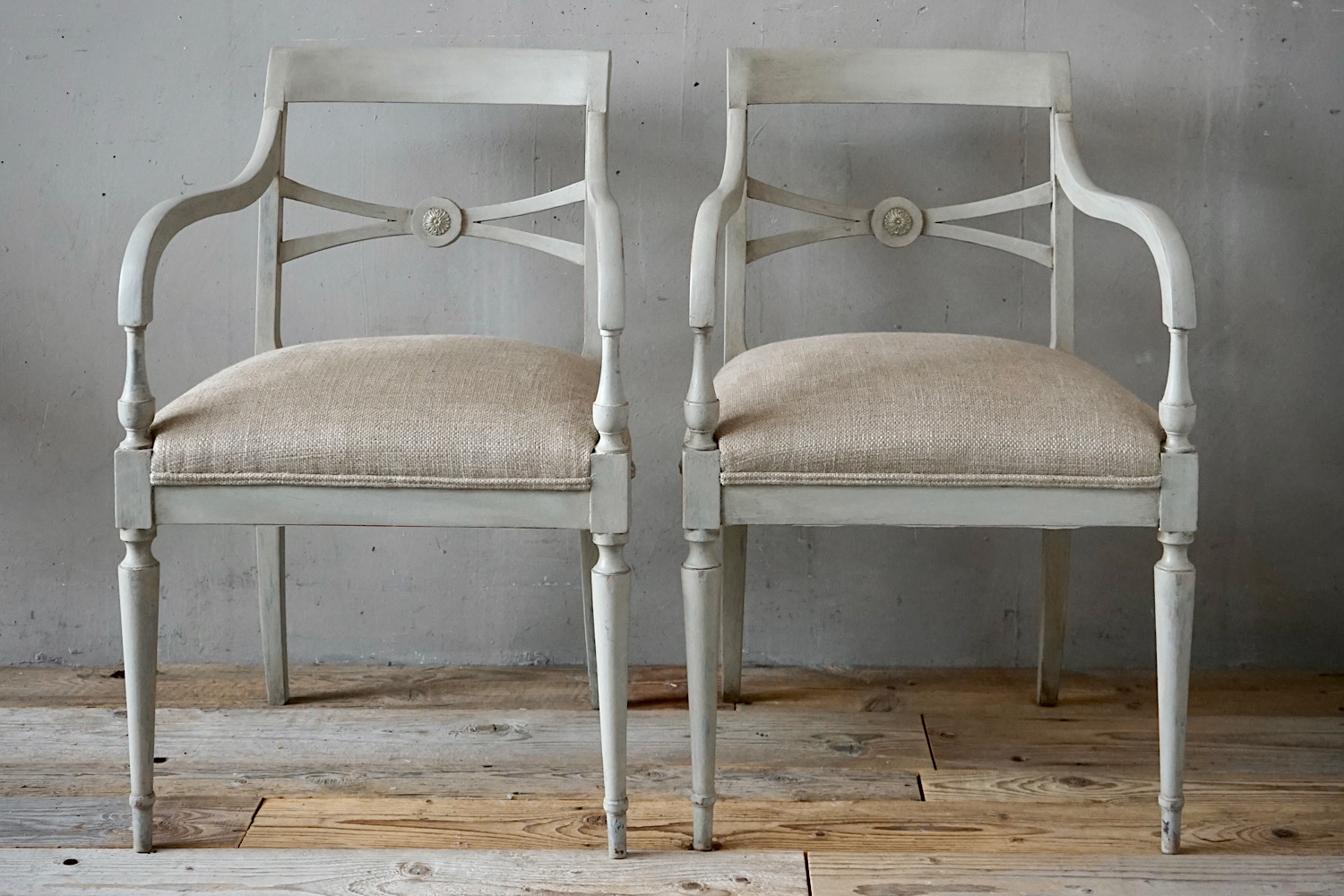 A pair of small, elegant Directoire style armchairs painted in soft beige/grey with attractive patina. Excellent solid condition, newly recovered in Italian beige linen mix. Priced and sold as a pair.