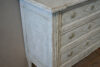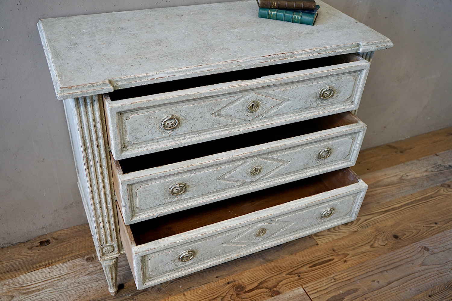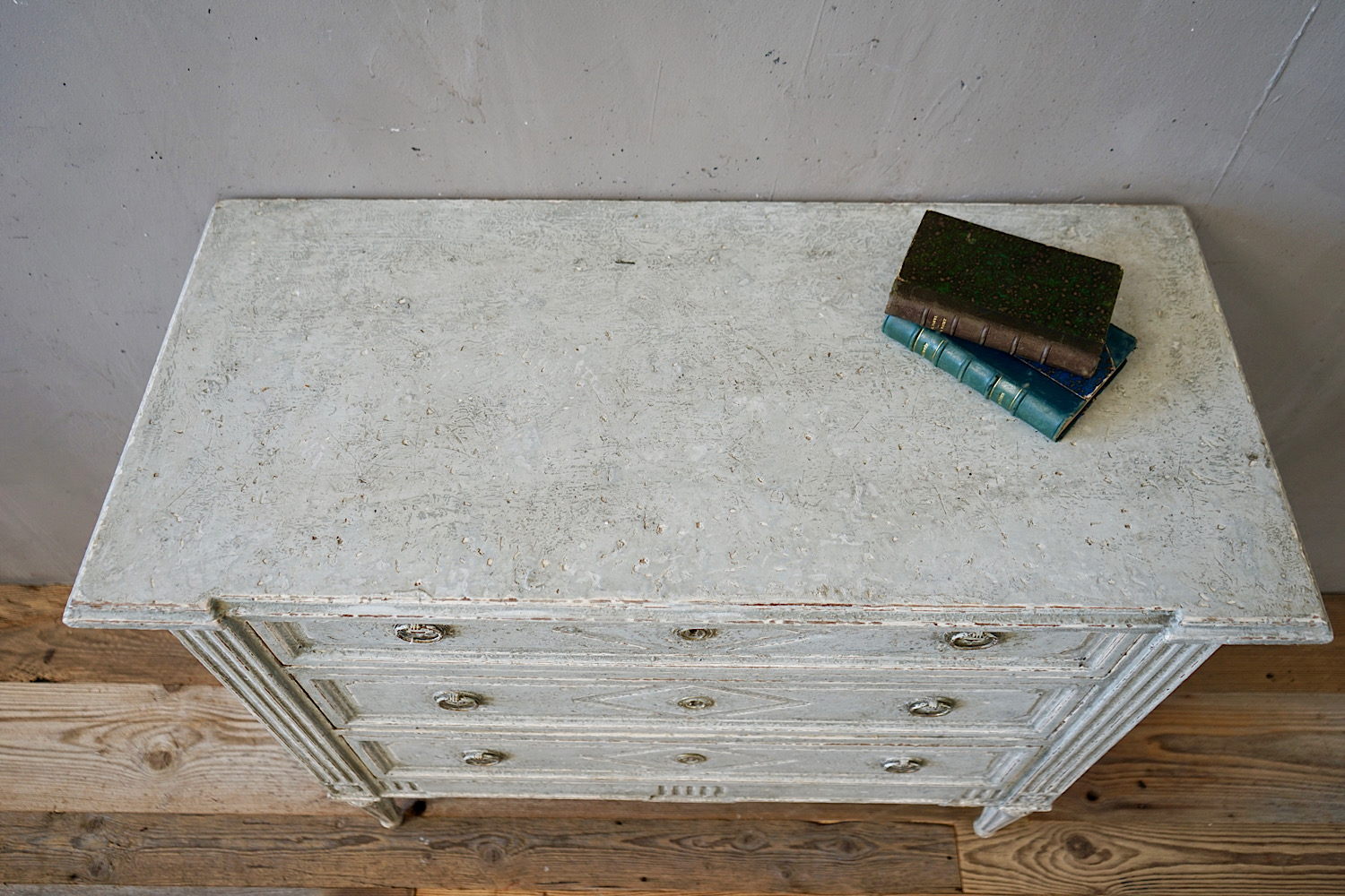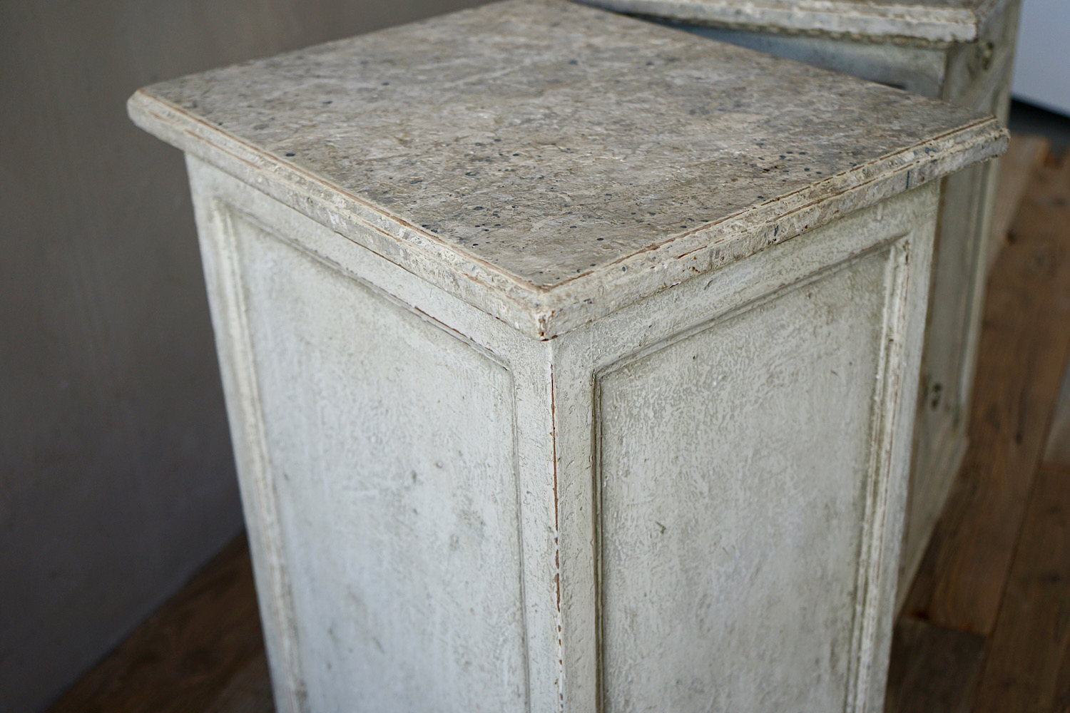 A pair of small, elegant Directoire style armchairs painted in soft beige/grey with attractive patina. Excellent solid condition, newly recovered in Italian beige linen mix. Priced and sold as a pair.