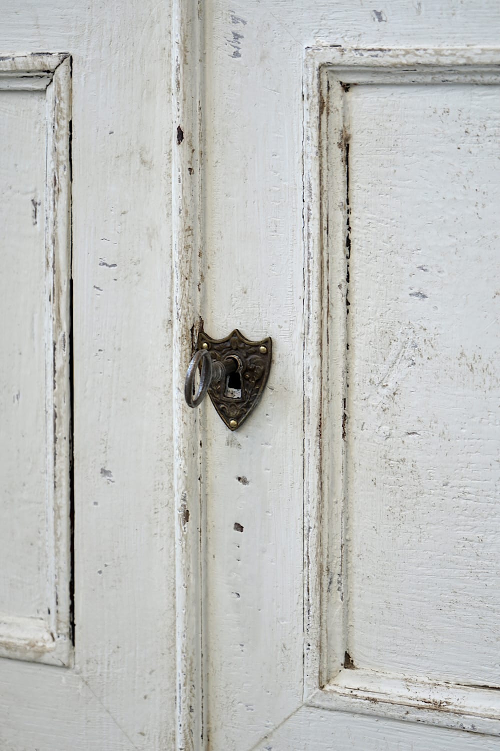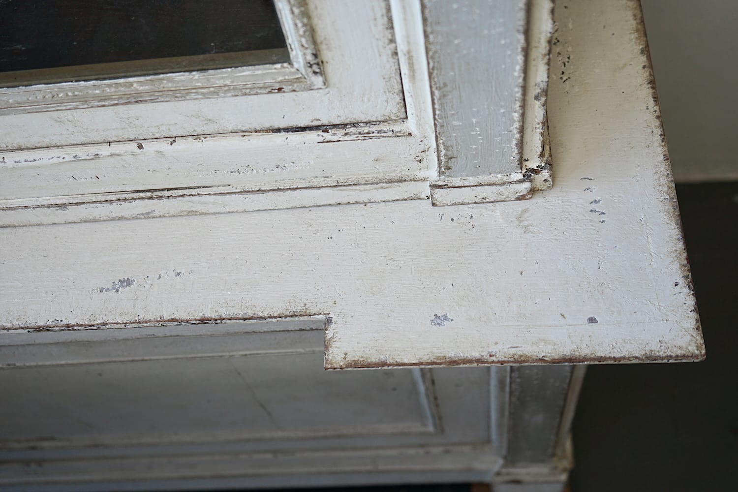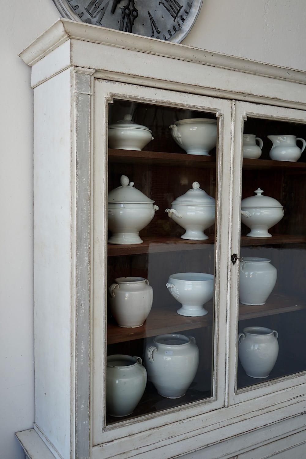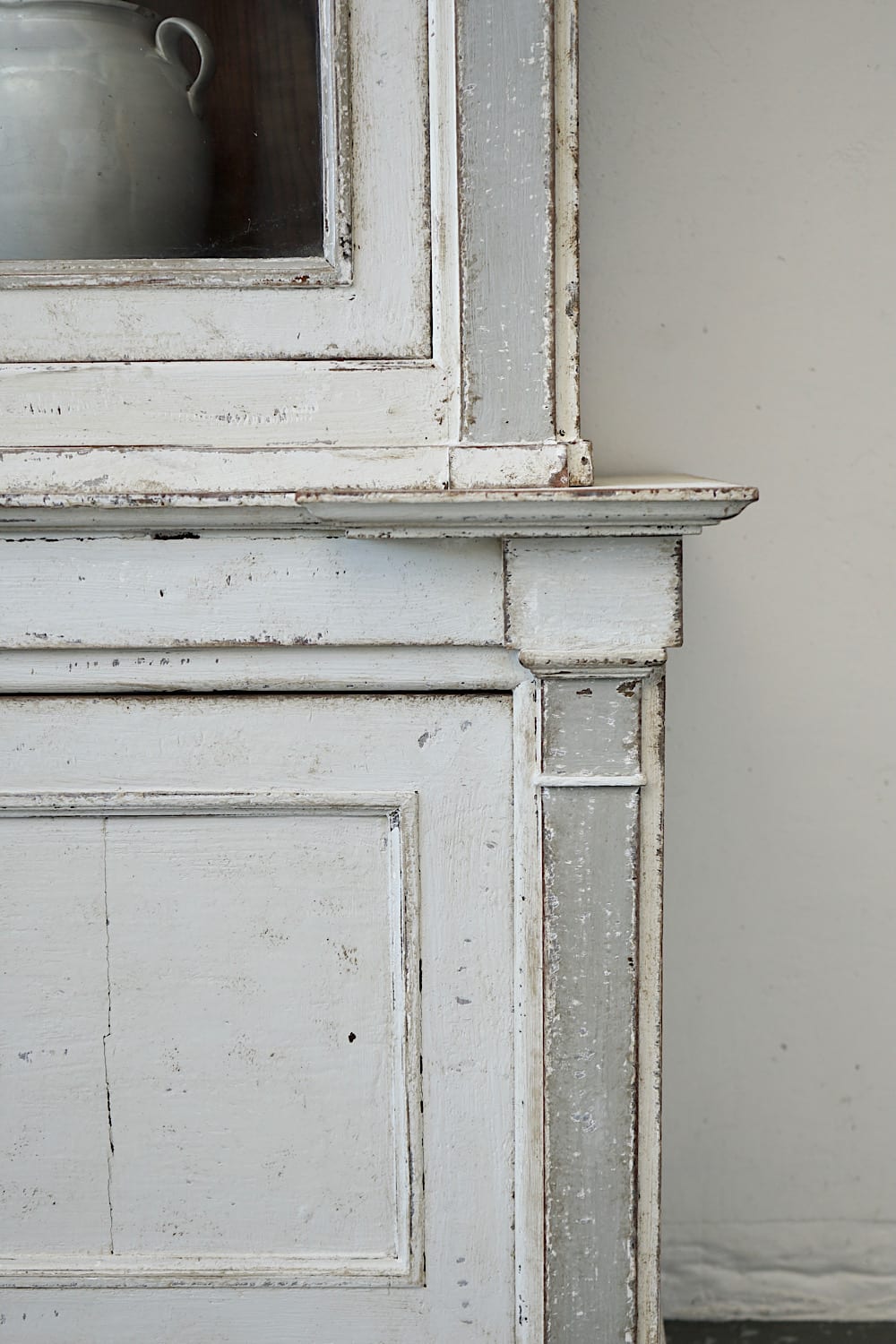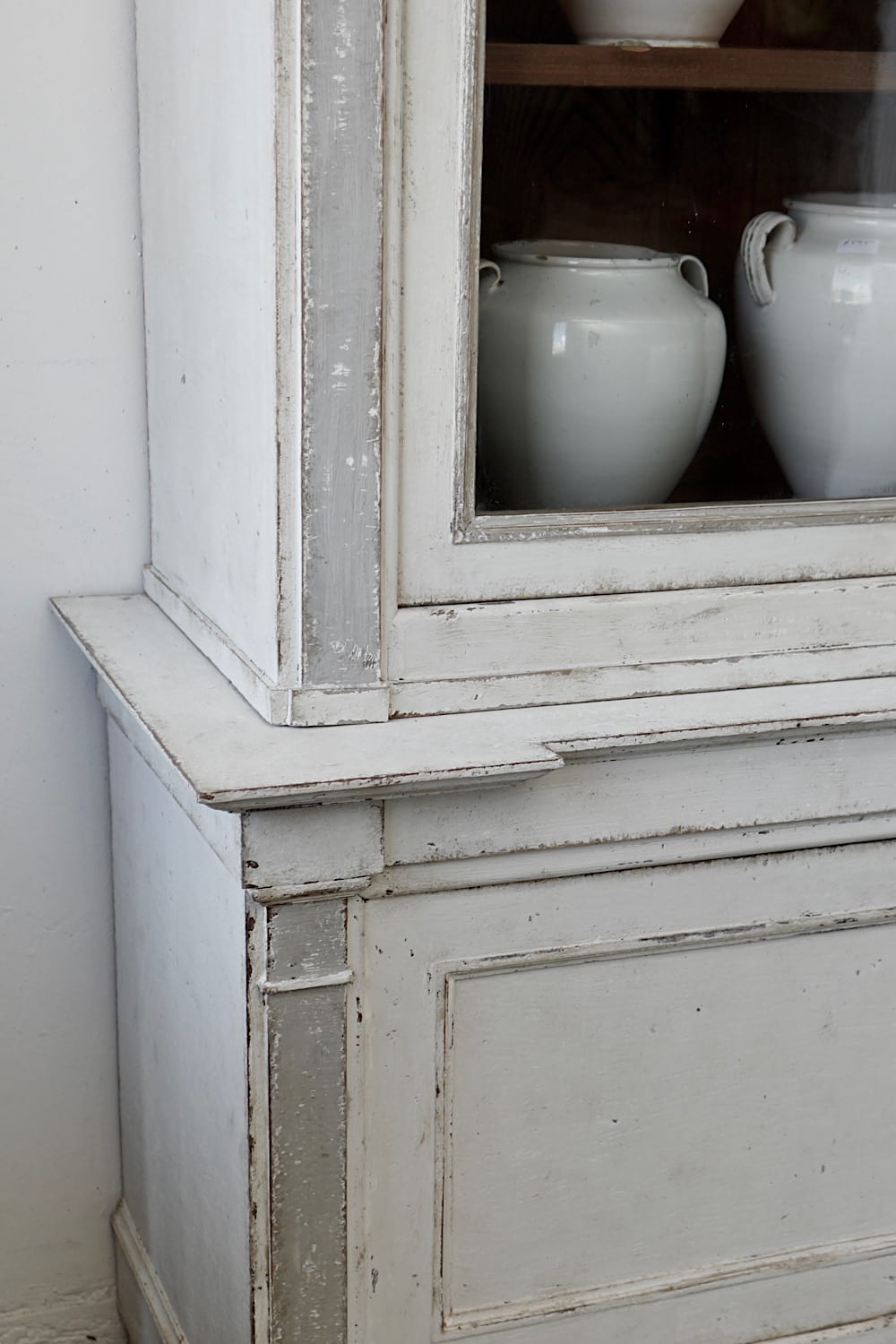 A highly decorative display cabinet or bookcase with glazed upper doors, painted in off-white with grey pilasters. Neoclassical stepped detail and moveable internal shelves. Original large glass panes in both doors. Very chic in a kitchen, dining or living area.