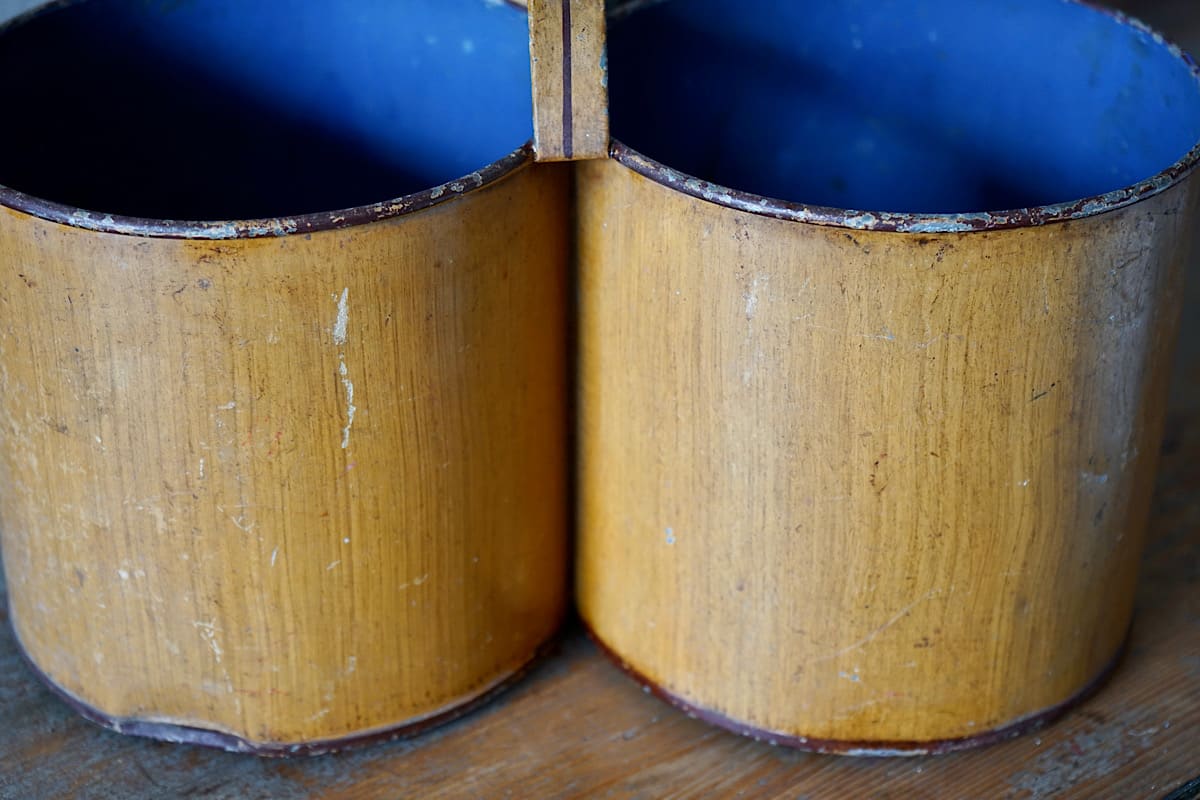 A charming zinc two-bottle wine cooler/carrier. Painted in wood grain exterior and blue interior.