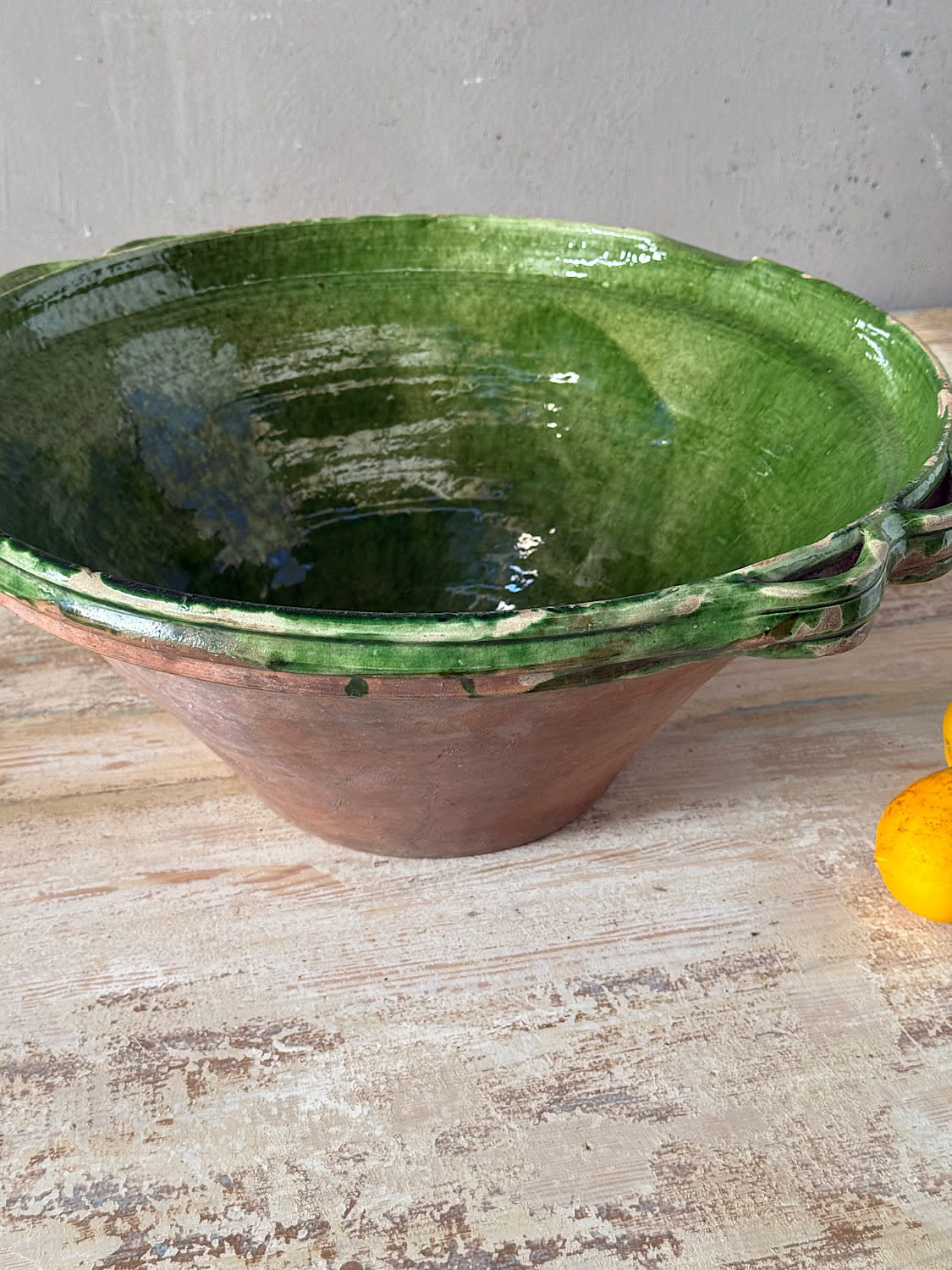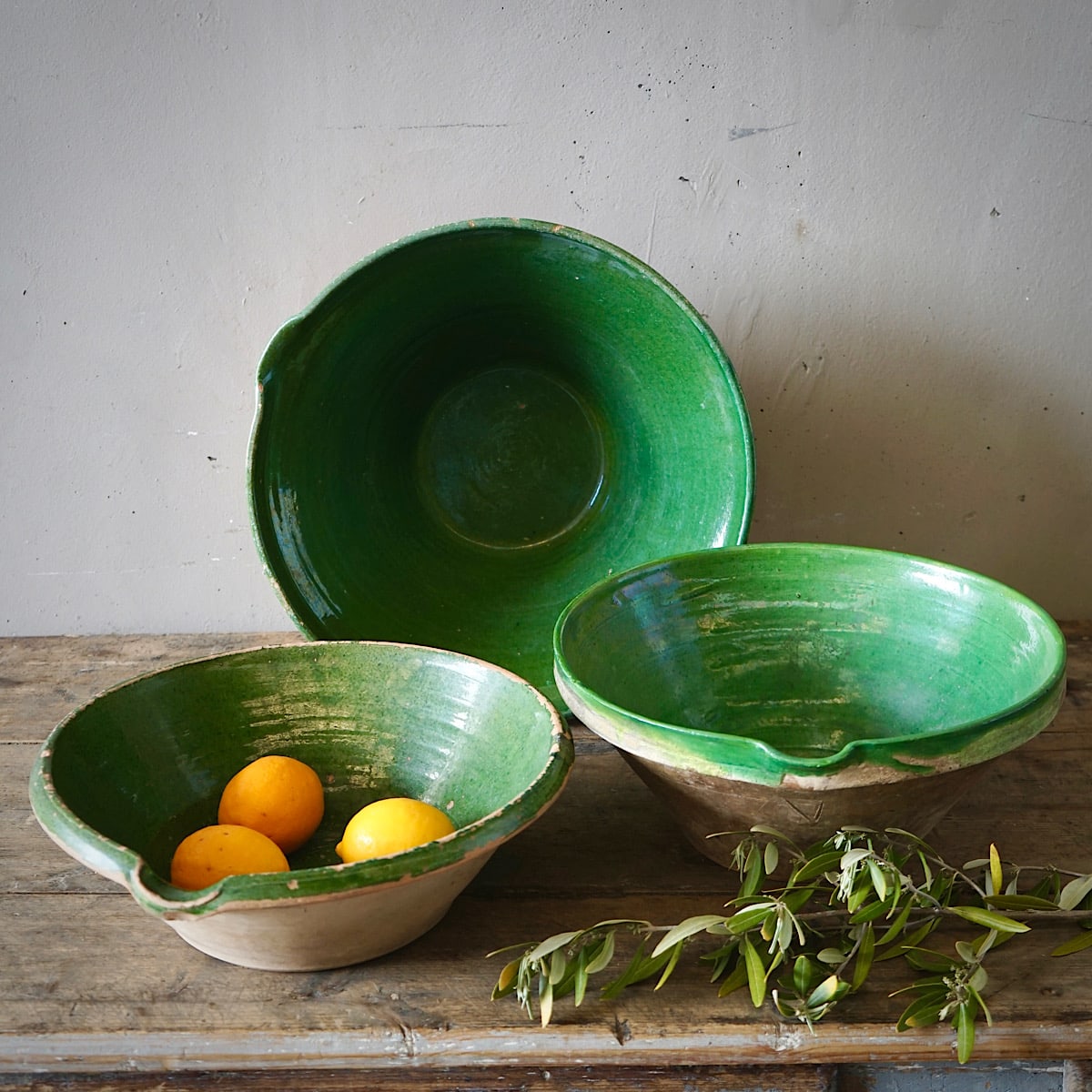A rare small provincial, green glazed terracotta dorge a goulot or water jug from southwest France, with lovely aged patina. These were made for workers to take into the field to drink water from. Hence the small glazed spout.
