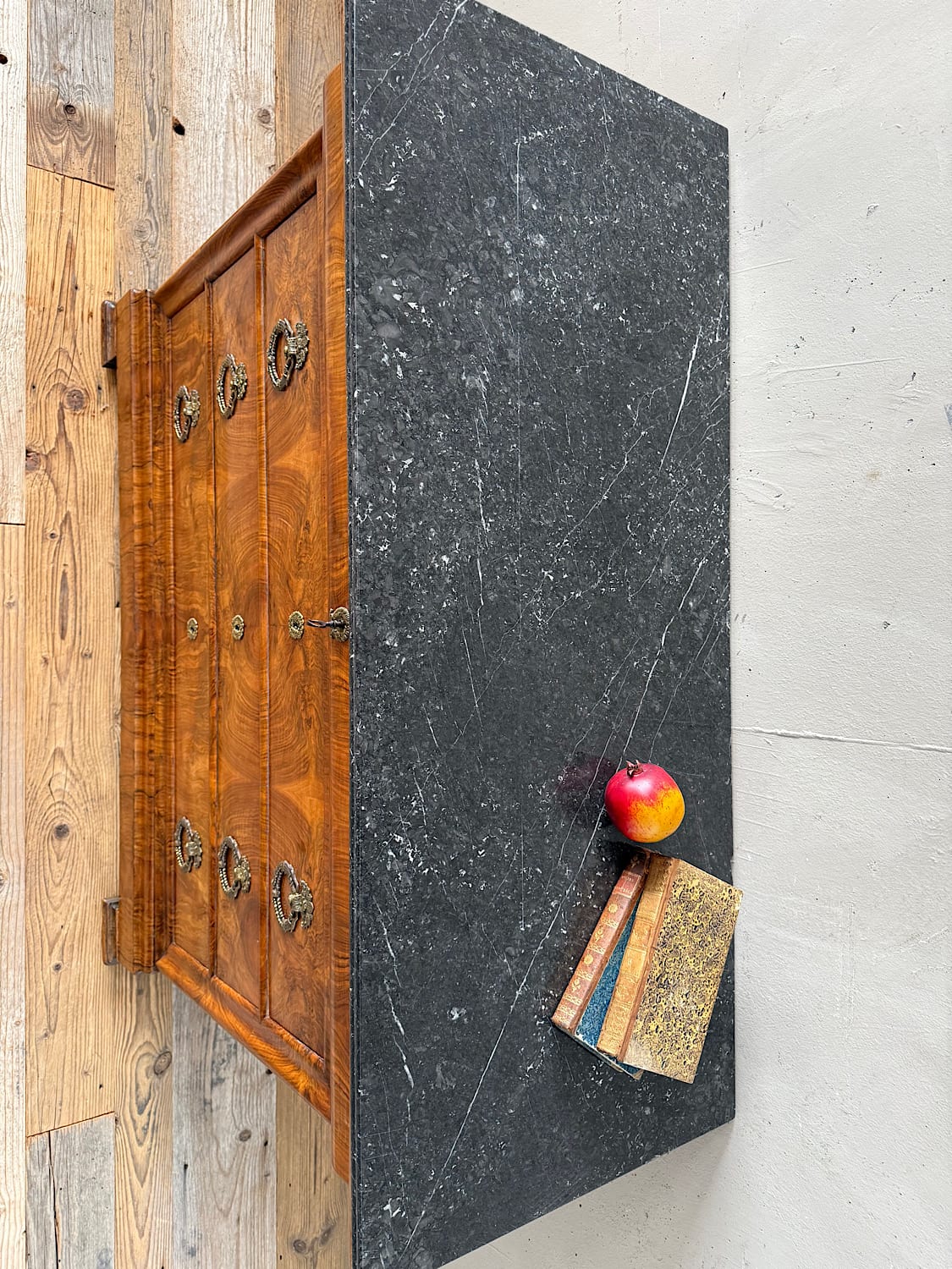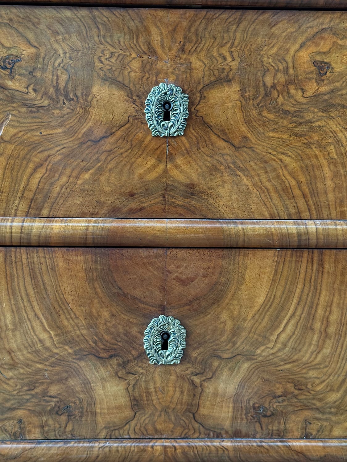 A good quality Louis Philippe period commode (chest of drawers) in book-matched blonde walnut veneers, with original fossil marble top. Five drawers, including ‘hidden’ bottom drawer in the plinth. A particularly striking example, in excellent original condition. A perfect statement piece in a traditional or contemporary setting.