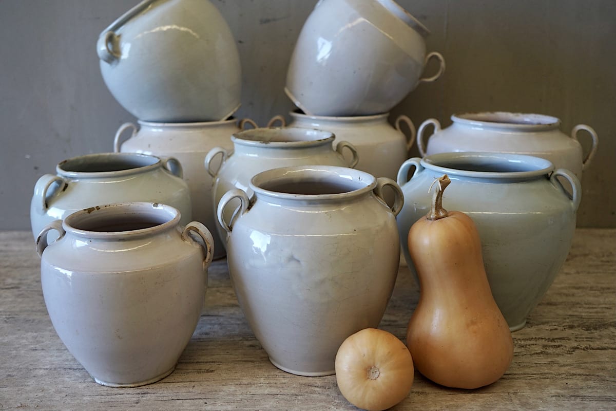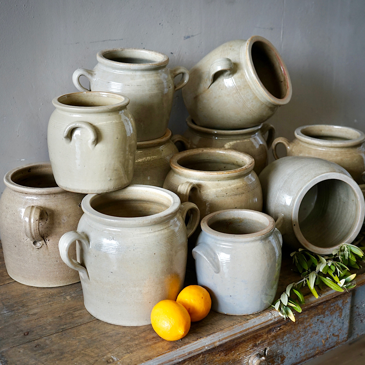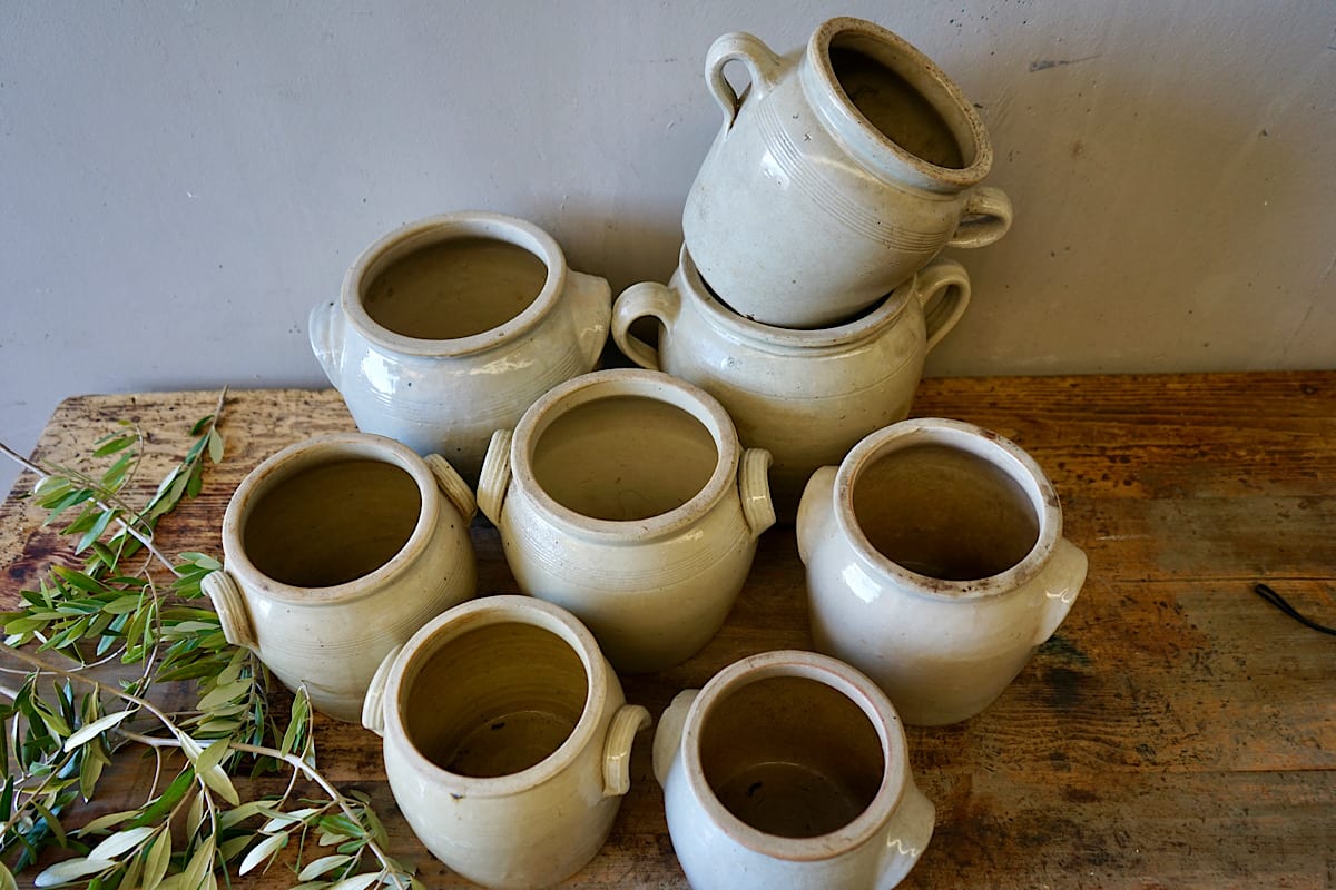 A collection of yellow glazed terracotta preserving pots from the South of France. Lovely shape and colour. These jars were traditionally used in French kitchens for storing jams and conserves.