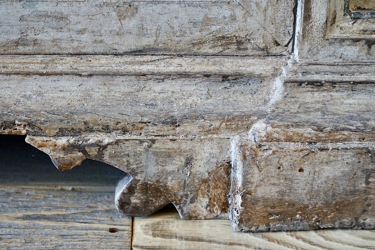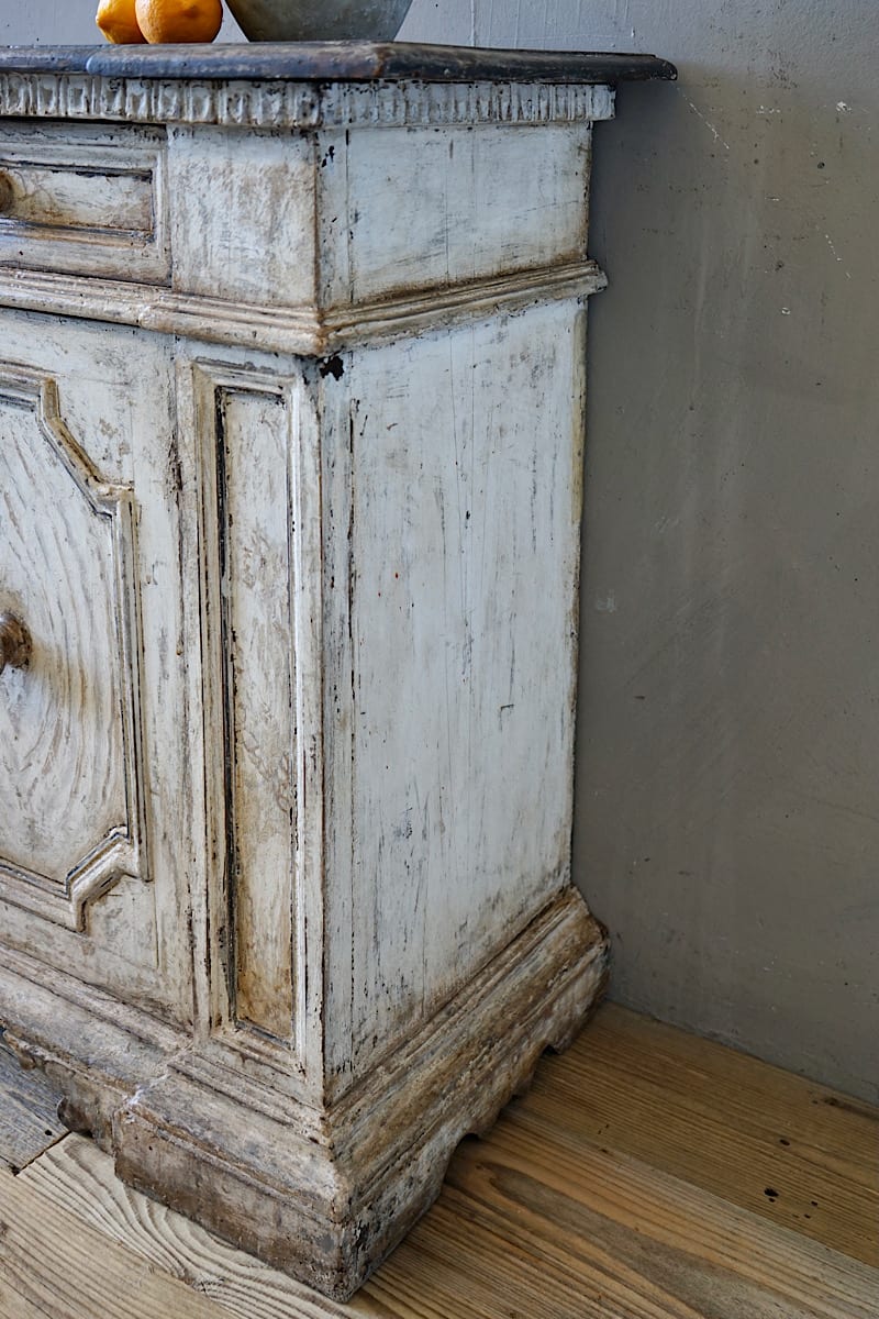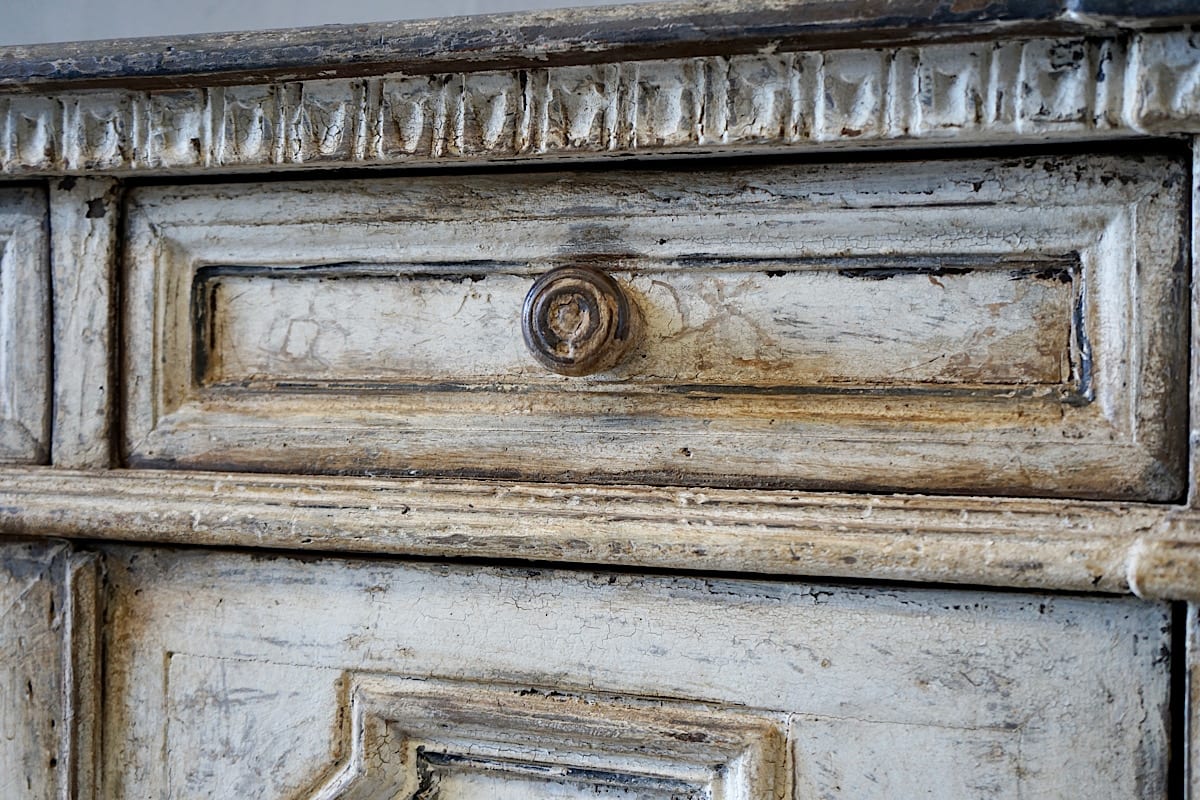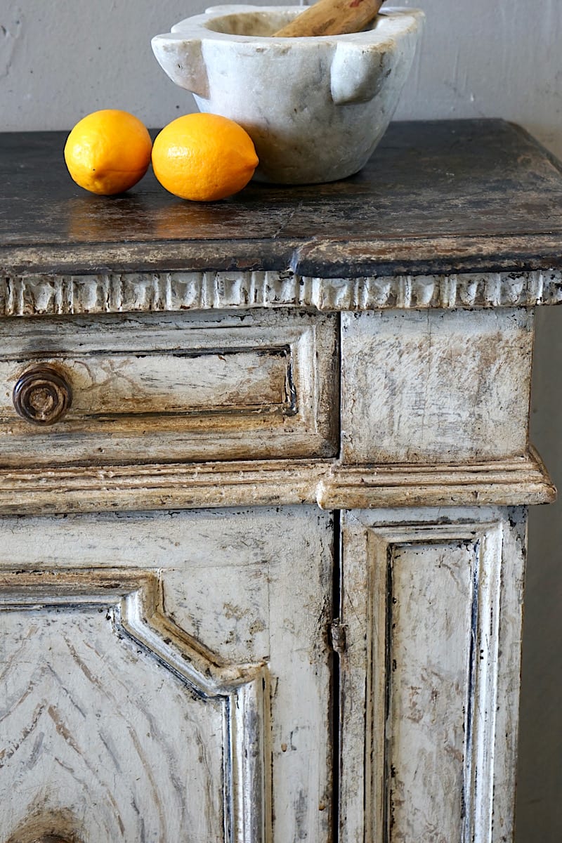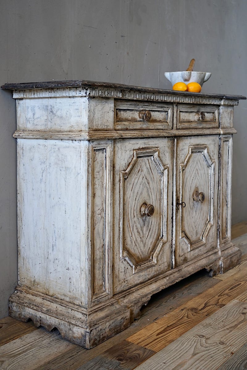 A highly decorative Italian credenza sideboard with panelled doors, carved details and gorgeous original painted patina.