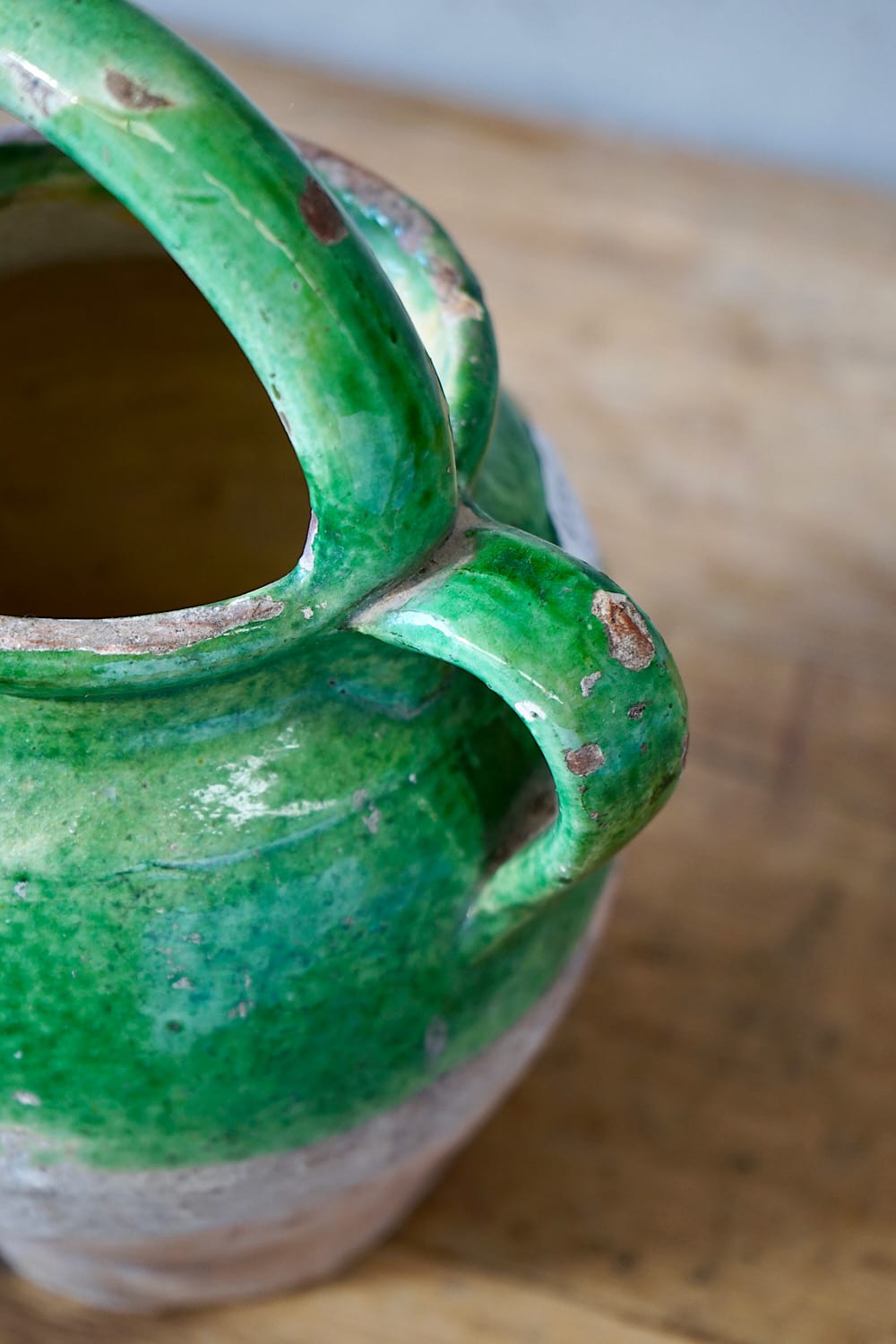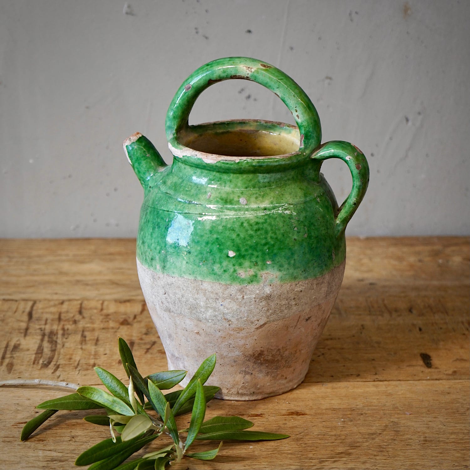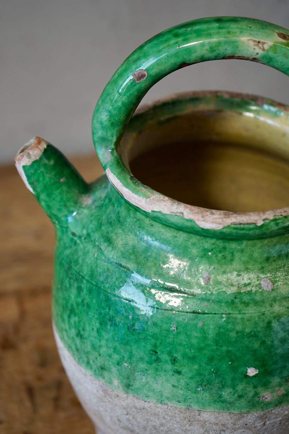 A terracotta olive oil jar from Provence with yellow & green glaze.