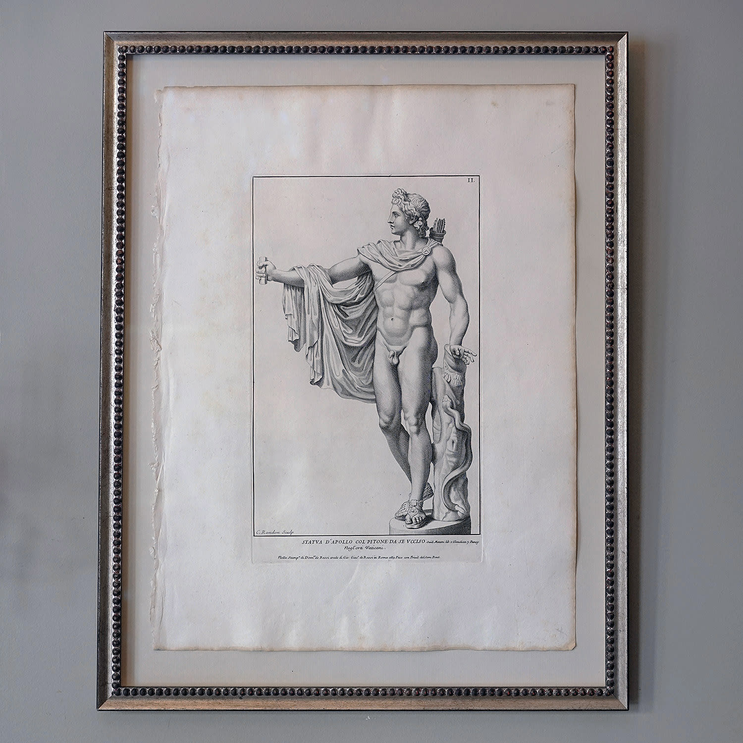 A highly decorative Italian copperplate engraving depicting a “Statue of Apollo with Python” by Claude Randon (1674-1704).