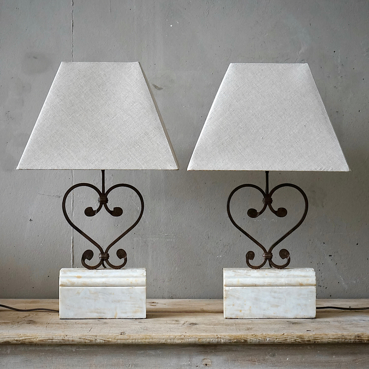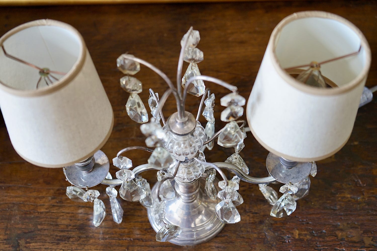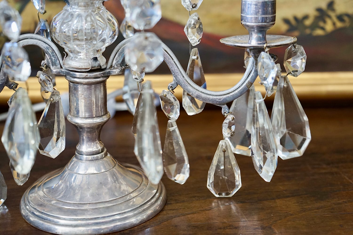 An elegant pair of French girandoles or candelabra lamps. Silvered brass frames with original glass drops. Discretely electrified to NZ standards. Priced and sold as a pair. Can be used with or without shades.