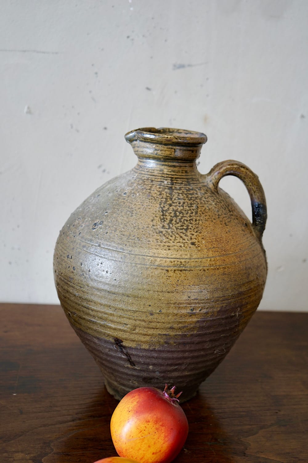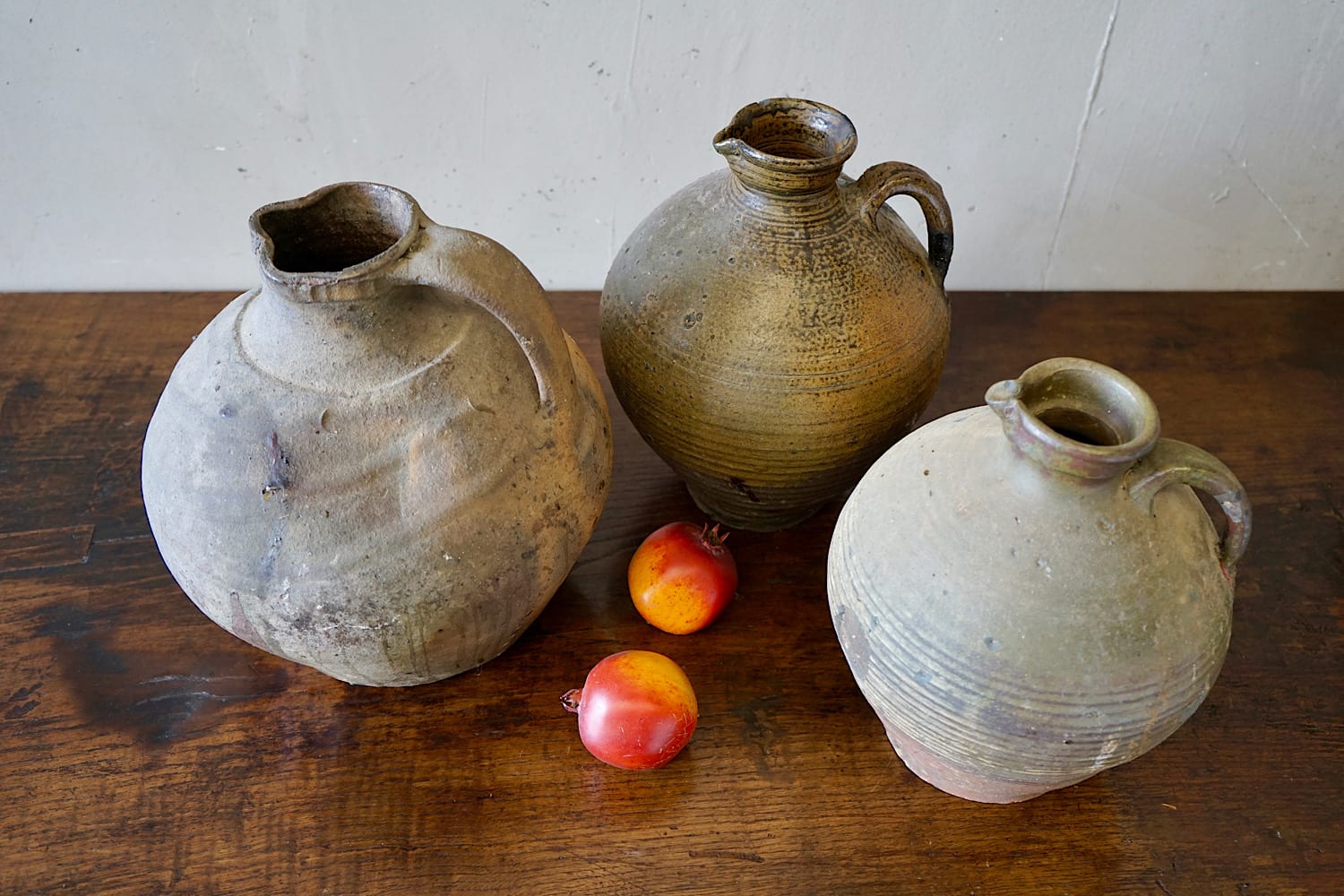 A collection of 3 French provincial earthenware oil jars. Lovely organic colours, firing defects, ribbed surface and matt patina. Priced and sold separately.