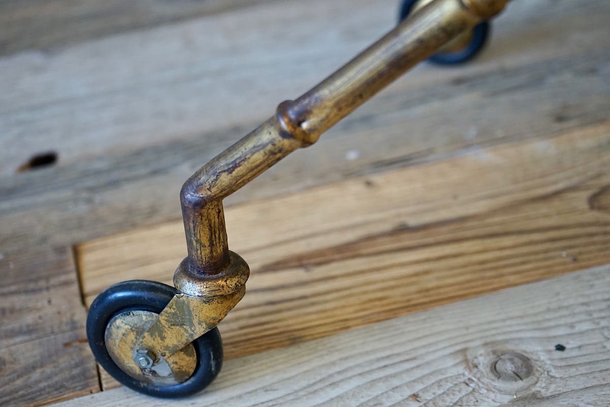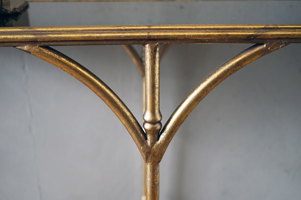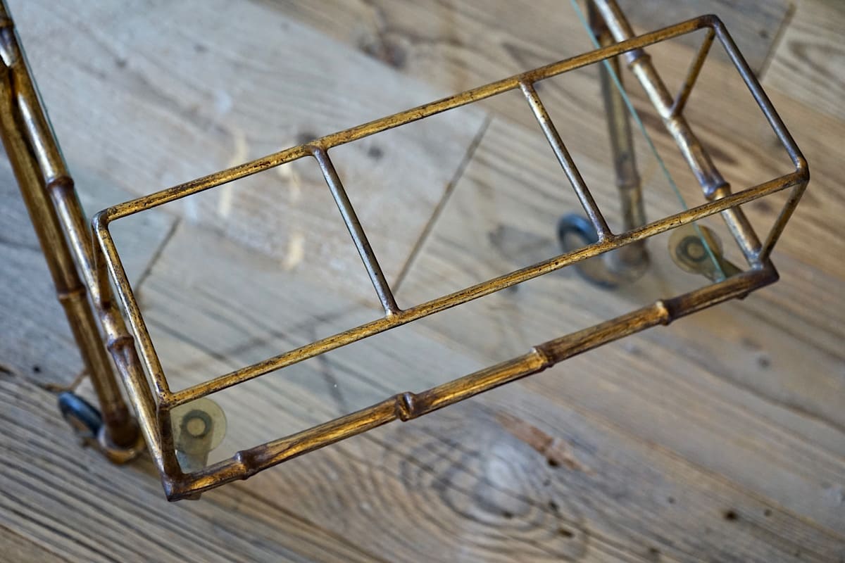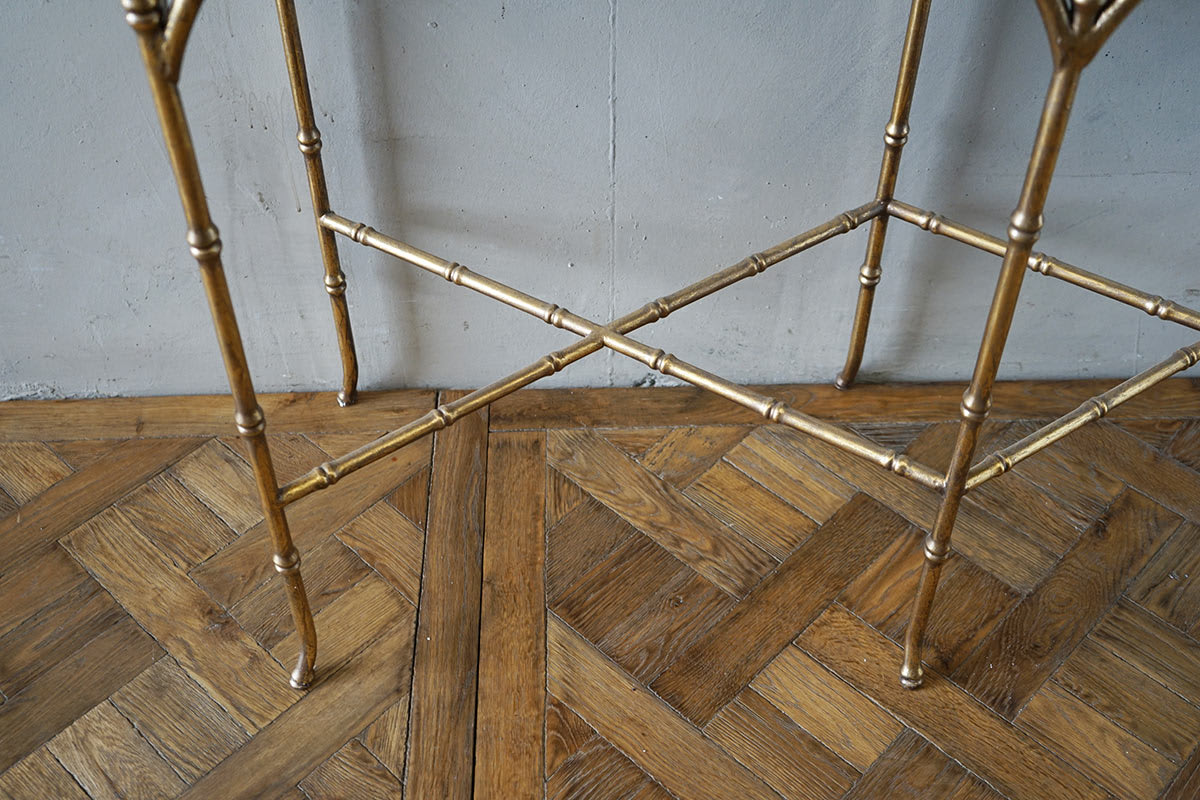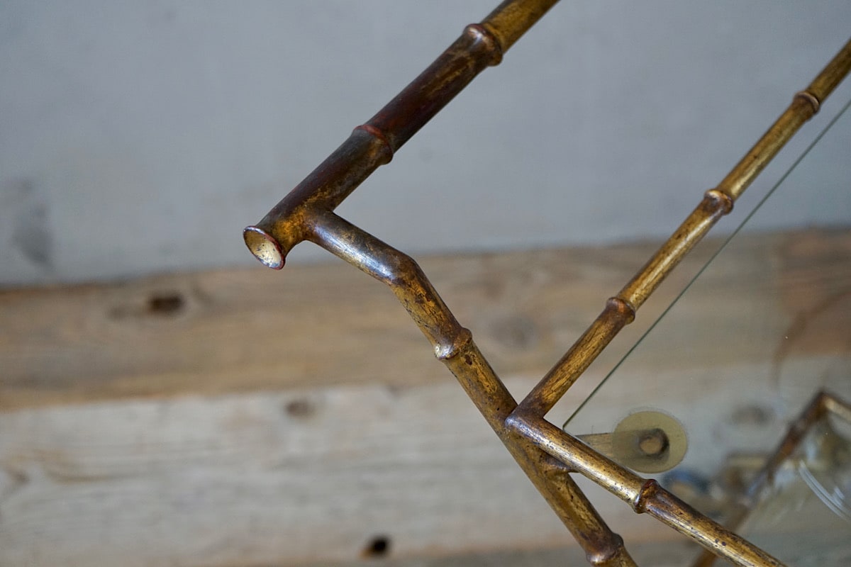 A striking, large French gilded wrought iron faux bamboo lantern. Four glass panes around a central pendant holding two candle light fittings. Gilding showing soft aged patina. Discretely rewired to NZ standards. Pair available.