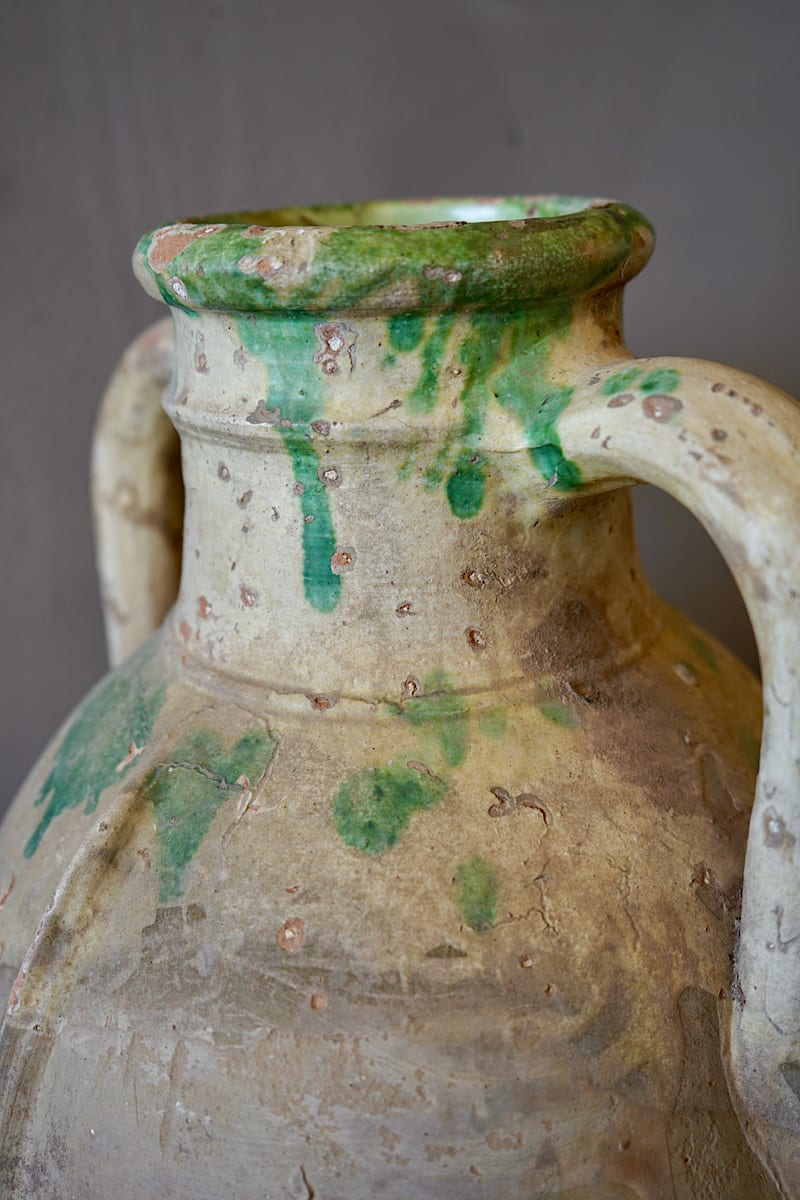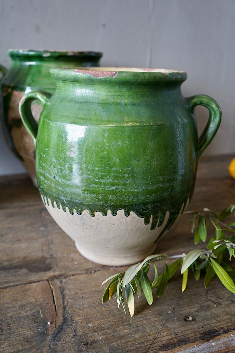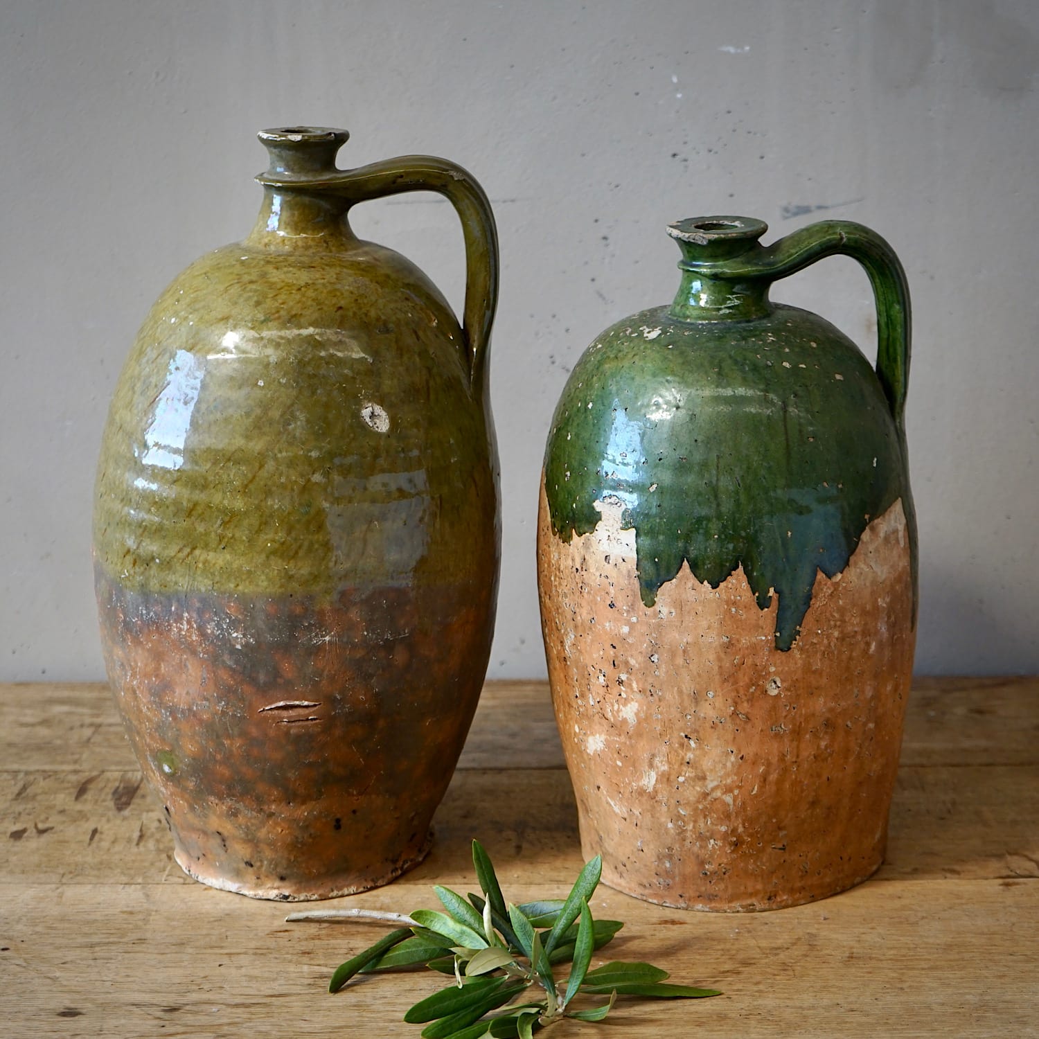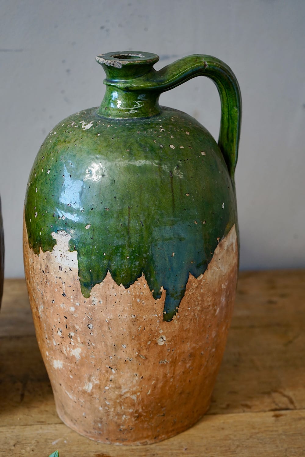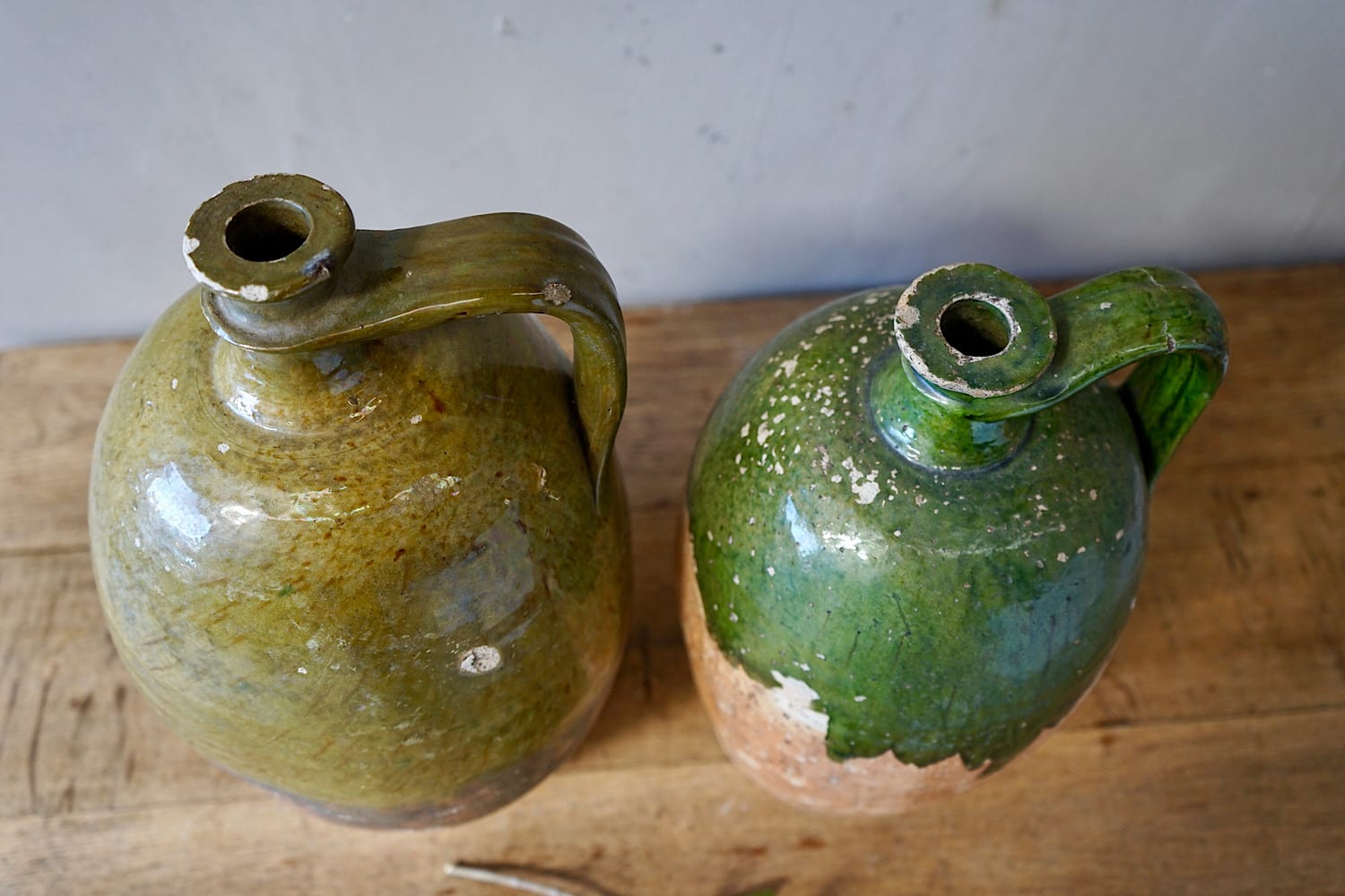 Two provincial, green glazed terracotta water jugs from southwest France. These were made for workers to take into the field to drink water from. Hence the small glazed spout. Rare shape and colour. Beautiful as a pair. Priced and sold separately.