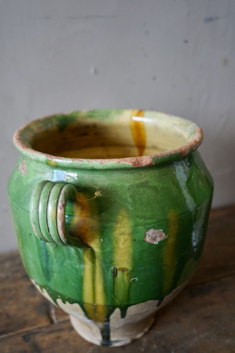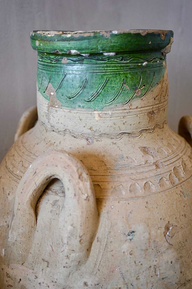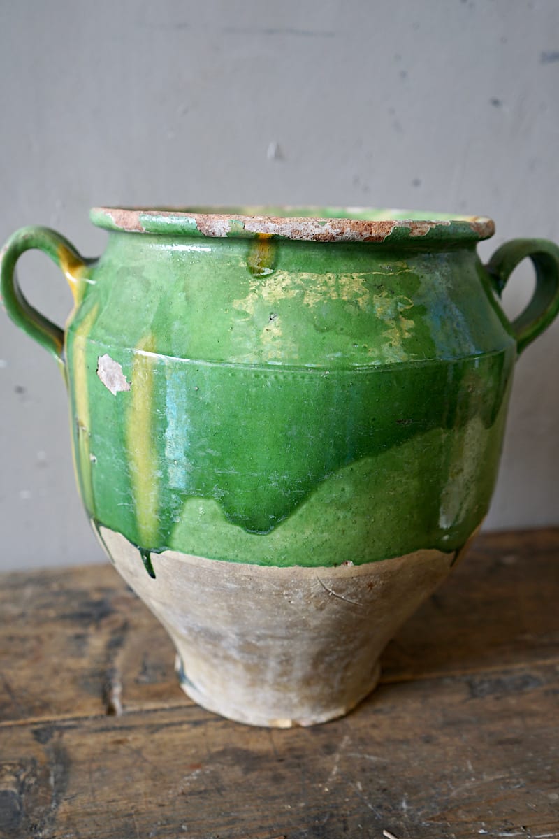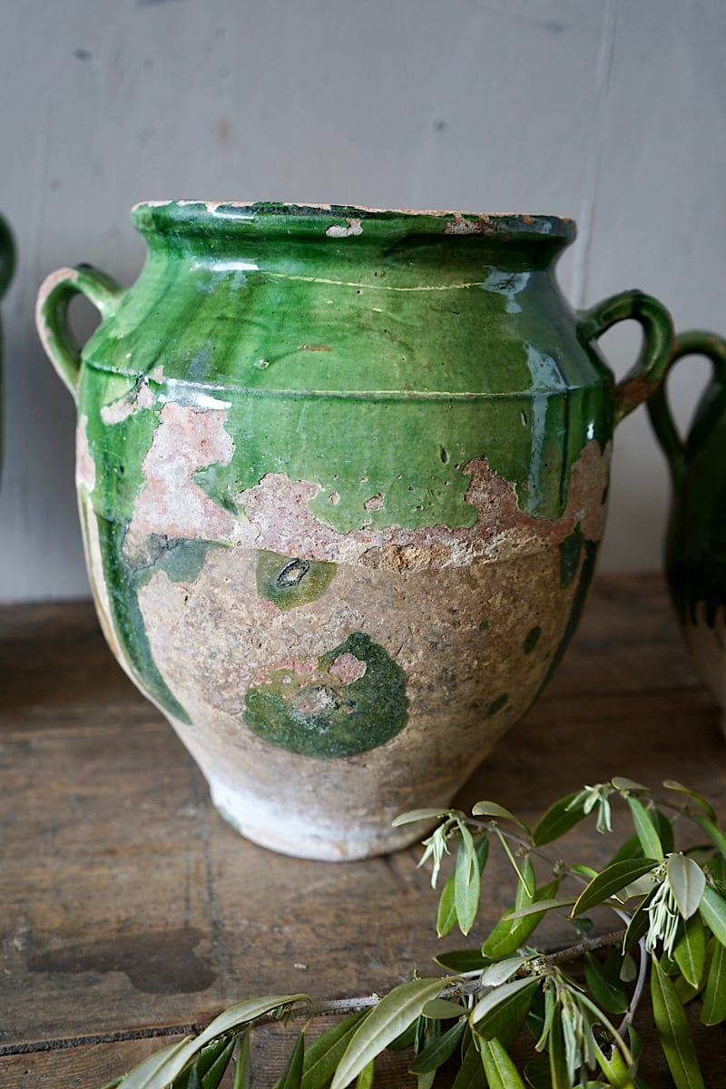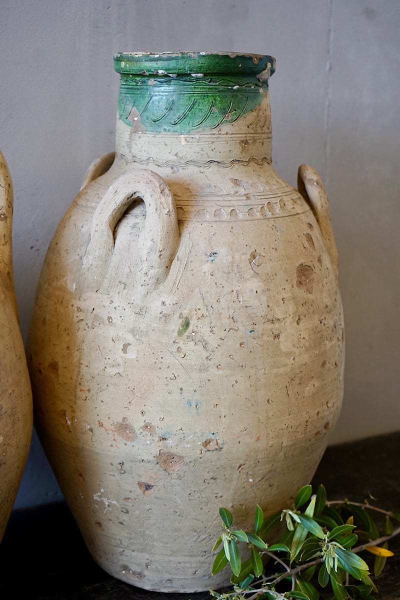 Two provincial, green glazed terracotta water jugs from southwest France. These were made for workers to take into the field to drink water from. Hence the small glazed spout. Rare shape and colour. Beautiful as a pair. Priced and sold separately.