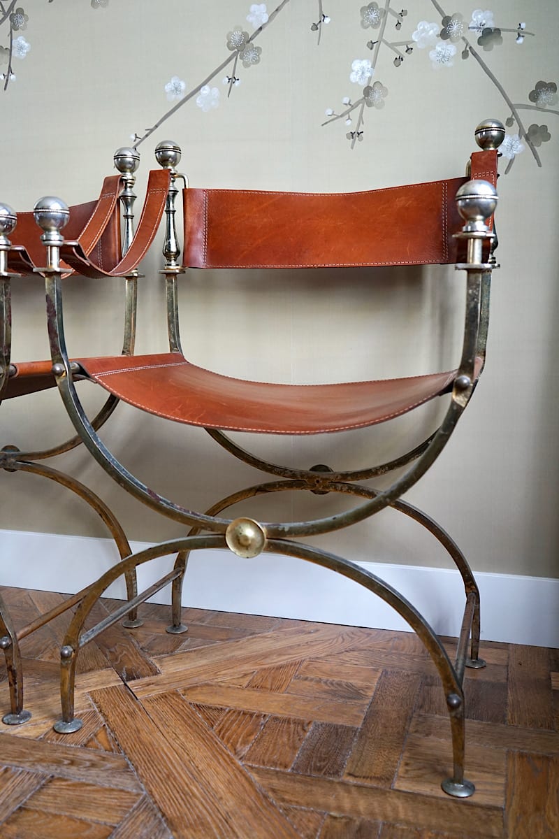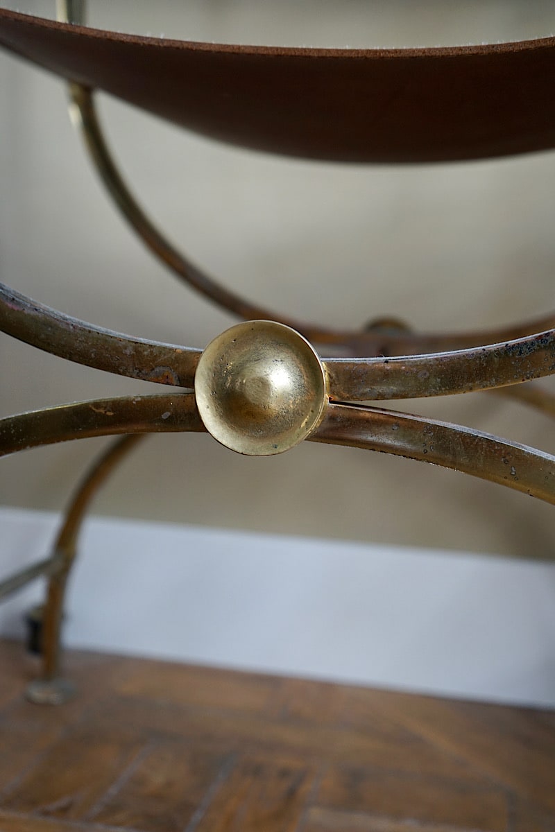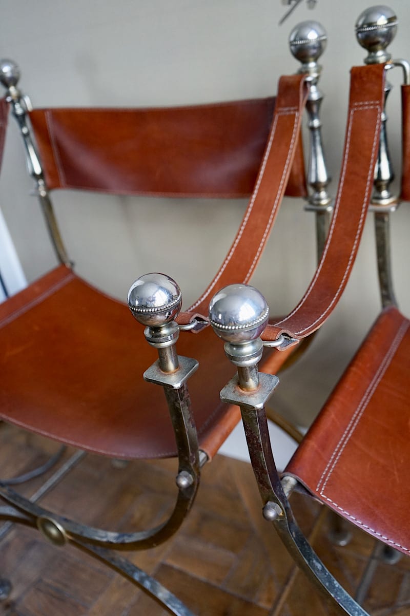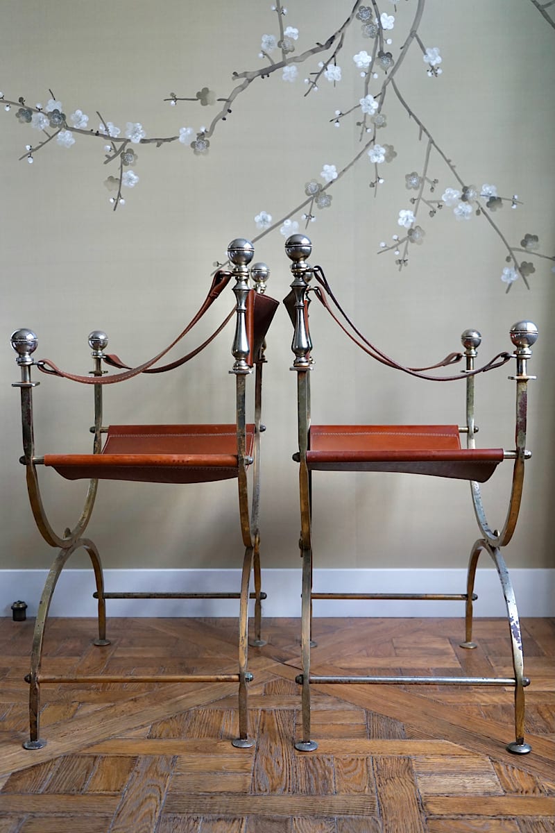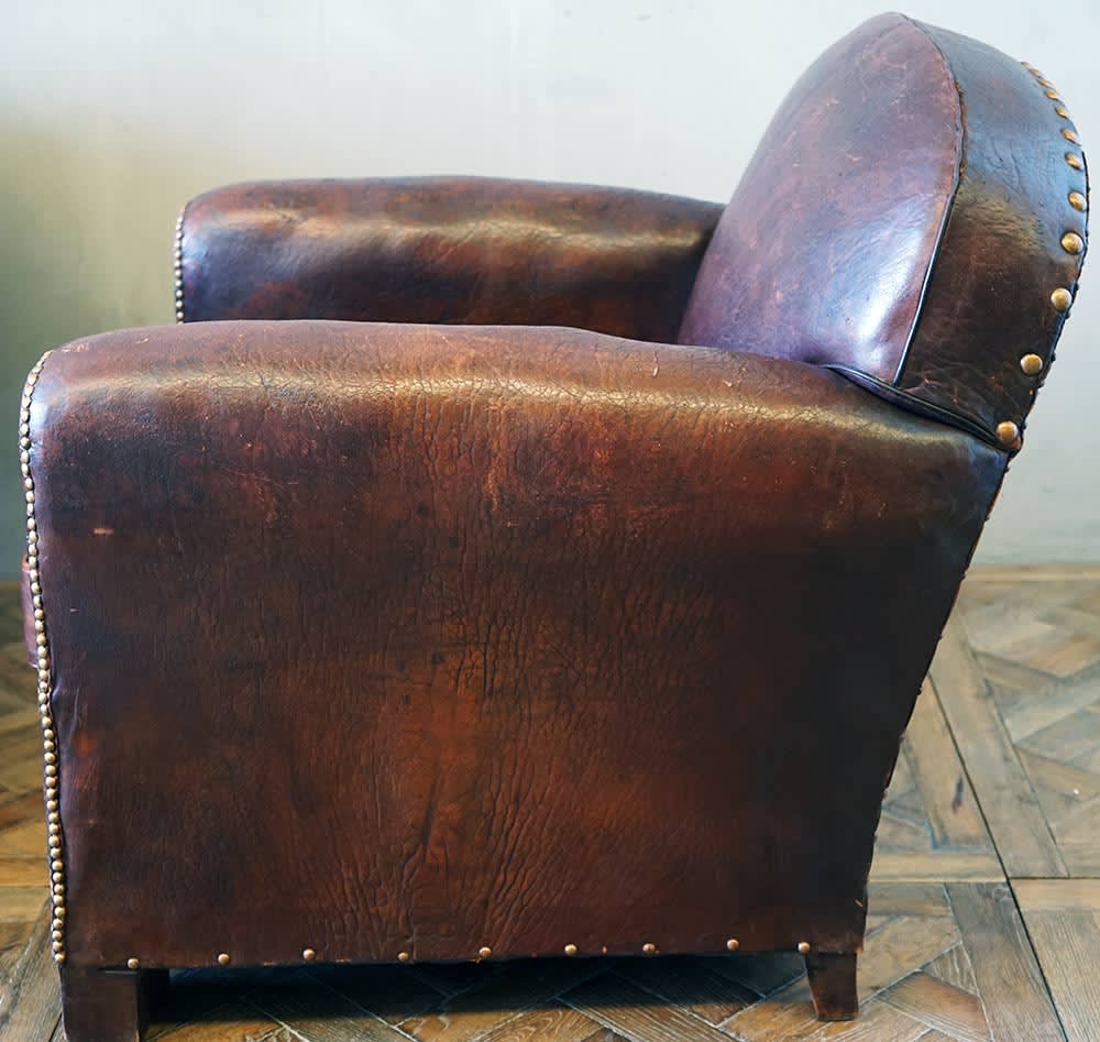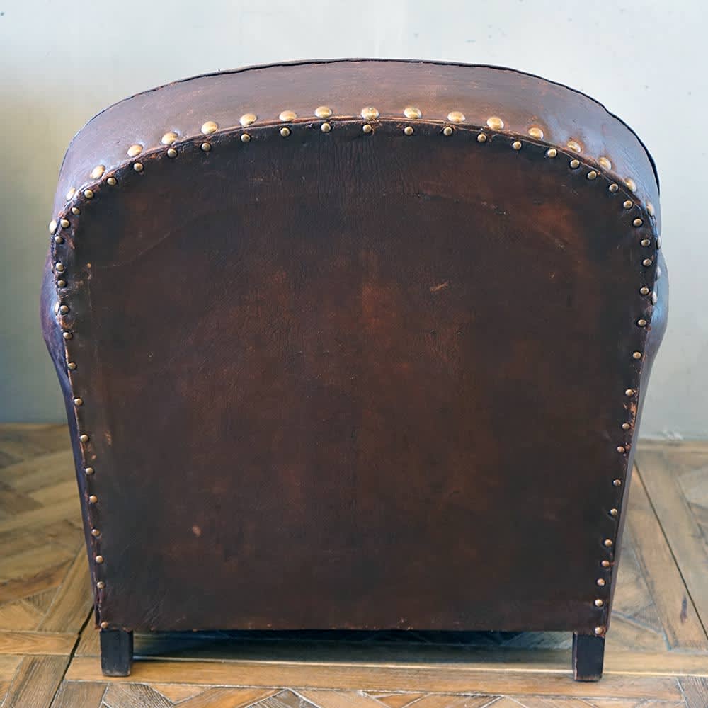 A pair of leather club chairs in good condition. Chocolate brown leather with excellent patina and large brass dome studs, raised on wooden feet. (Sold as a pair.)