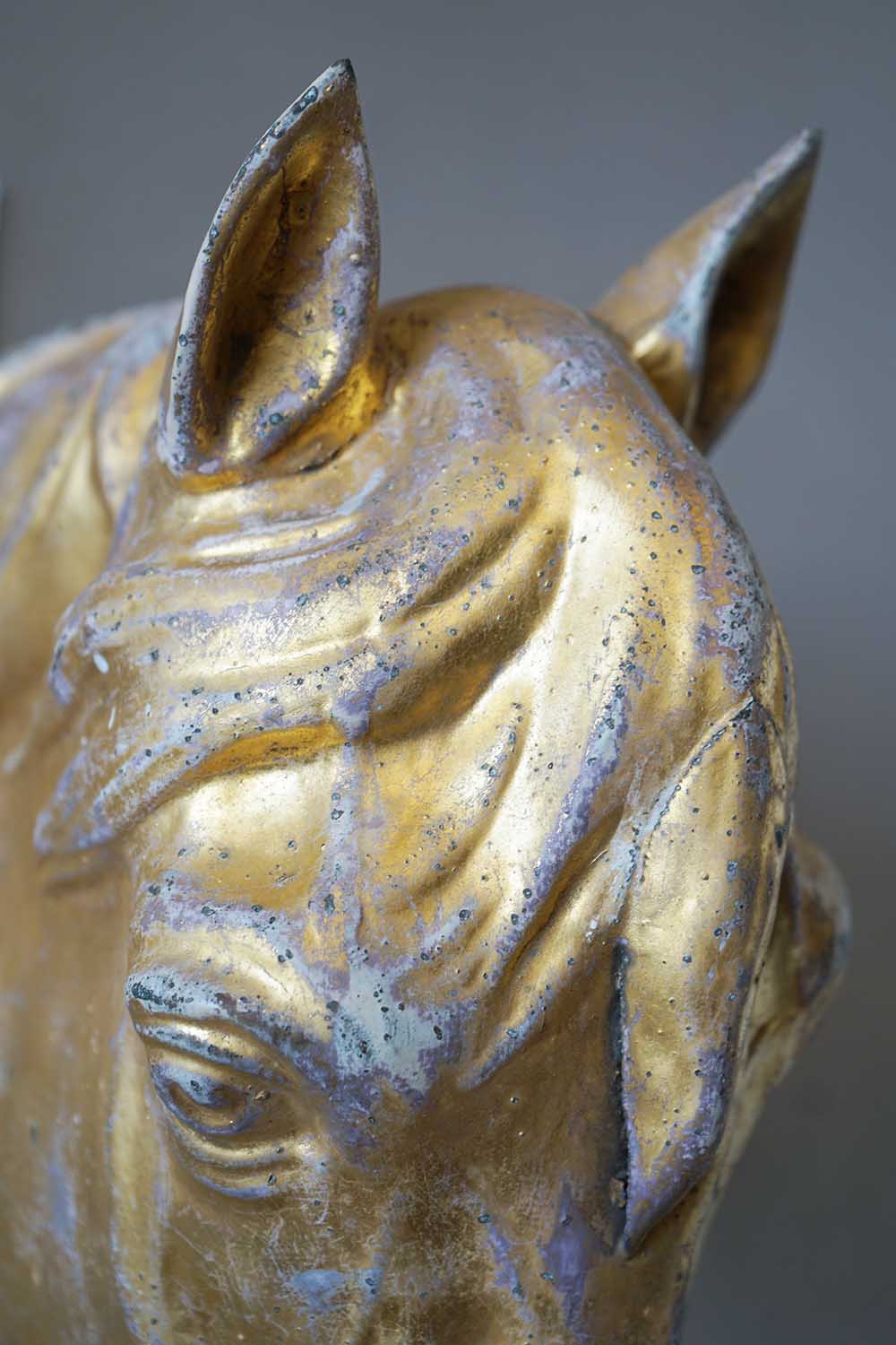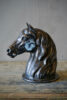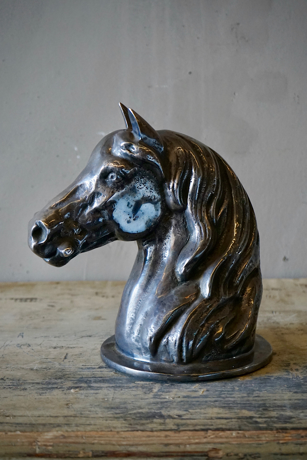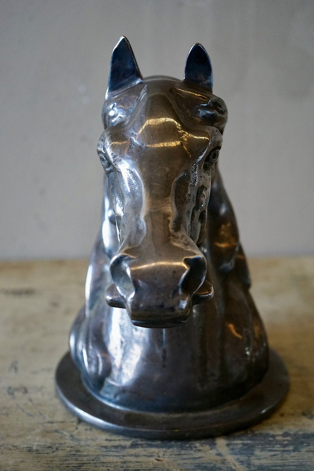 A rare cast bronze horse head sculpture with silver plating showing good patina.