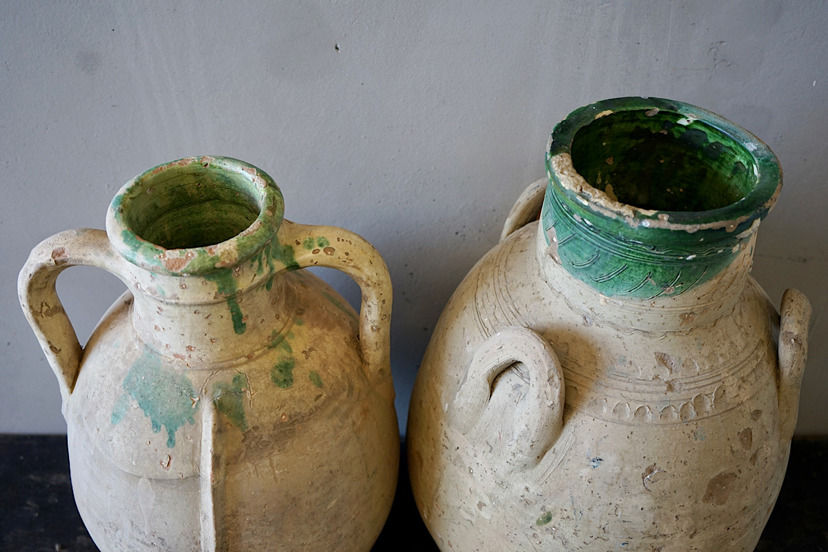 Two rustic Italian terracotta olive oil jars with touches of green glaze. Both with handles and spout. Sold separately.