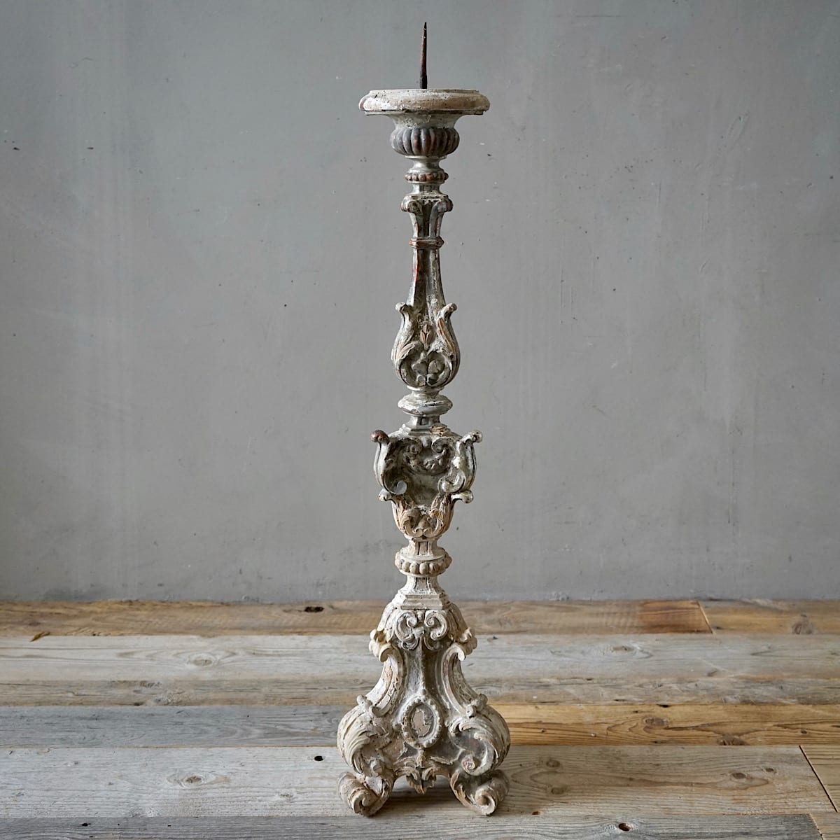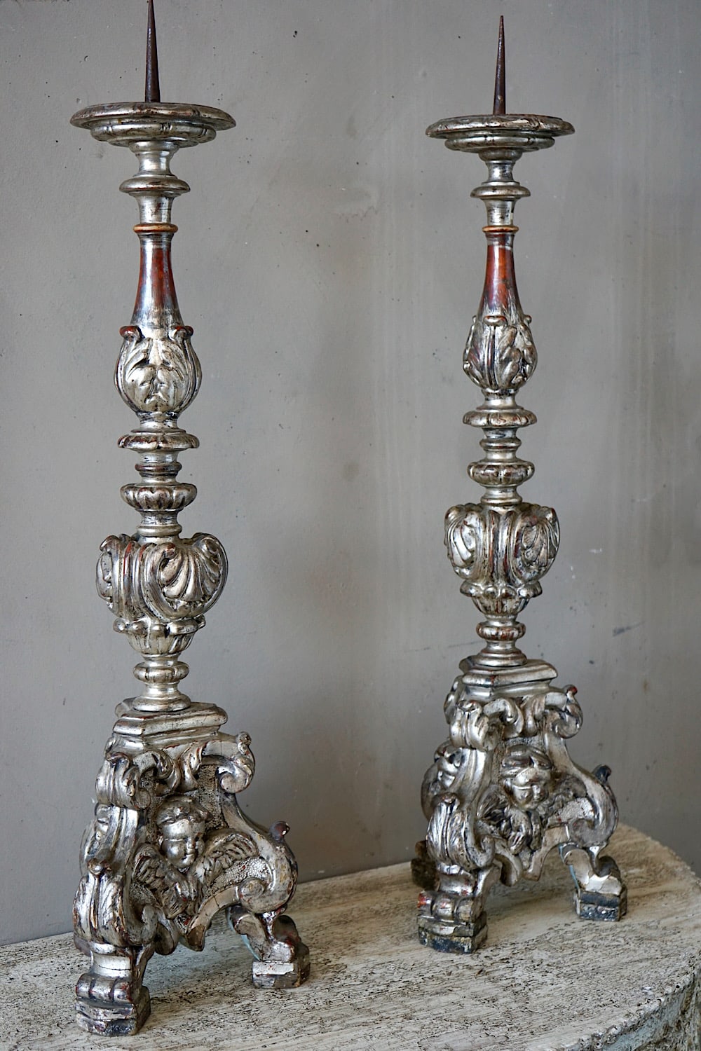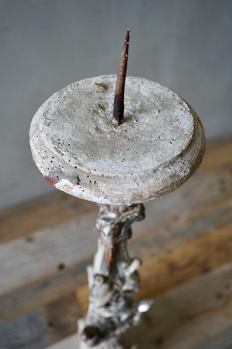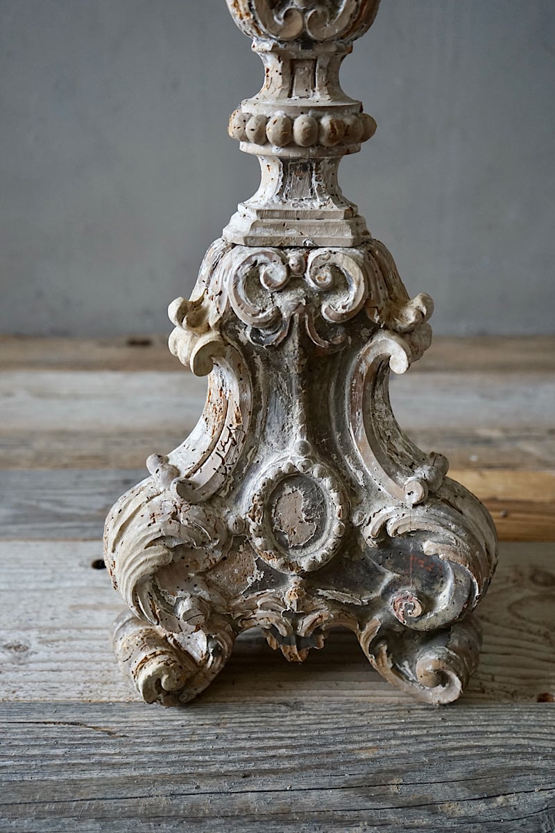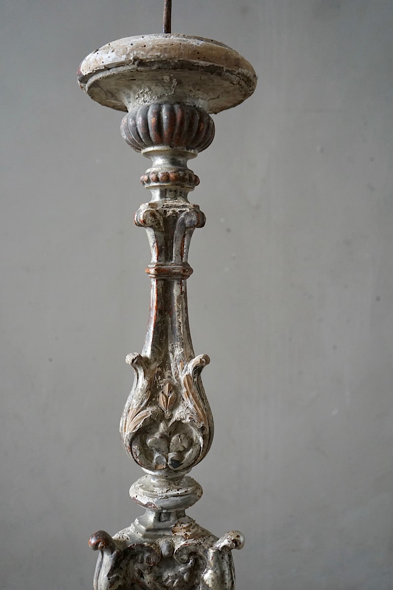 A pair of Italian rococo carved limewood ‘torcheres’ (candlesticks) with their original silvering and pale blue paint. Stepped baluster form with carved scrolling detail, raised on scroll feet. Lovely decorative examples in very good original condition. Priced and sold as a pair.