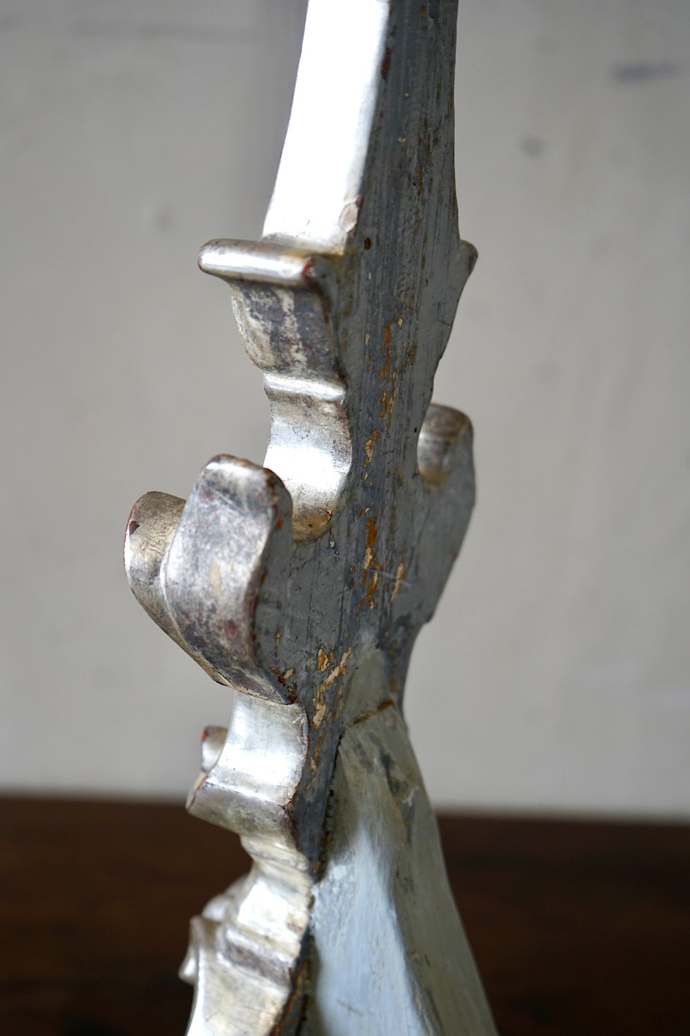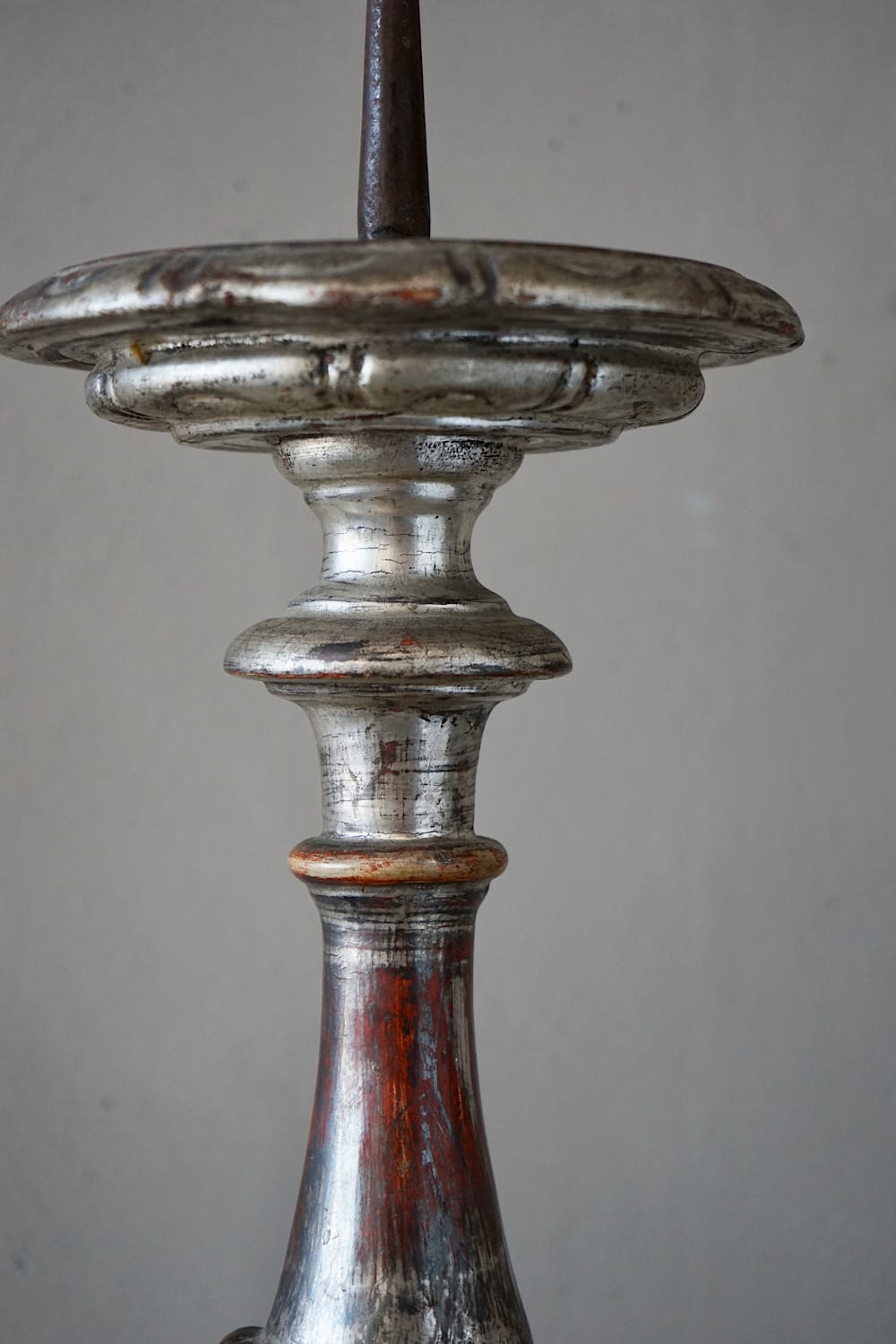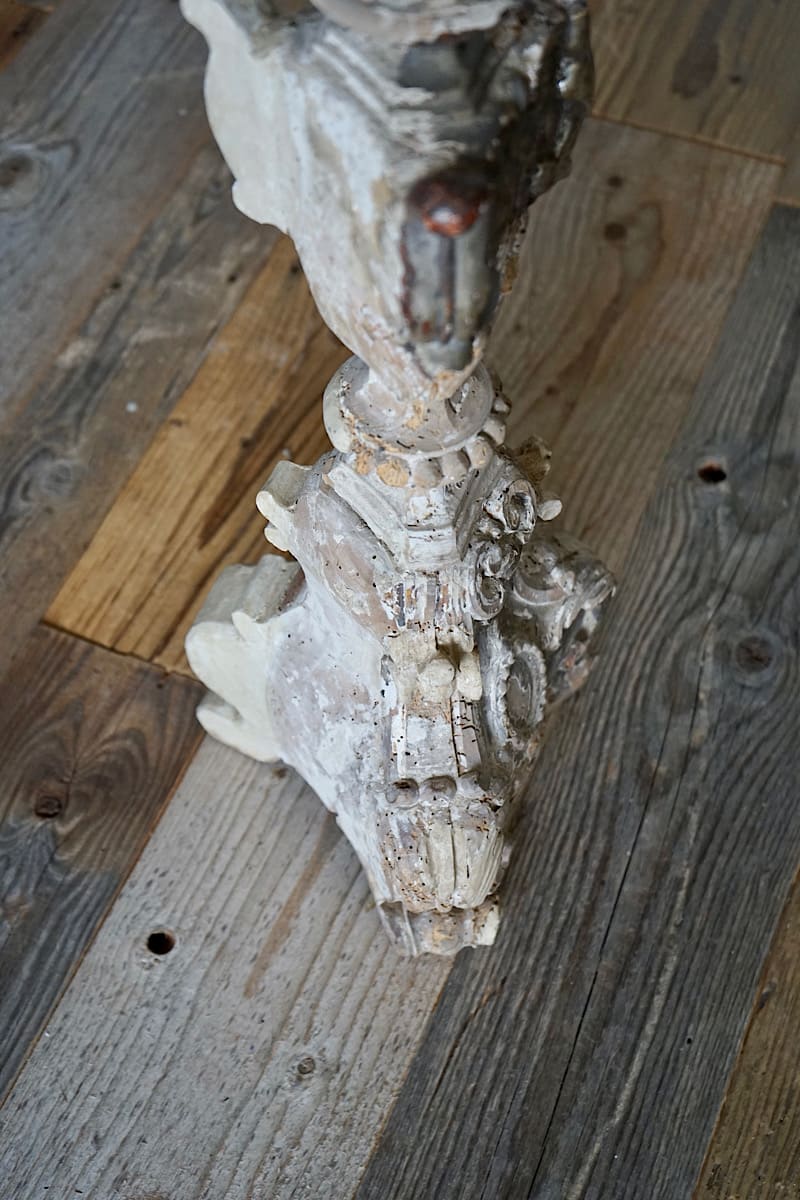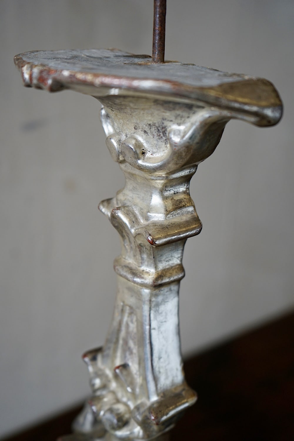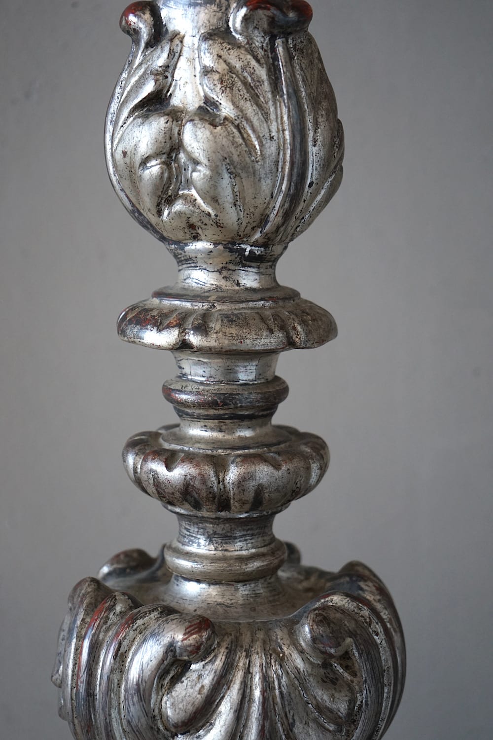 A pair of Italian rococo carved limewood ‘torcheres’ (candlesticks) with their original silvering and pale blue paint. Stepped baluster form with carved scrolling detail, raised on scroll feet. Lovely decorative examples in very good original condition. Priced and sold as a pair.