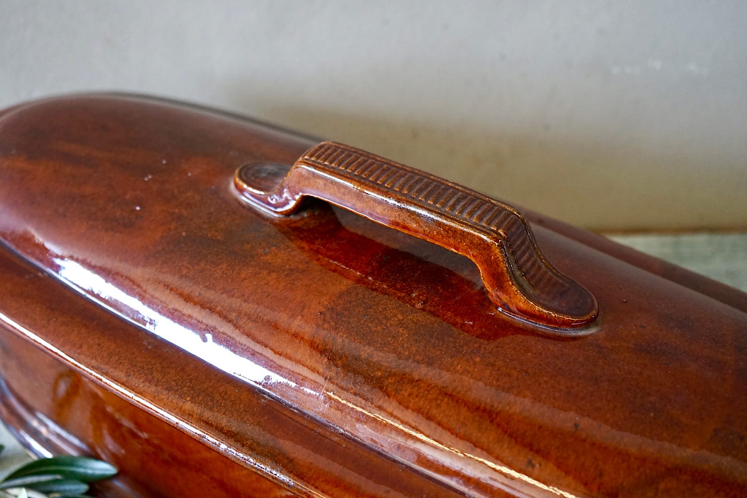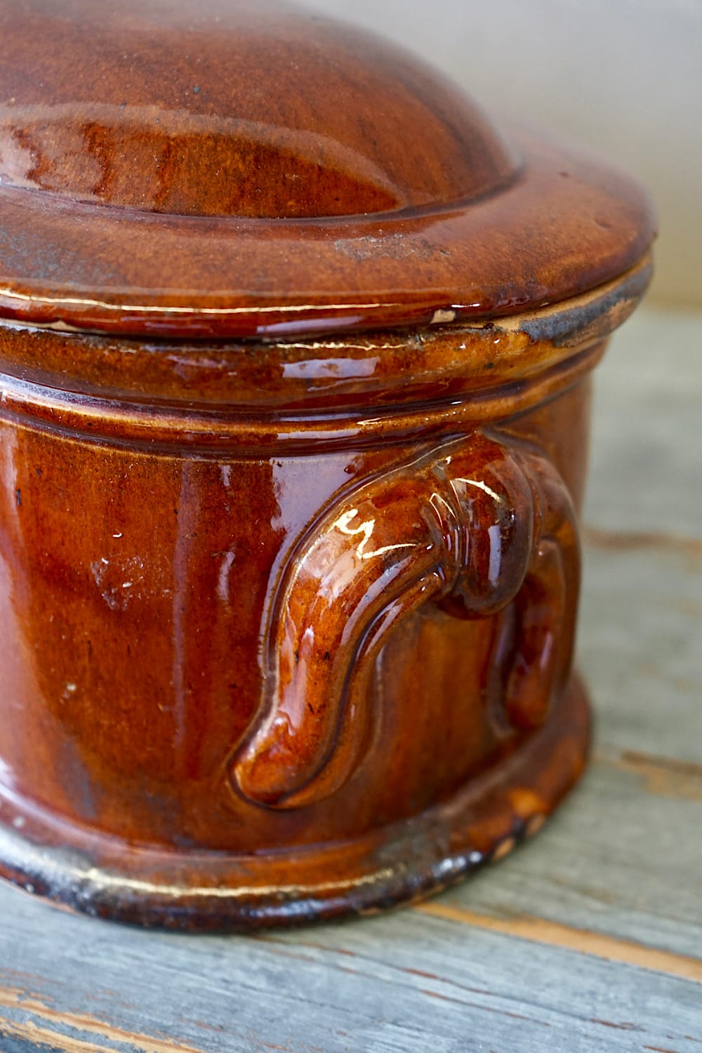 A spectacular glazed earthenware terrine, with lid. One of the biggest, most impressive examples we’ve ever seen, and in perfect condition! Wonderful kitchen decoration.