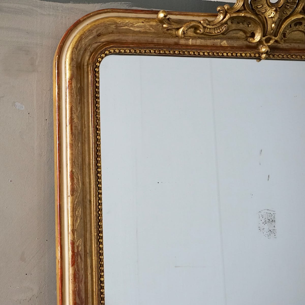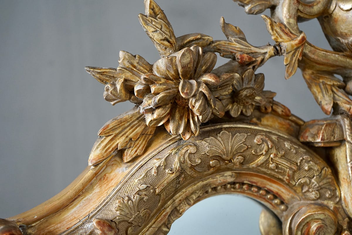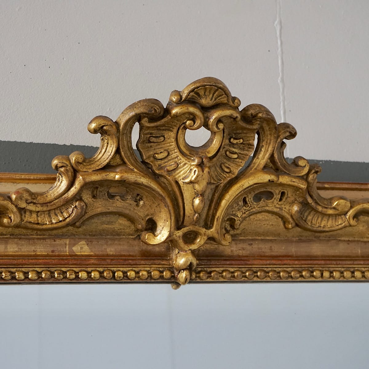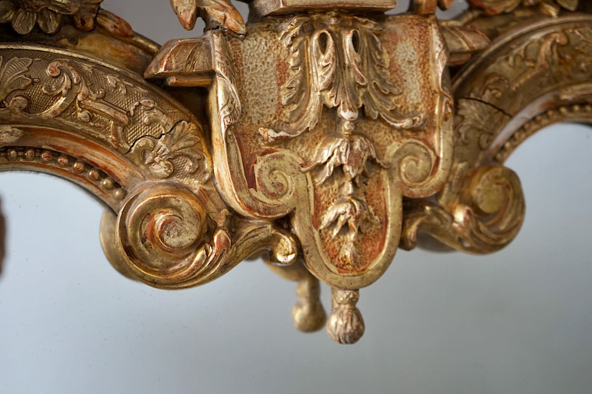 A particularly fine Regence-style mirror with its original gilding showing lovely patina. Fine baroque detail with a scrolling pediment and decorated frame. A real statement piece.