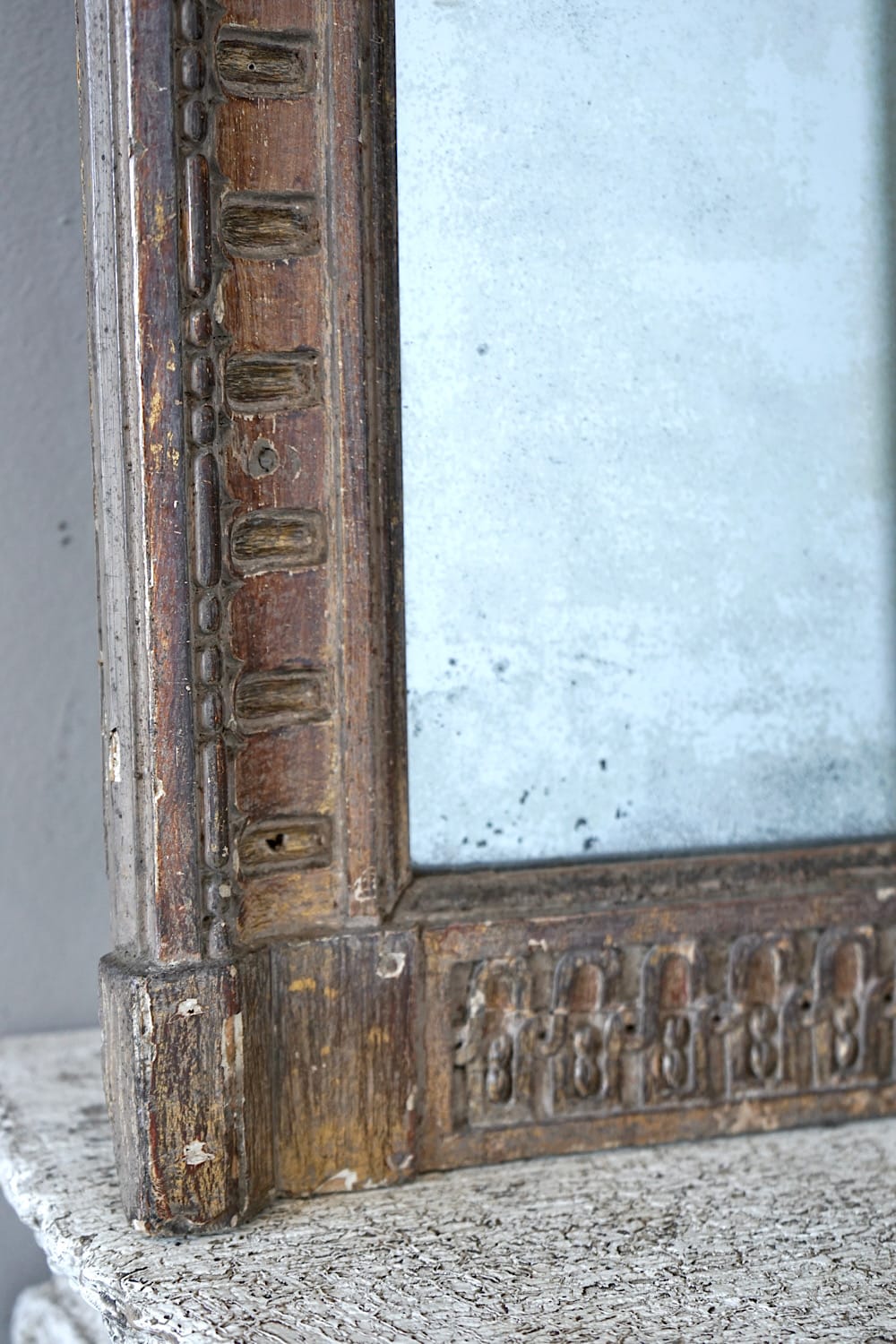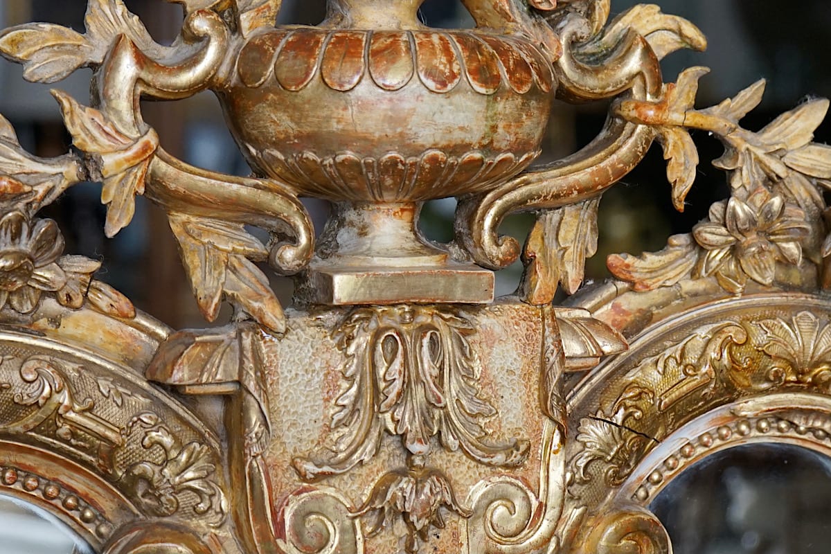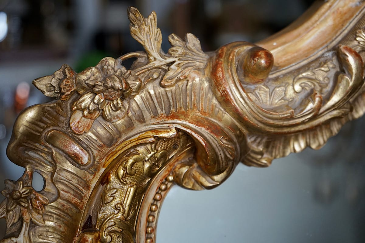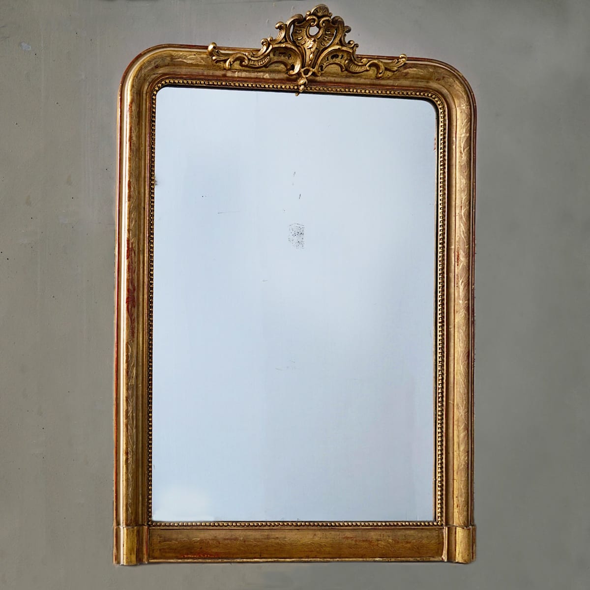 A particularly fine Regence-style mirror with its original gilding showing lovely patina. Fine baroque detail with a scrolling pediment and decorated frame. A real statement piece.