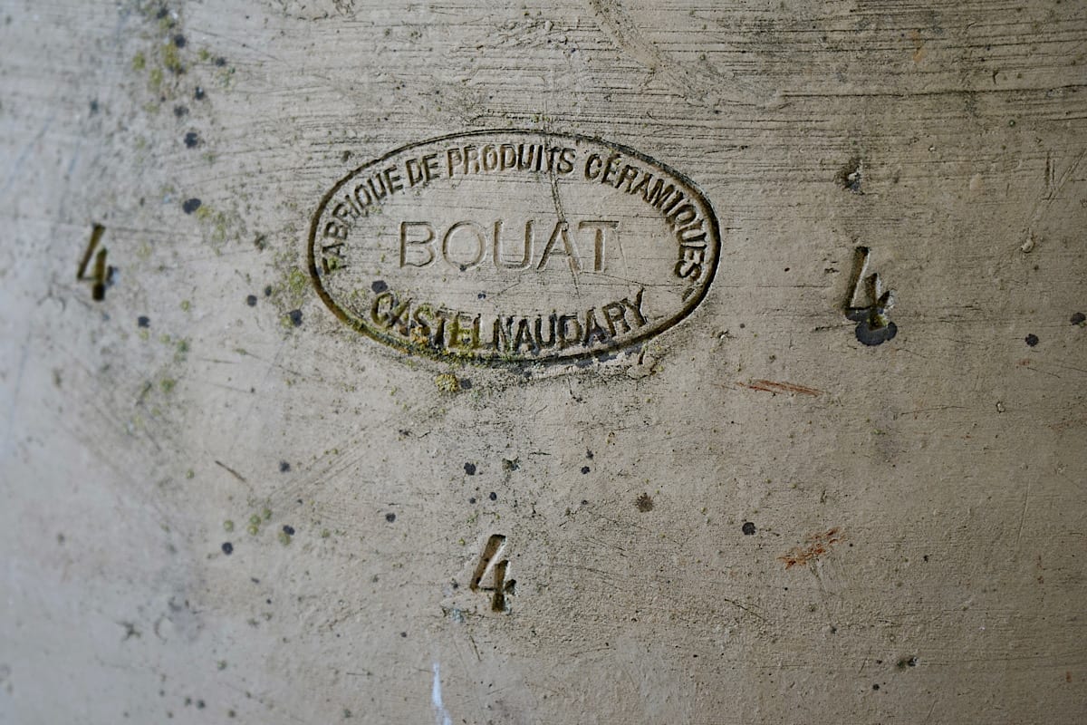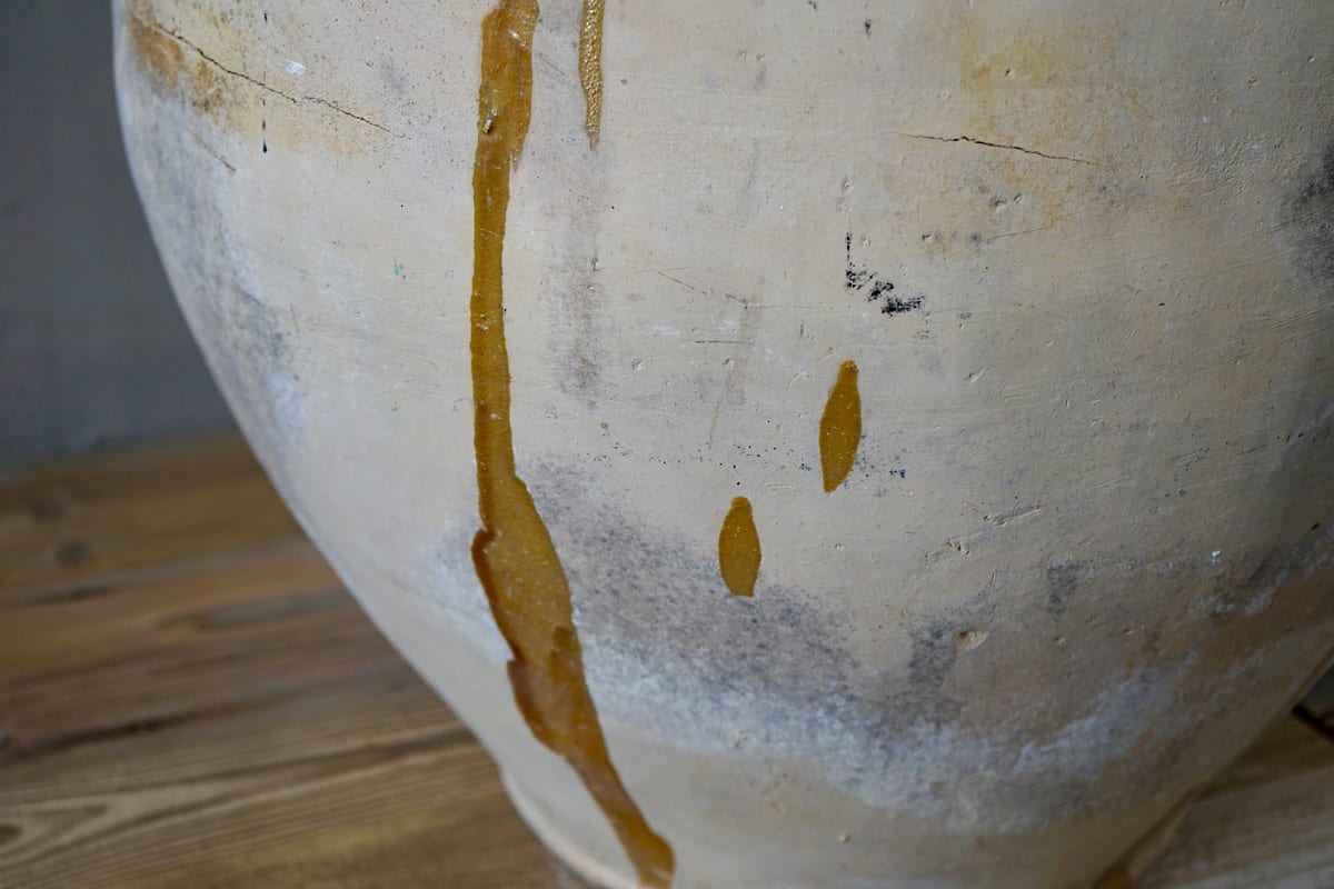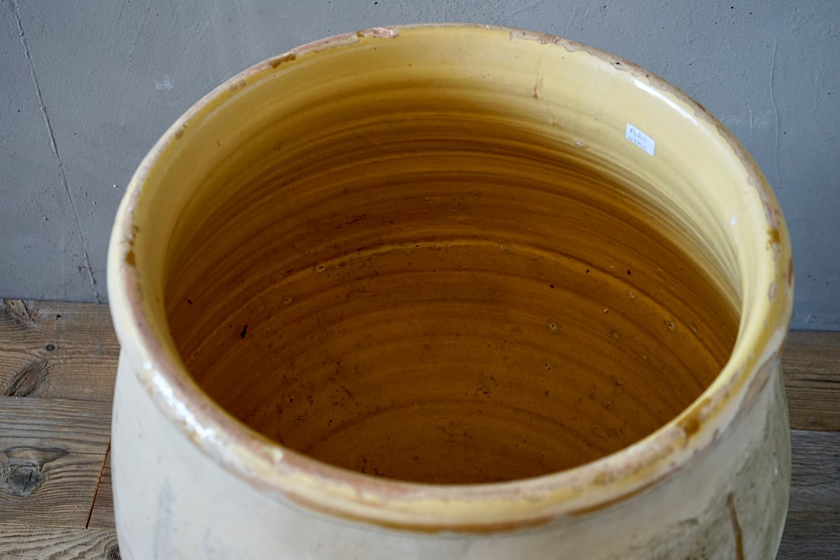 A large terracotta olive oil jar from Castelnaudary in southwest France. Good patina with yellow glazed interior and runs down the outside. Stamped by renowned maker “Bouat”. Rare to find in this size and condition.