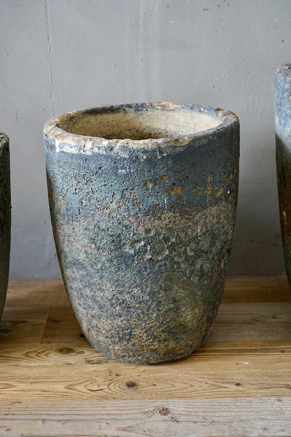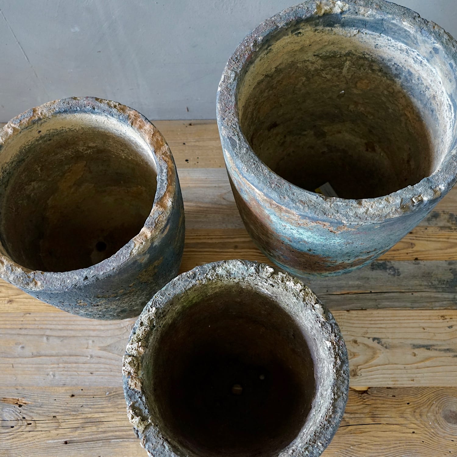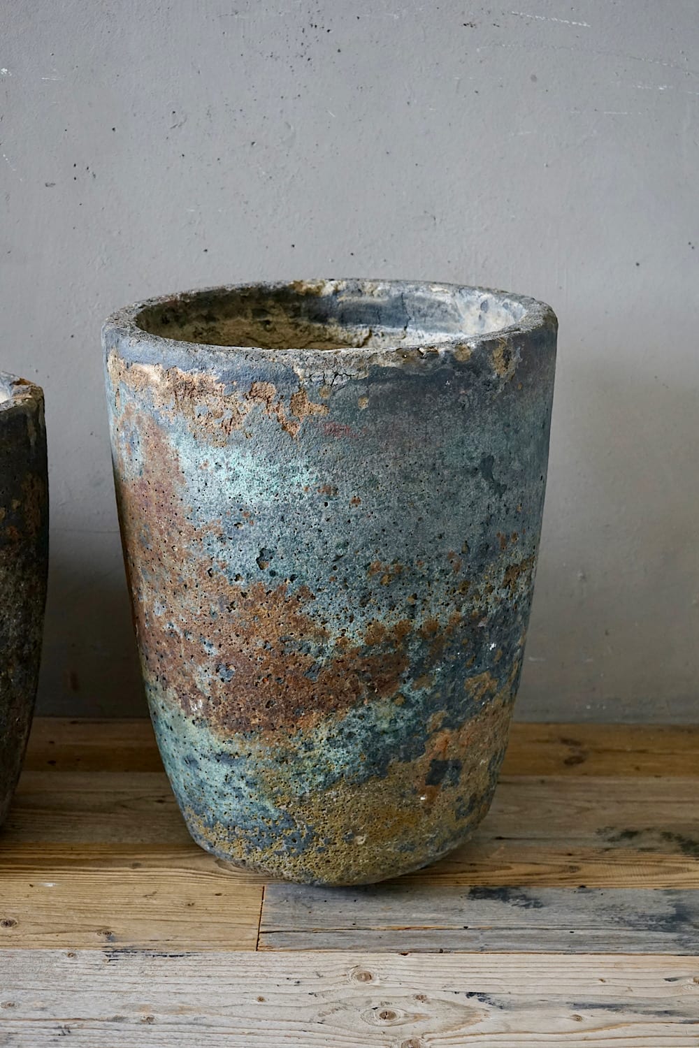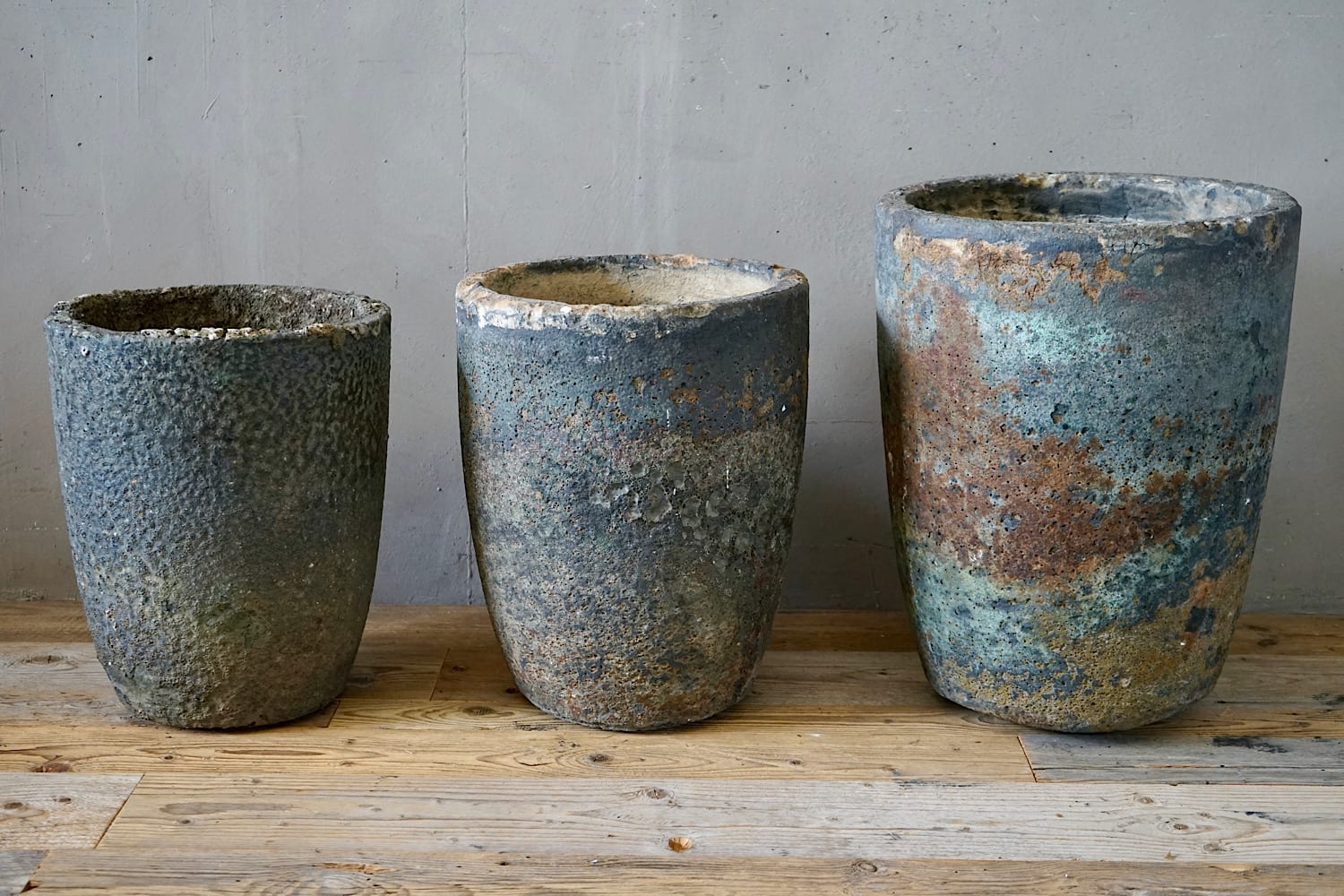 A collection of three large foundry smelting crucibles. Fantastic natural patina with beautiful organic colours. Each drilled at the base for use as planters. Perfect indoors or outdoors. Priced and sold separately: