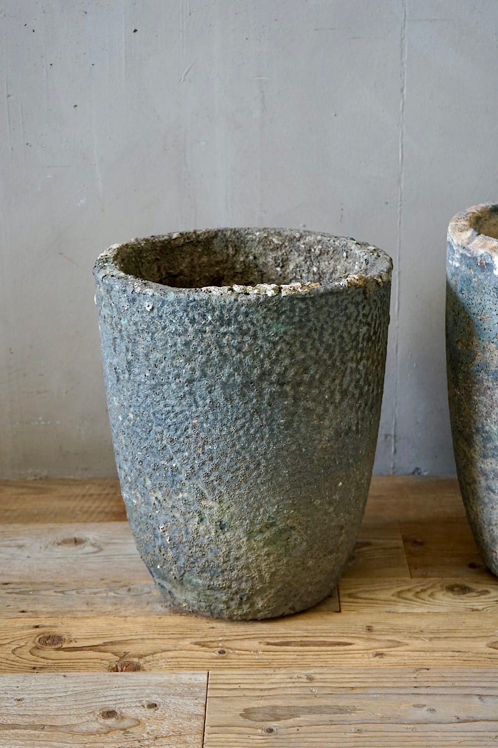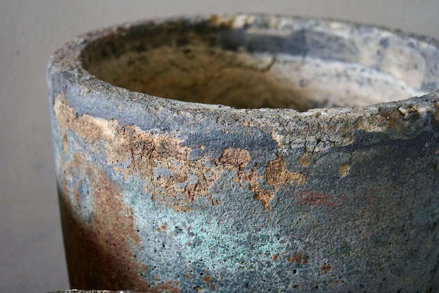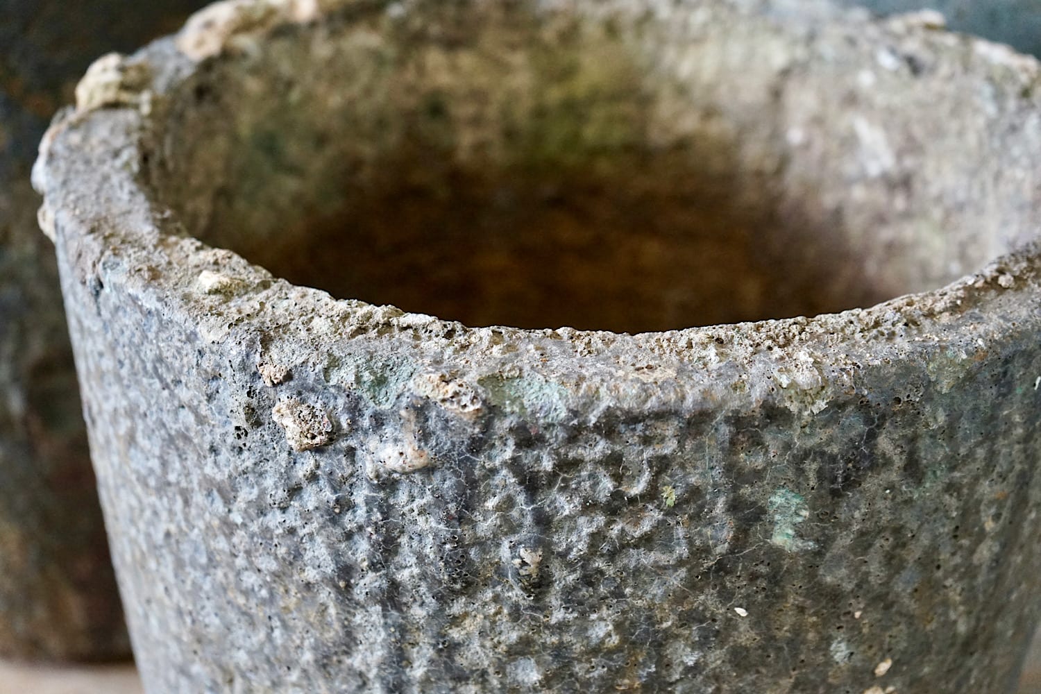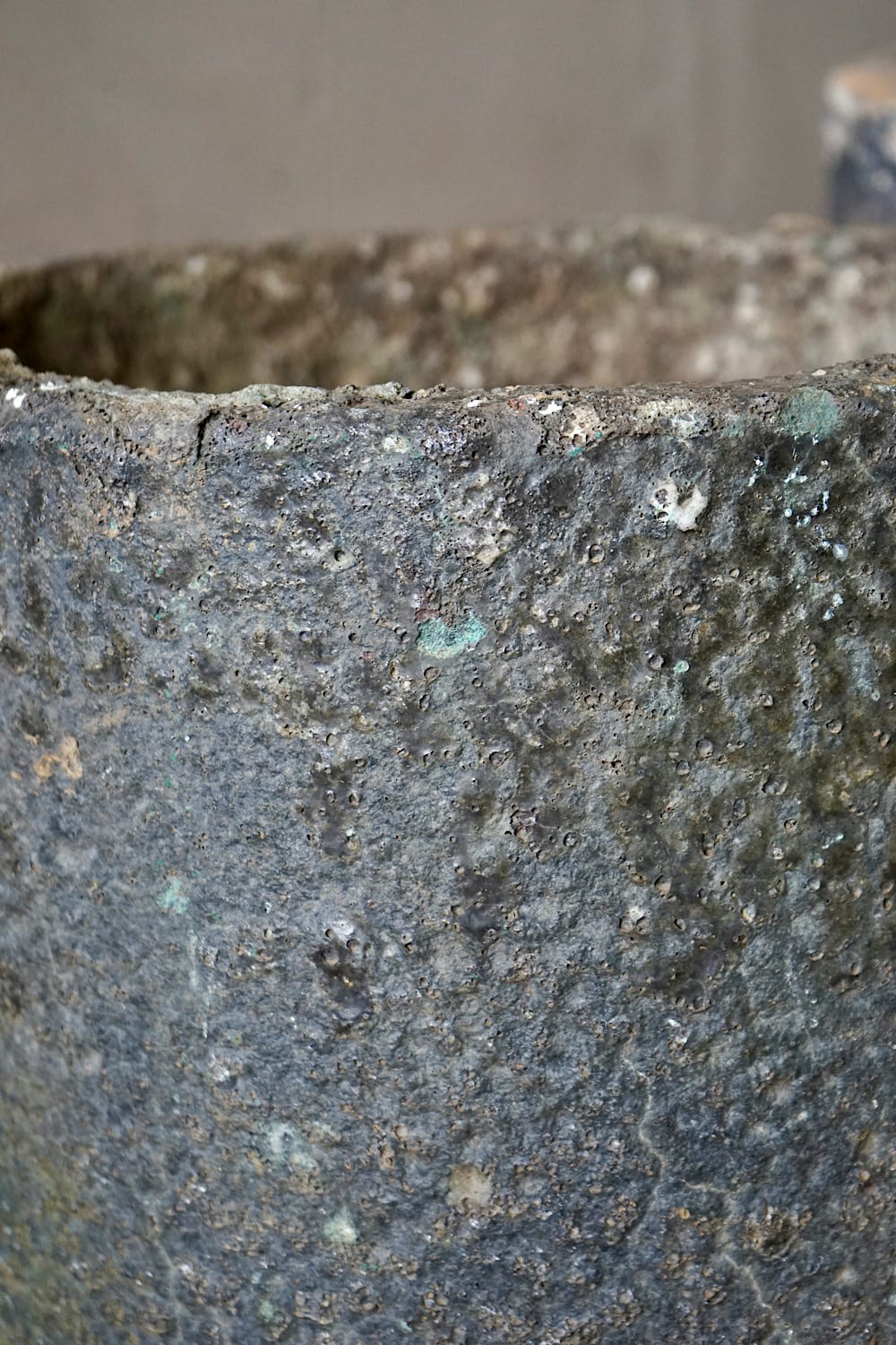 A collection of three large foundry smelting crucibles. Fantastic natural patina with beautiful organic colours. Each drilled at the base for use as planters. Perfect indoors or outdoors. Priced and sold separately: