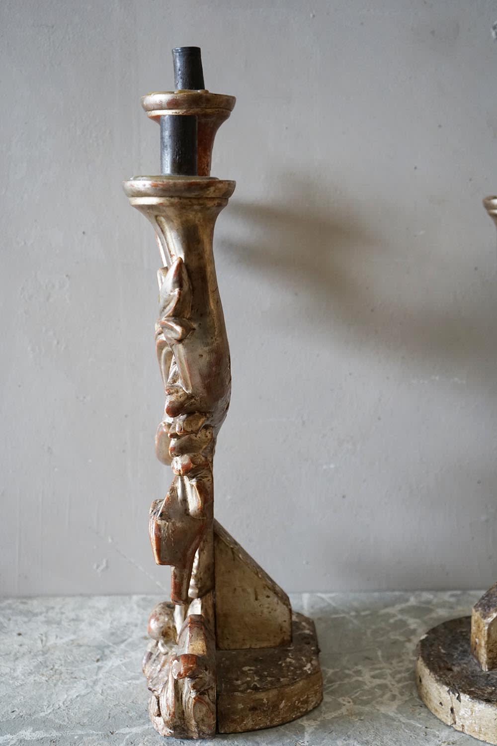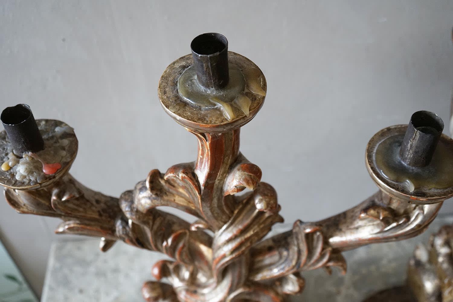 An exceptional pair of Italian carved limewood candlesticks in the form of scrolling acanthus leaves. Original silvering in excellent condition, showing gorgeous patina. Original tin candlestands. Finest pair of these we have ever seen.