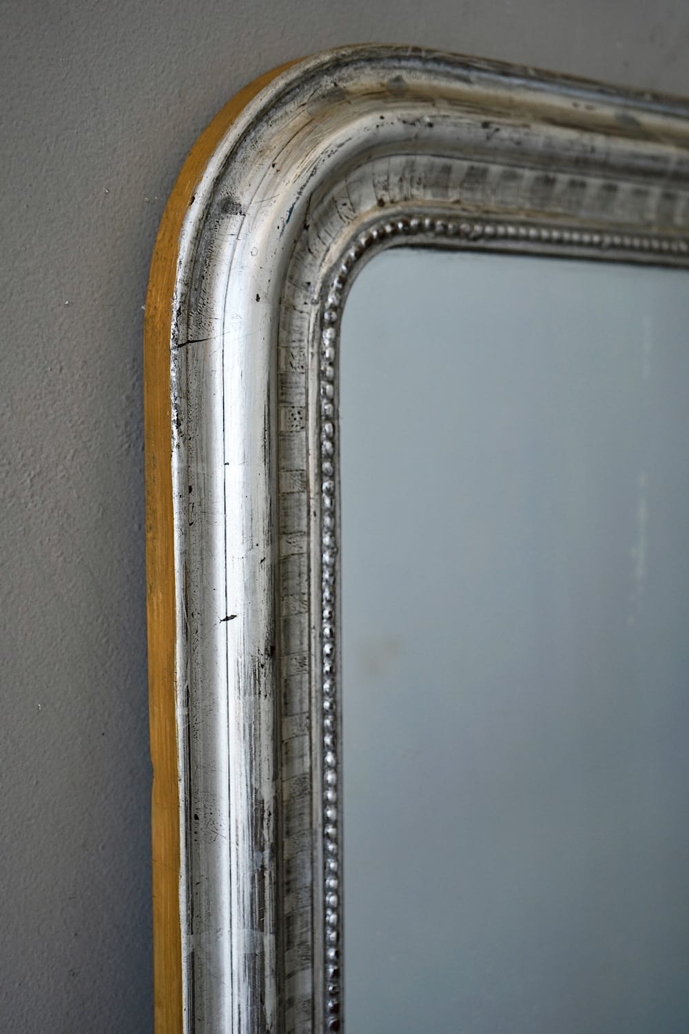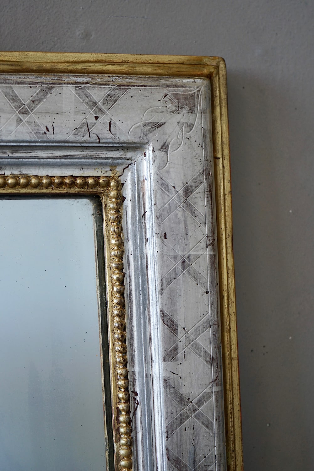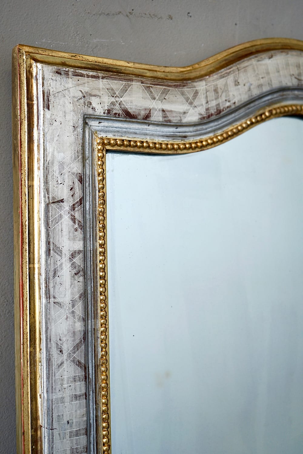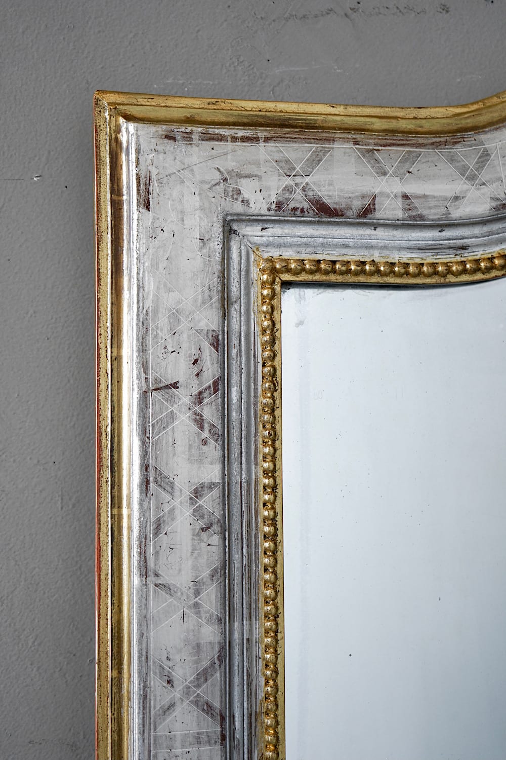 A Louis Philippe period silvered mirror with unusual profile and etched foliage decoration, the silver gilt worn to attractive patina. Original mercury backed glass also with lovely soft patina.