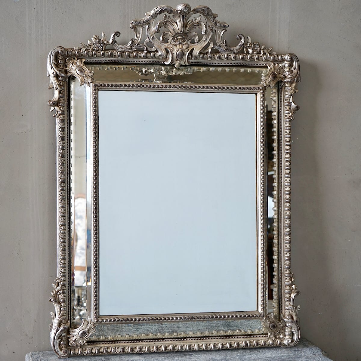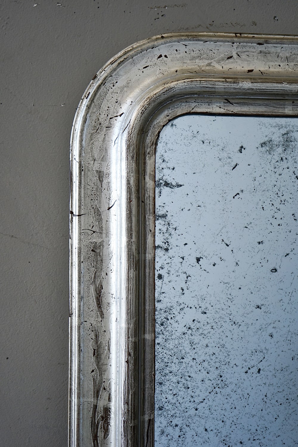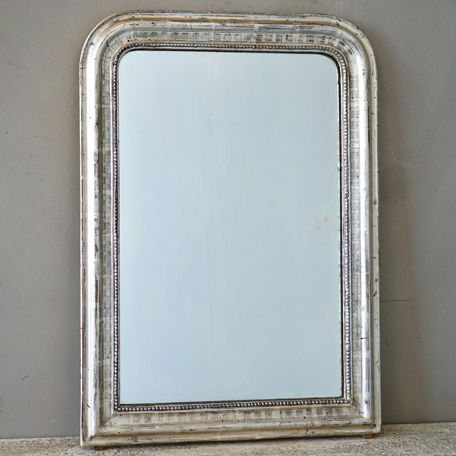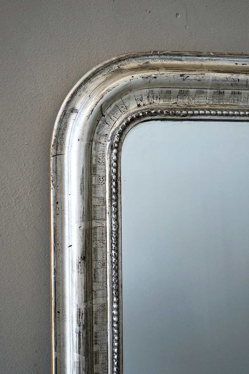 A Louis Philippe period silvered mirror with unusual profile and etched foliage decoration, the silver gilt worn to attractive patina. Original mercury backed glass also with lovely soft patina.