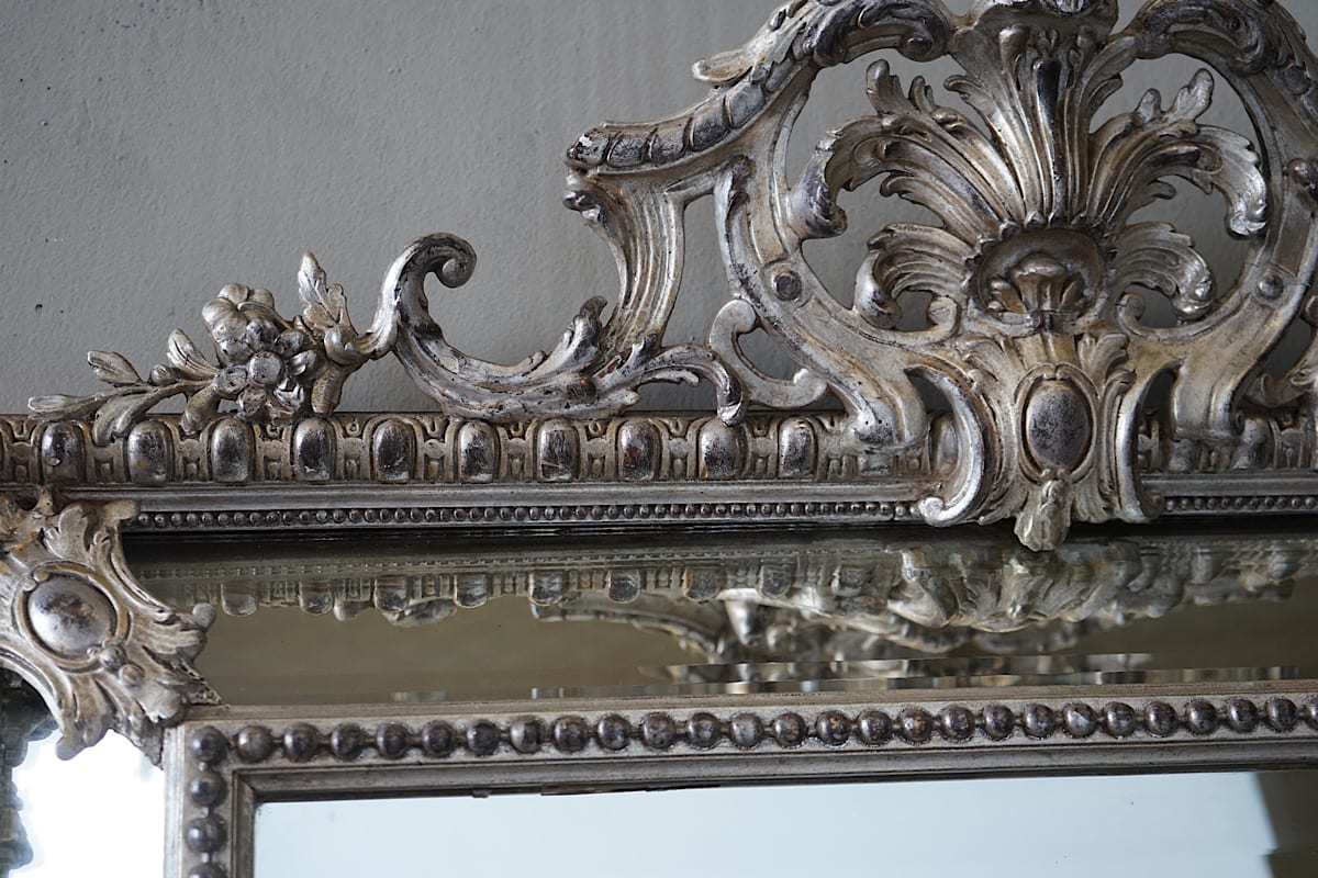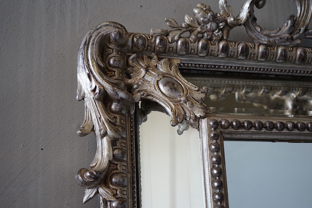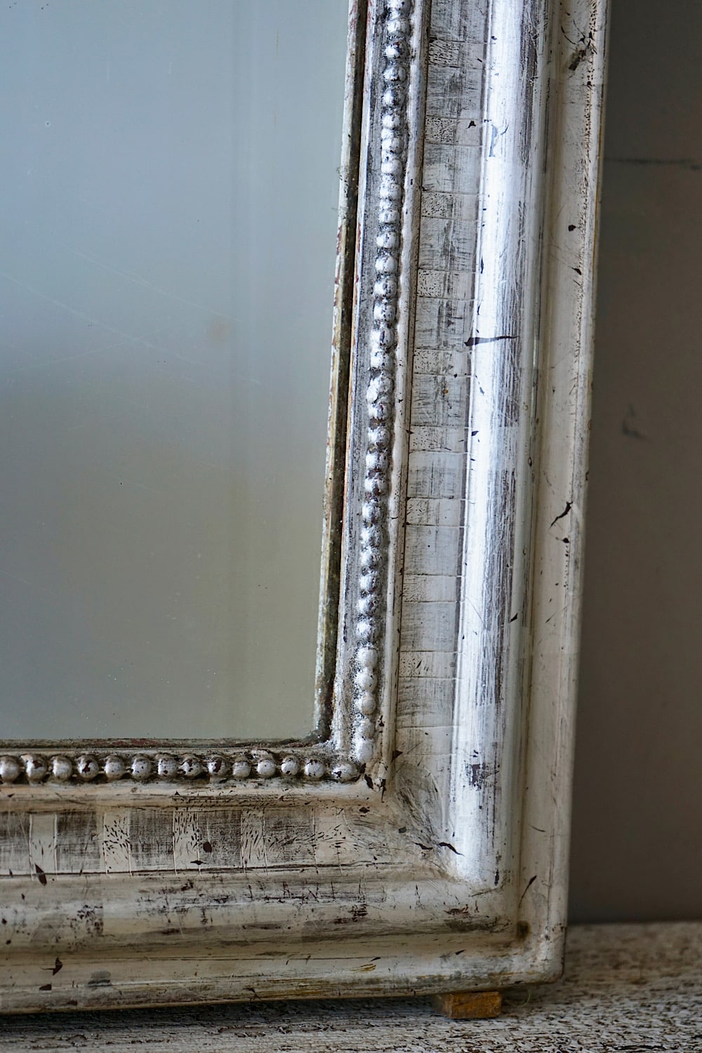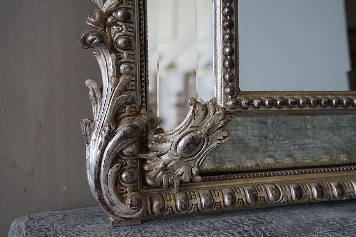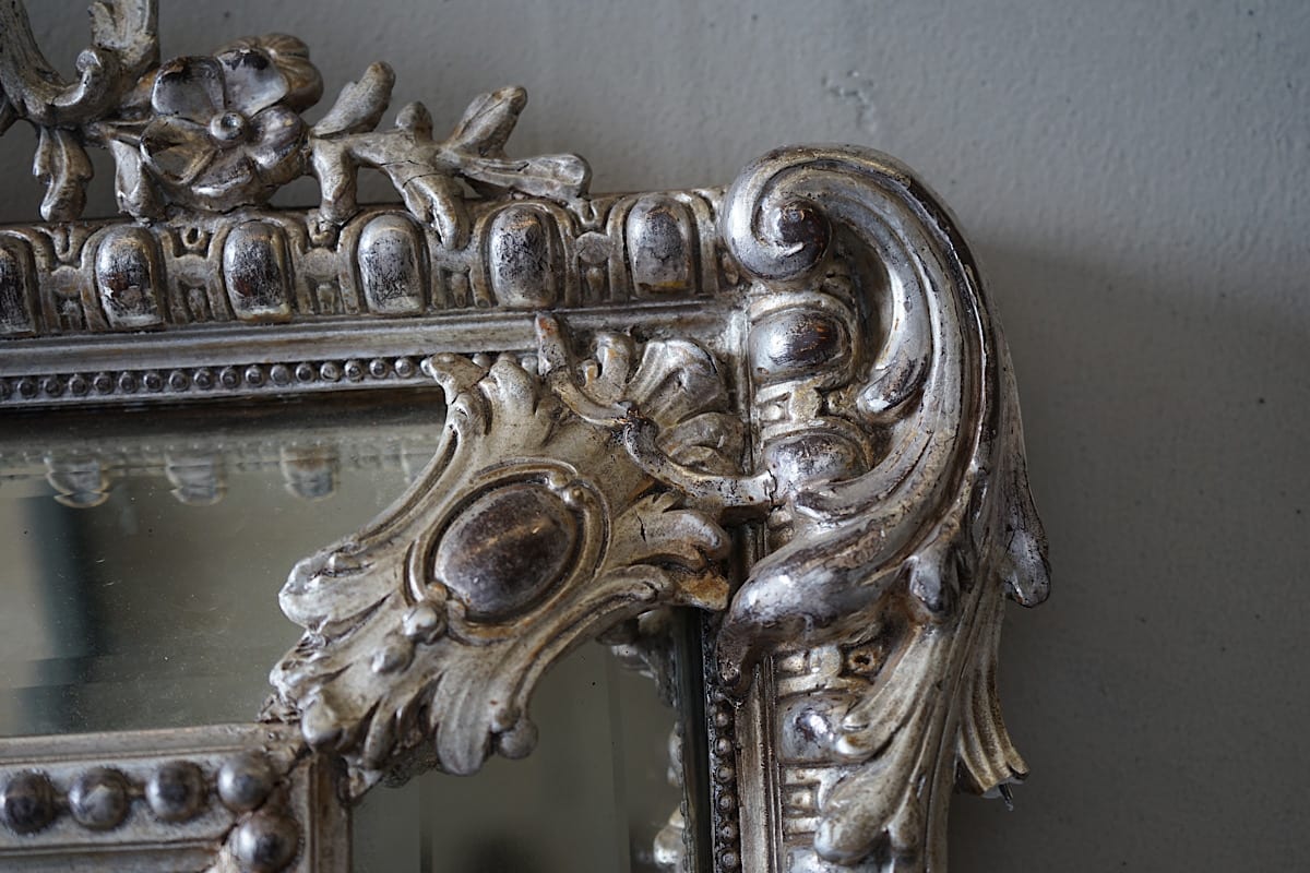 A Louis Philippe period silvered mirror with unusual profile and etched foliage decoration, the silver gilt worn to attractive patina. Original mercury backed glass also with lovely soft patina.