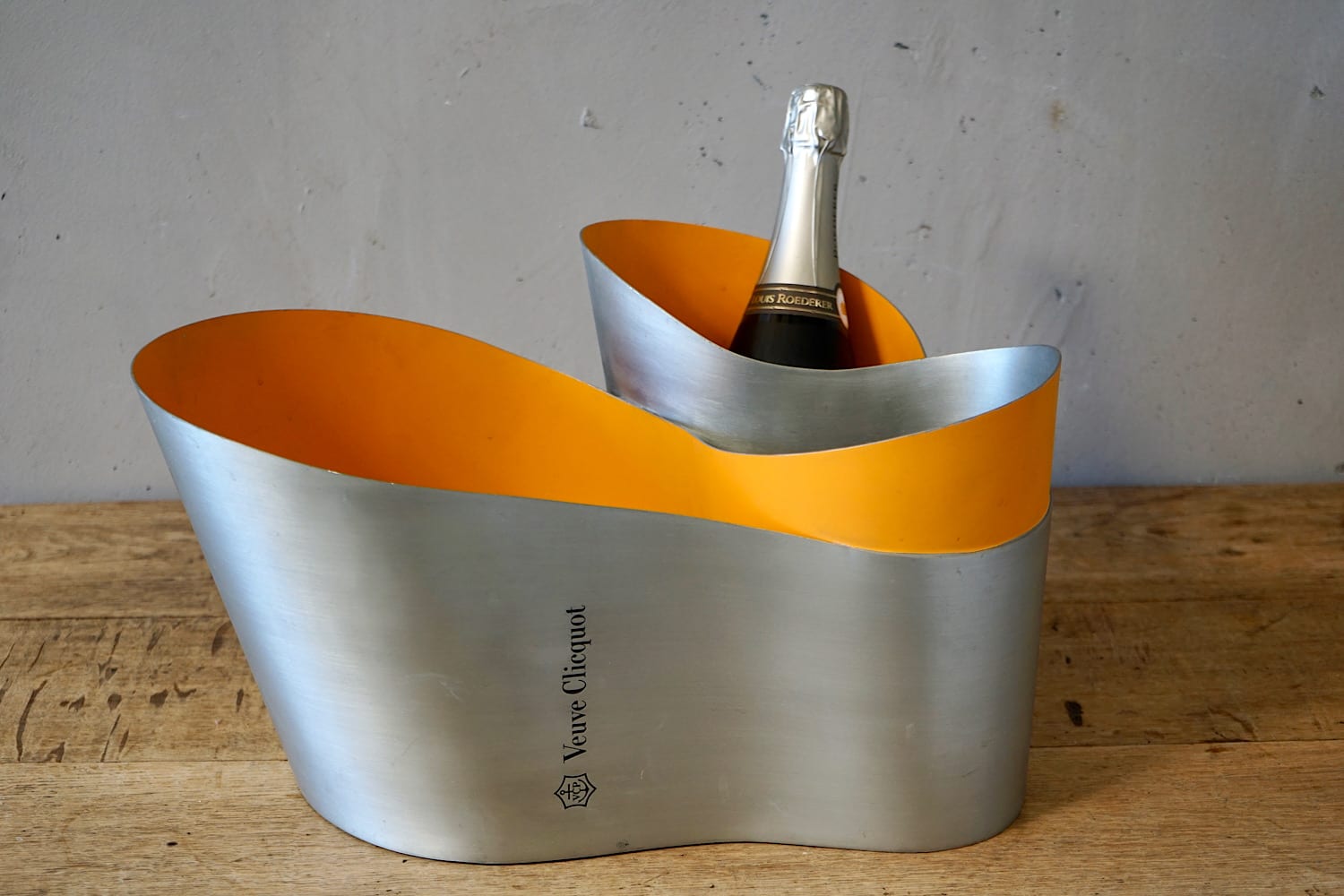 A large pewter Veuve Clicquot champagne bucket in solid pewter with orange interior. The Infinite Wave model, designed by Pablo Reinoso and made by Royal Selangor Pewter. A rare model of very high quality.