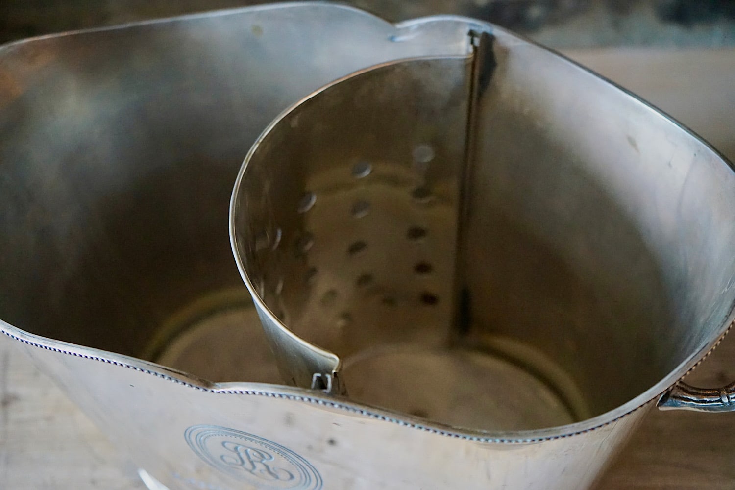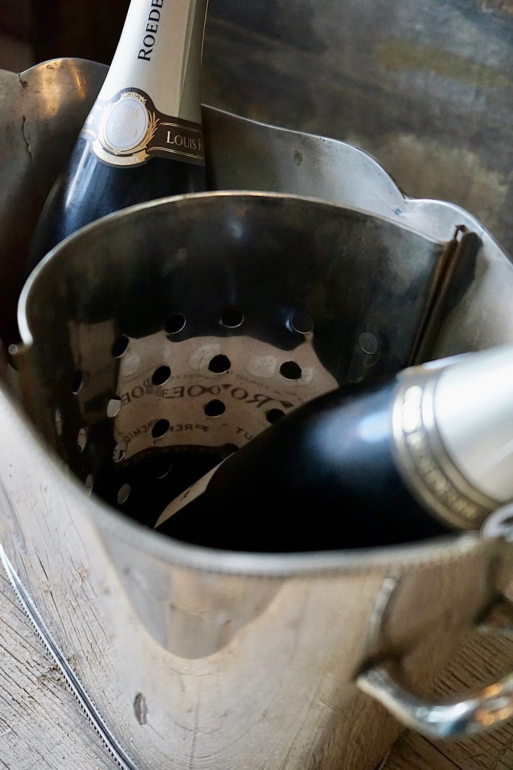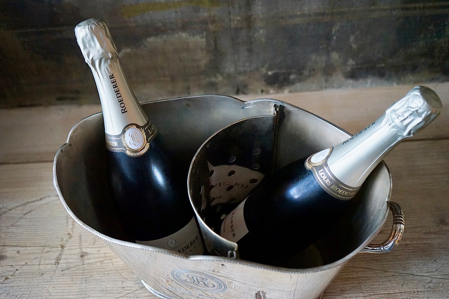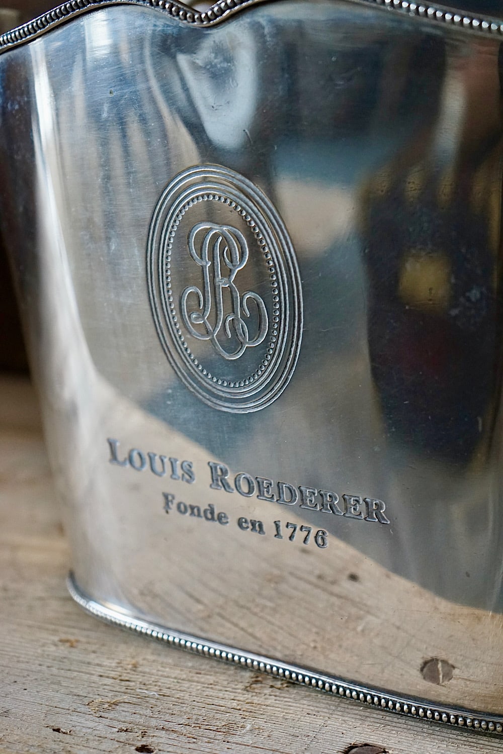A particularly fine quality vintage silver plated brass Louis Roederer champagne bucket. Stamped by James Deakin & Sons, Sheffield. Elegant form with scrolling handles, fine beaded edging and a lift-out pierced bottle separator. A rare model, and one which we’ve never seen before. Silvering in excellent condition.